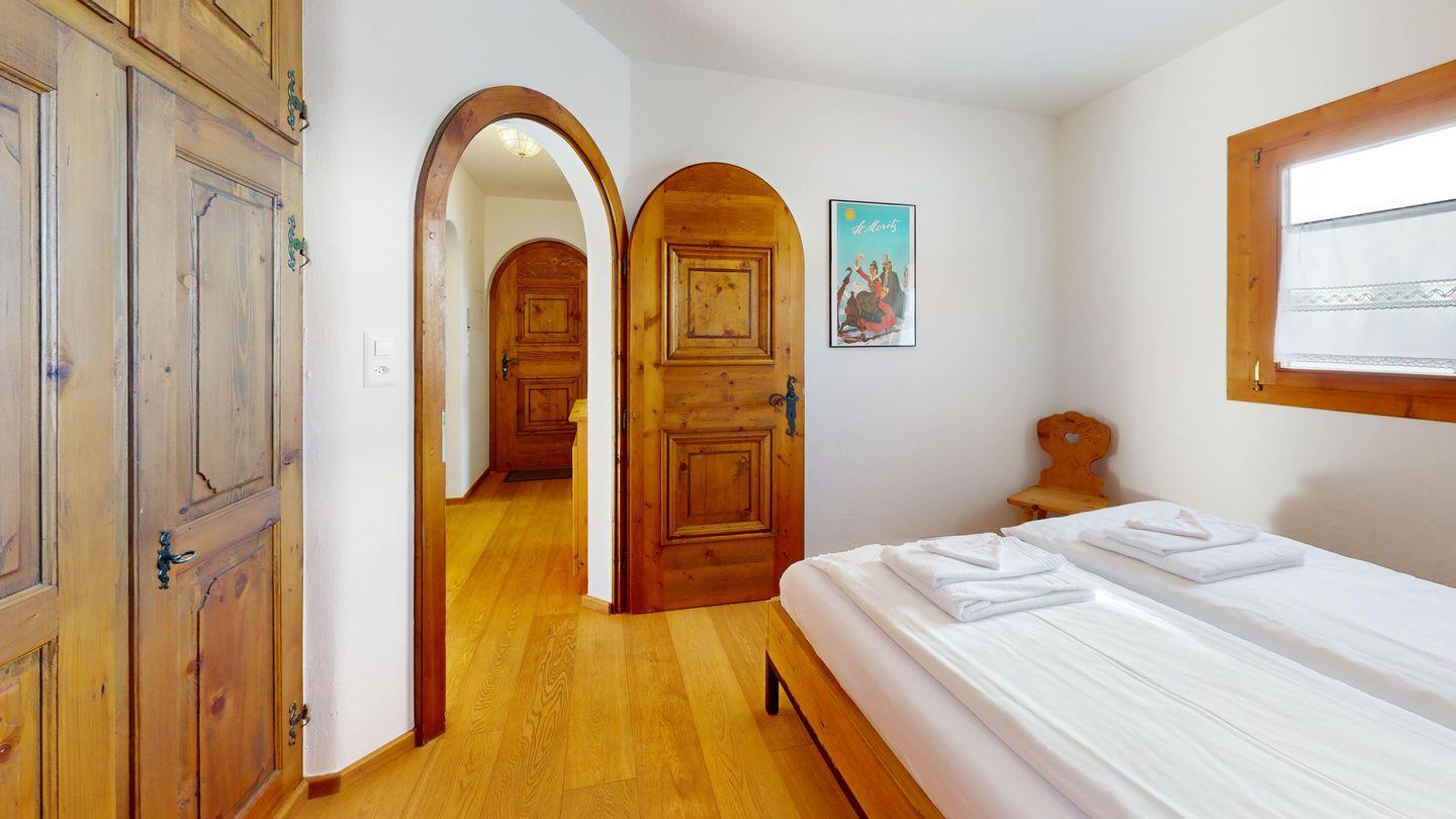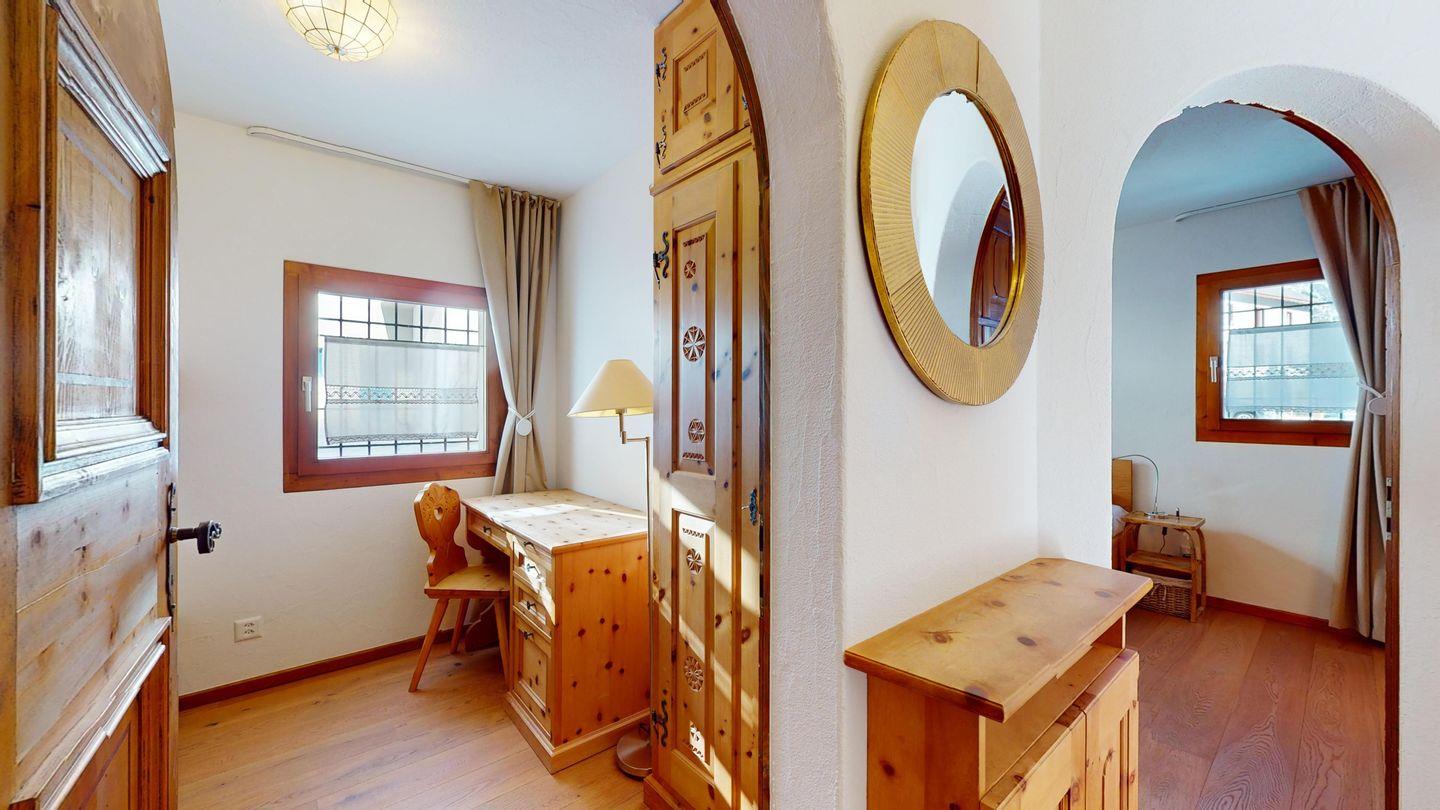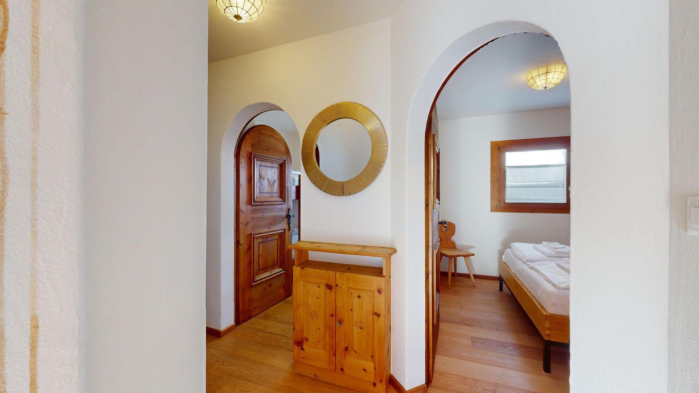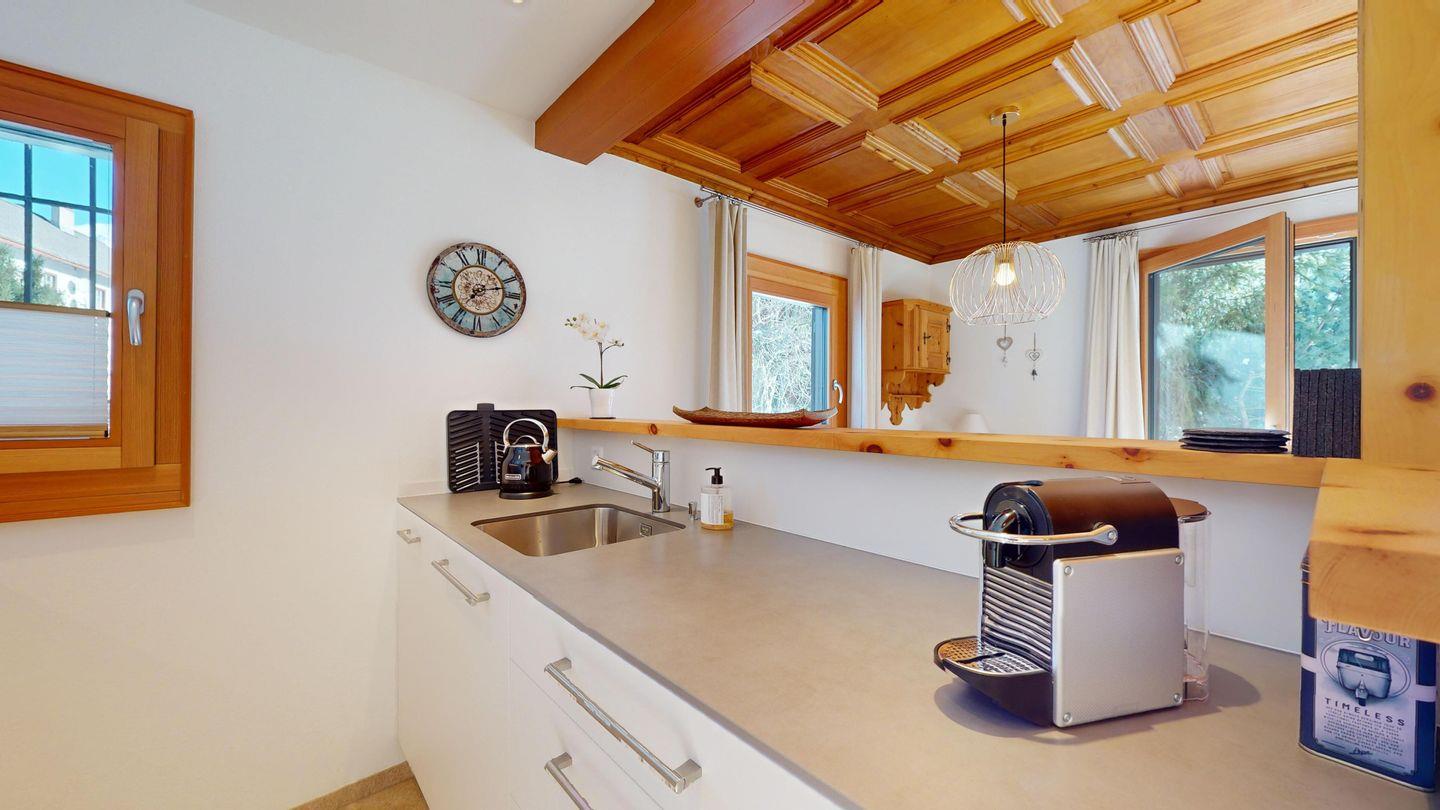 3-Zimmerwohnung im Hochparterre. Eingang mit Garderobe. Offene Küche mit Kühlschrank, Backofen, Geschirrspülmaschine, Chicco d'Oro Kaffeemaschine und Fondue. Wohn-/ Esszimmer mit Balkon und TV. Cheminée kann nicht benutzt werden. Ein Doppelschlafzimmer (160x200) und ein Kinderschlafzimmer mit Etagenbett (80x200). Bad/WC/Lavabo. Ein Garagenplatz. Neue komfortable Einrichtung. Waschküche und Skiraum zur Mitbenützung. Nichtraucherwohnung. Haustiere sind nicht erlaubt.