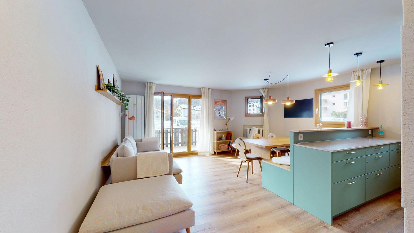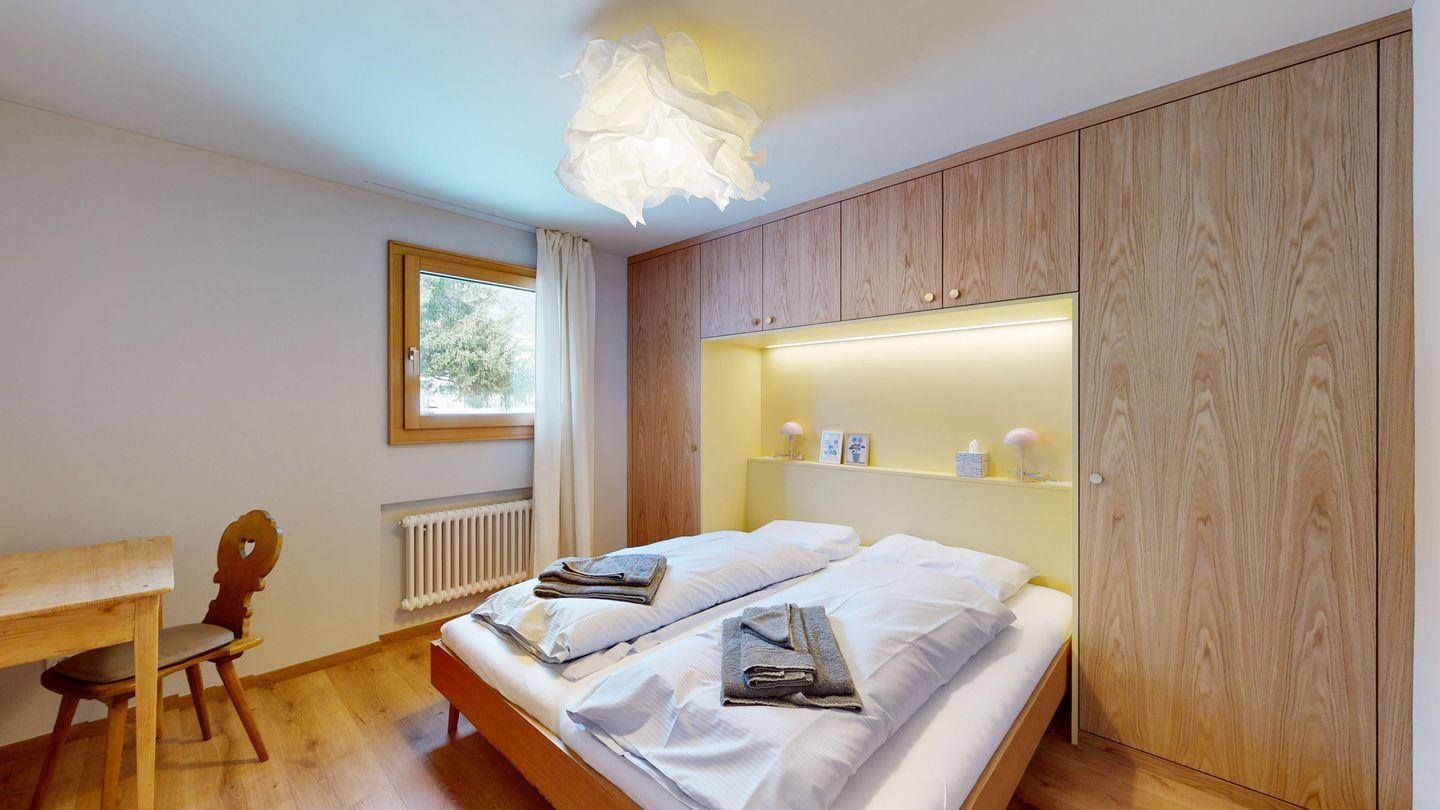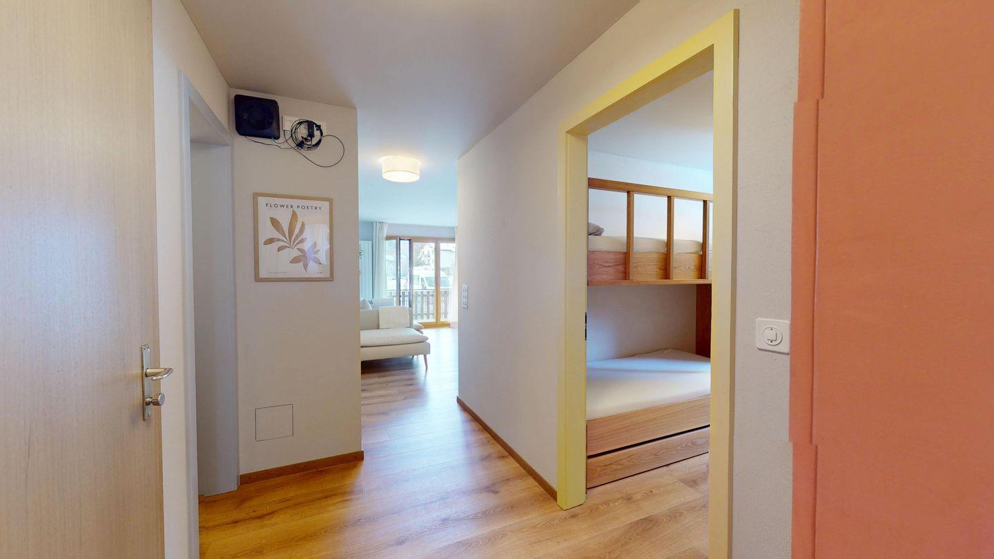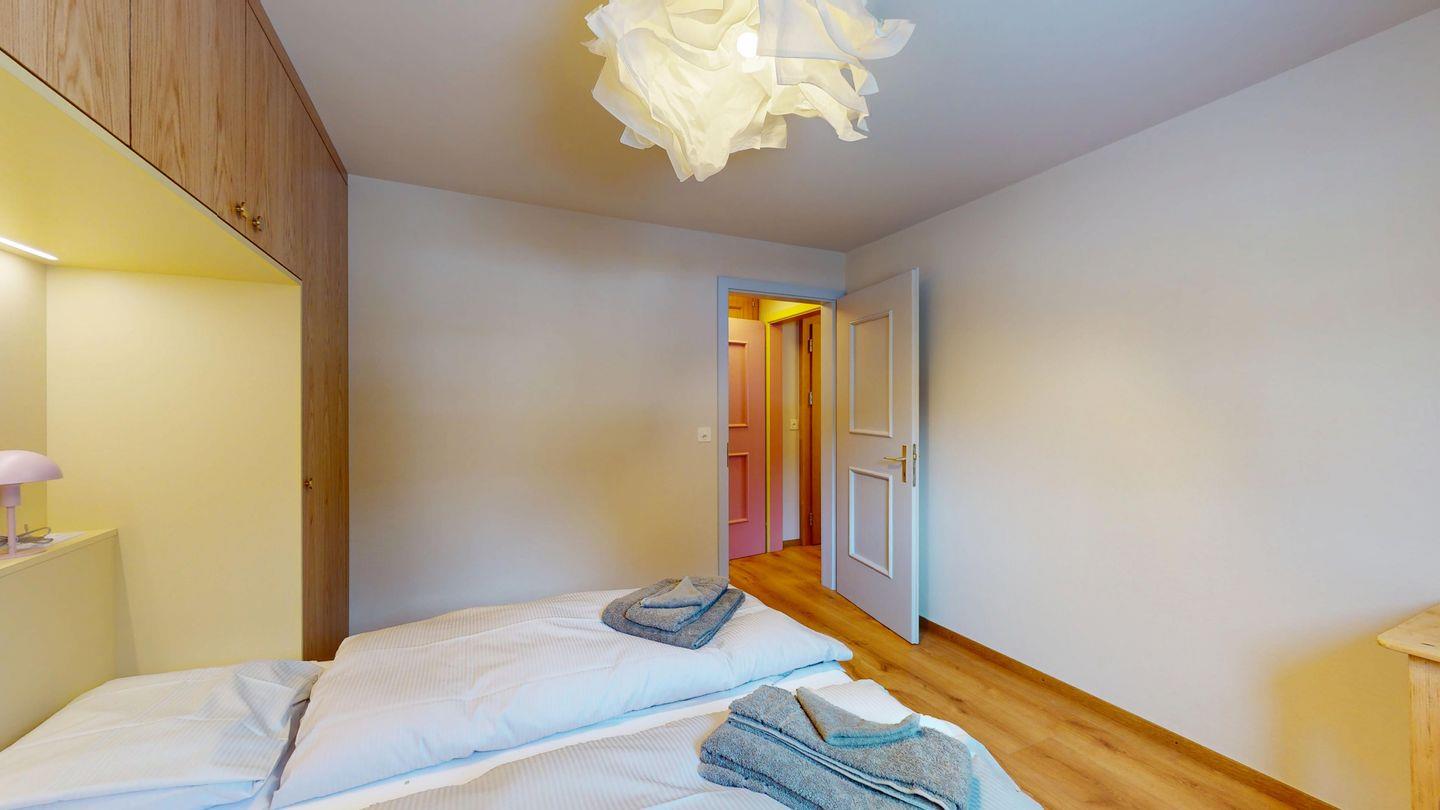 Die neu und aufwendig renovierte 3½-Zimmerwohnung im Parterre, bietet modernen Komfort an ruhigen Lage. Sie eignet sich hervorragend für Familien oder Paare. Eingang mit Garderobe, helles Wohnzimmer mit Sitzecke, Sofa, TV, Zugang zum Balkon mit schönem Bergblick. Moderne kleine Küche, mit hochwertigen Geräten ausgestattet: Kühlschrank mit Gefrierfach und zusätzlich 3 separate Gefrierfächer, Geschirrspüler, Induktionsherd, Backofen, Wasserkocher, Toaster und Chicco d`Oro Kaffeemaschine. Ein Doppelschlafzimmer. Ein 2. Schlafzimmer mit 2 Hochbetten und ein Einzelbett. Badezimmer mit Badewanne/WC/Bidet, zusätzliches Gäste-WC. Ein Garagenplatz.