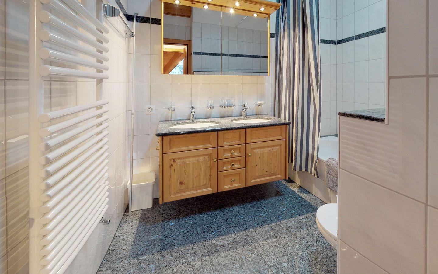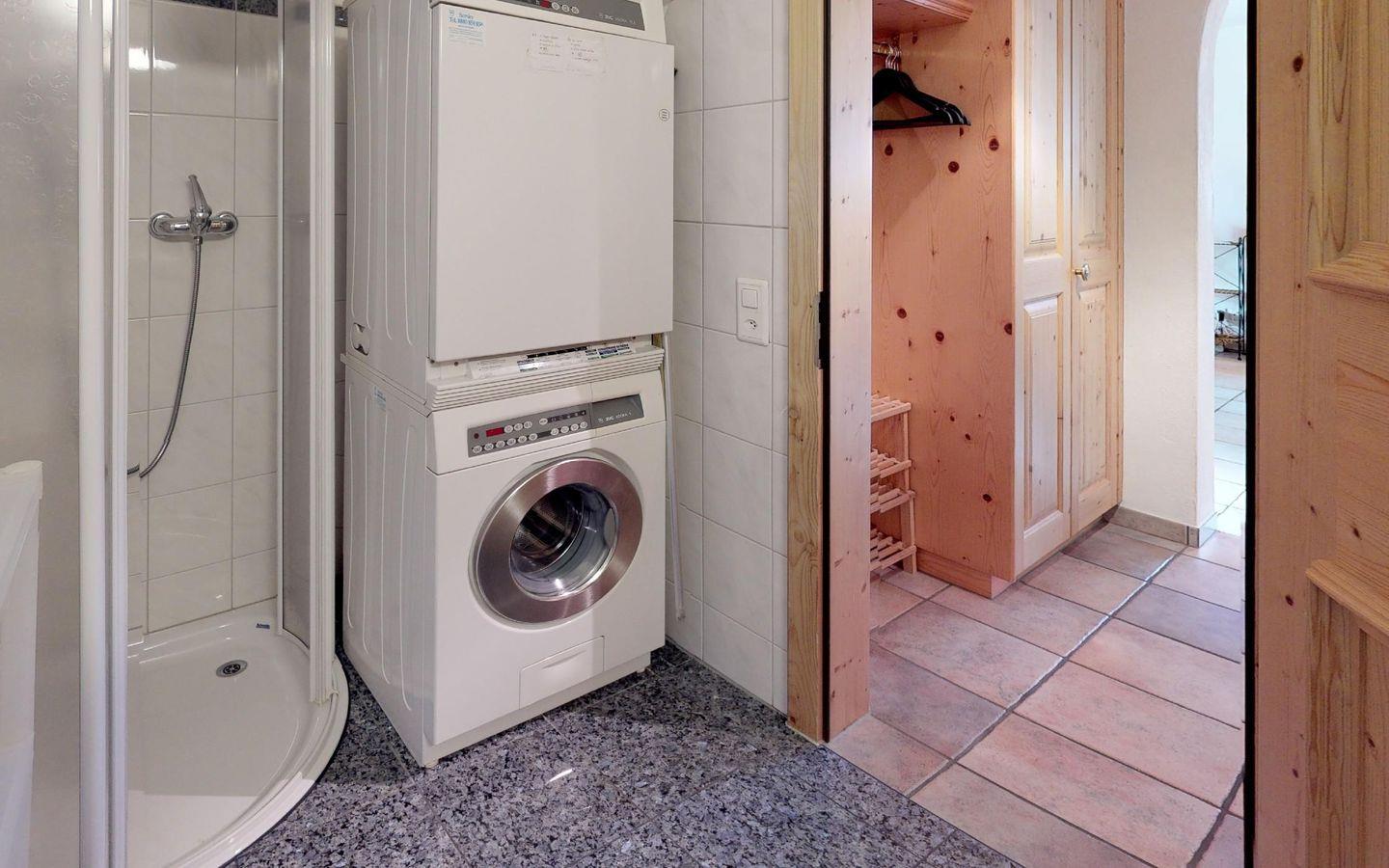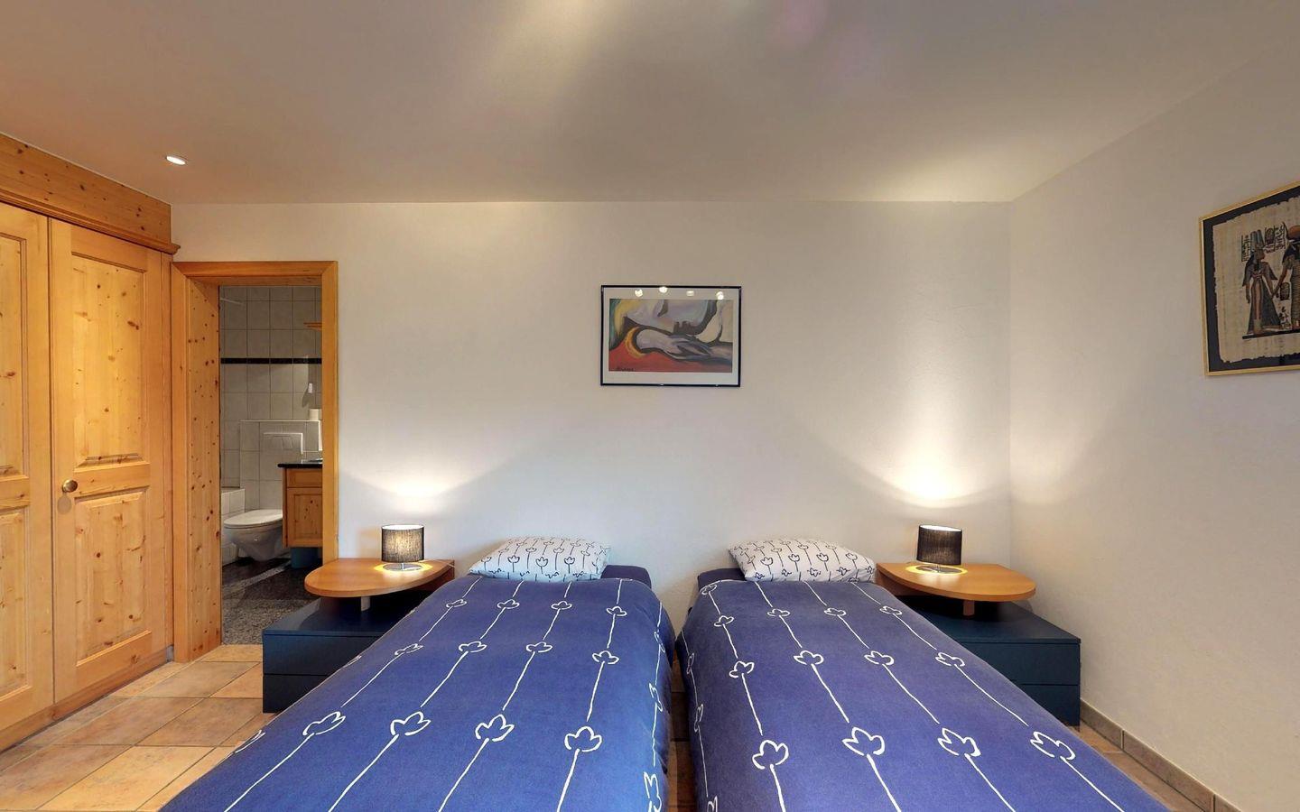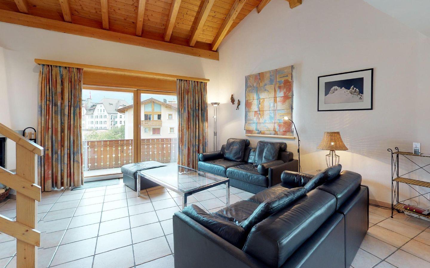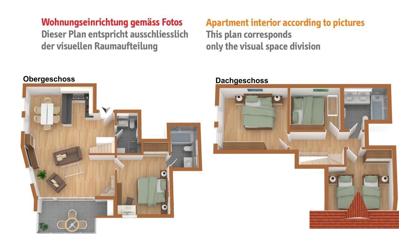 Charmante, helle 5 - Zimmer Ferienwohnung im Dachgeschoss mit Aussicht. Geschoss 1: Eingang mit Gästetoilette/Dusche und Waschmaschine. Wohn- /Esszimmer mit offener Küche, Kamin und Balkon. Elternschlafzimmer mit Bad/Dusche. Oberer Stock: 1 grosses Doppelschlafzimmer. 1 kleineres Schlafzimmer mit Doppelbett, 1 SZ mit 2 Einzelbetten in der Dachschräge, 1 Bad/WC. 2 Garagenabstellplätze, Lift, sowie eine Sauna und Spielraum im Haus.