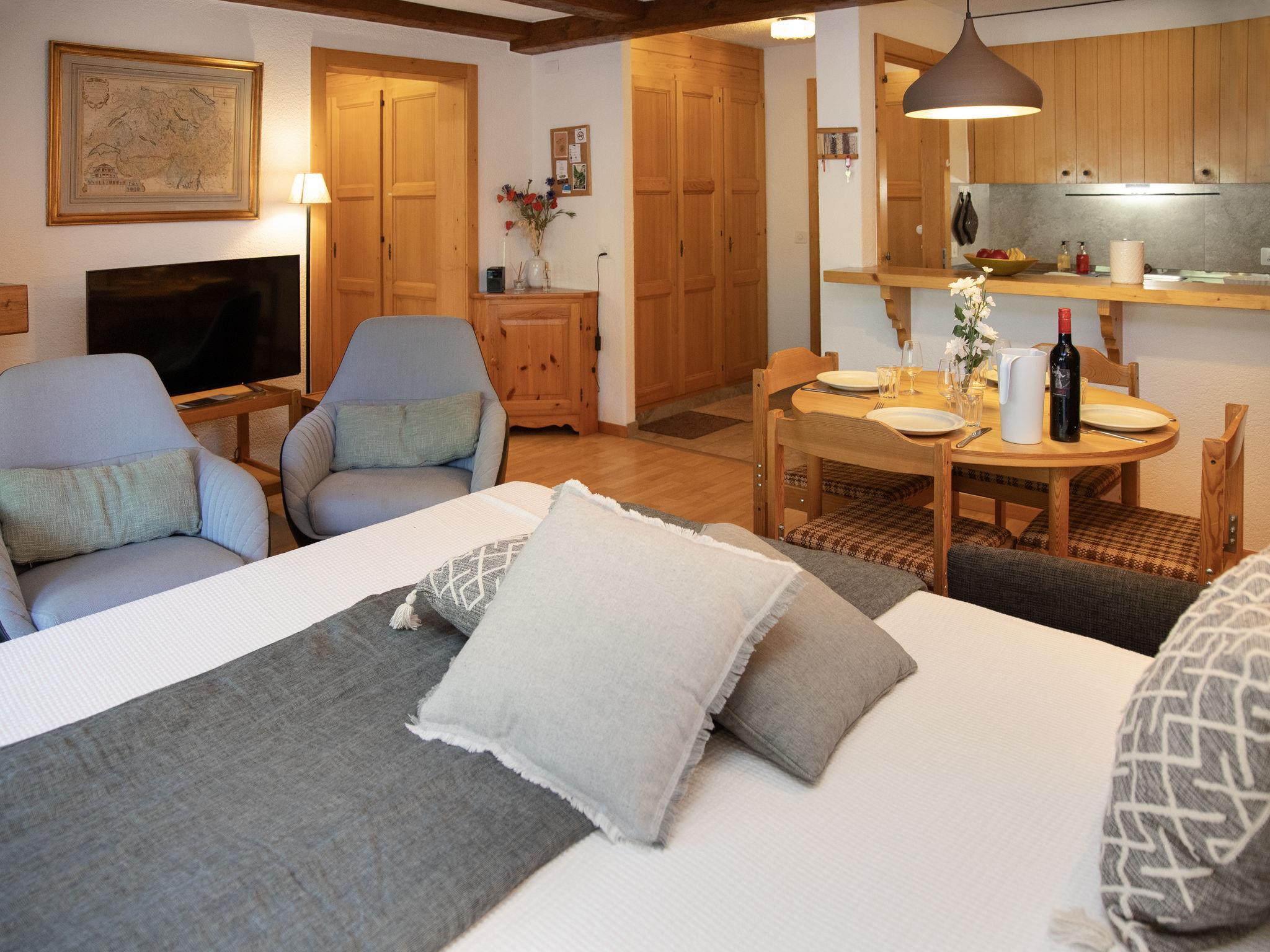 "Parc C013", 2-room apartment 60 m2, on the upper ground floor. Practical and beautiful furnishings: living/dining room with 1 double sofabed (140 cm, length 200 cm), cable TV. Exit to the balcony. 1 large room with 2 beds (90 cm, length 200 cm). Kitchenette (4 hot plates, oven, dishwasher). Shower/WC. Small balcony. Balcony furniture, deck chairs (2). Beautiful view of the lake and the mountains. Facilities: Internet (WiFi, free). Parking space n 5 (roofed) at the house. Please note: non-smokers only. Maximum 1 pet/ dog allowed.