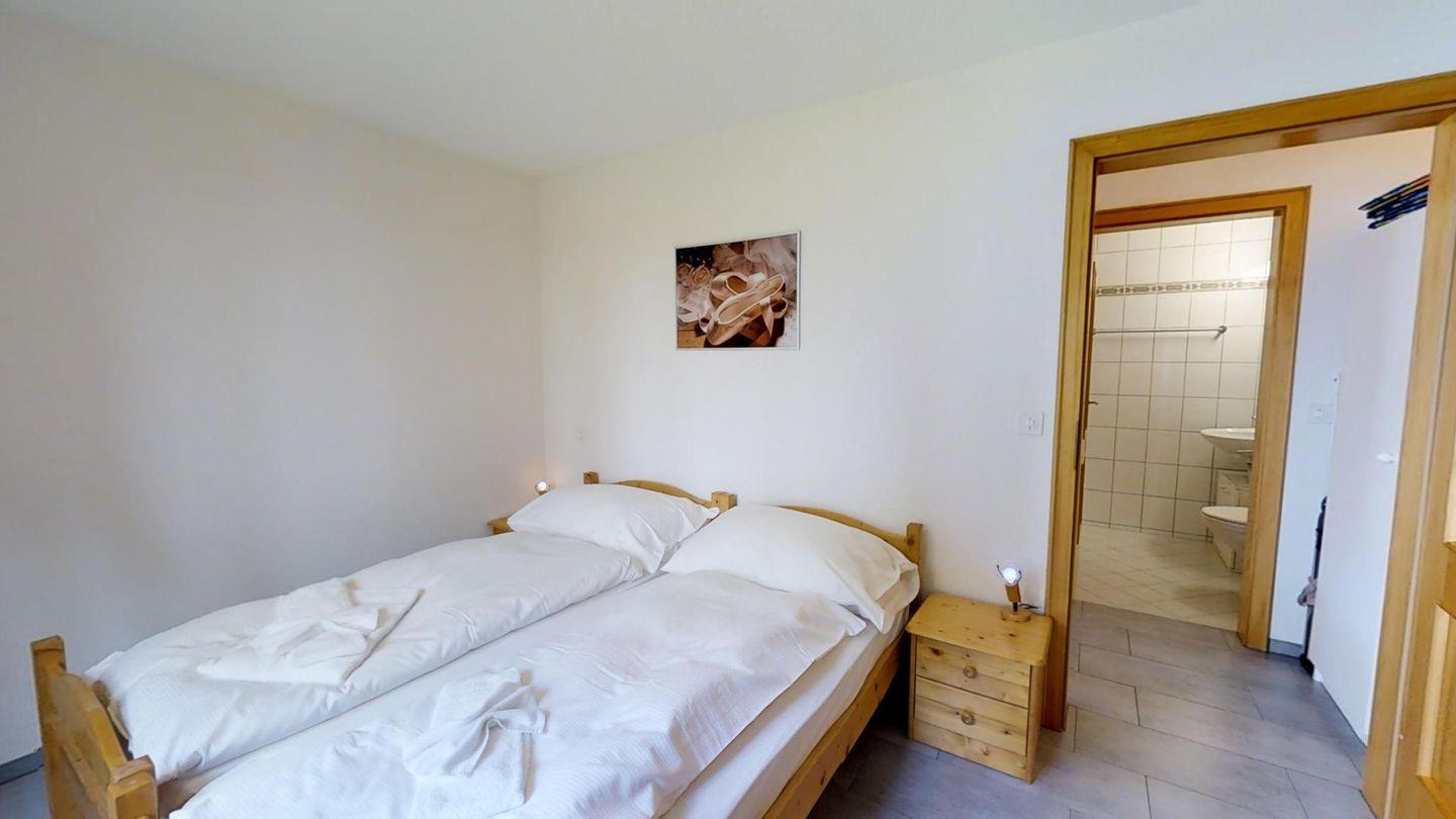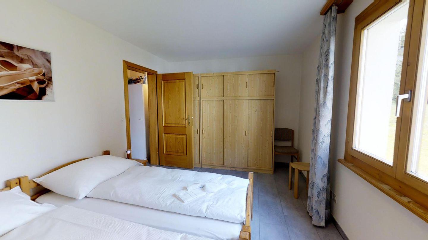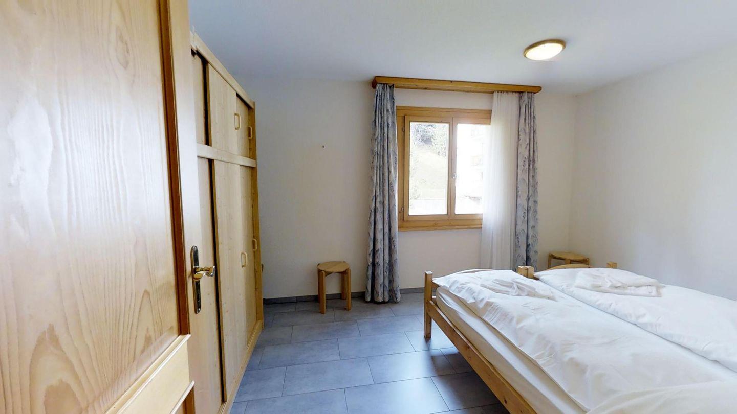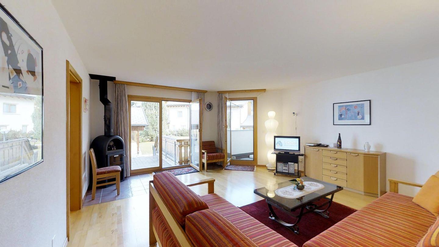 Helle 2½-Zimmerwohnung in erhöhtem Erdgeschoss, ca. 70 m2, an ruhiger Ost-Lage. Entree mit Garderobe und Wandschrank. Grosses Wohnzimmer mit zwei Einzelbetten (90x200). Sitzplatz mit Gartenmöbel. Kleiner Balkon. Telefon mit Zähler, Radio und TV. Essküche mit Geschirrspüler, Backofen und Mikrowelle. Fondue-Geschirr vorhanden. Bad, WC und Lavabo. Doppelzimmer mit zwei Einzelmatratzen (2x90x190). Neue, komfortable Einrichtung, Bodenheizung, Garagenplatz und Skiraum zur Mitbenützung. Haustiere sind nicht erlaubt.