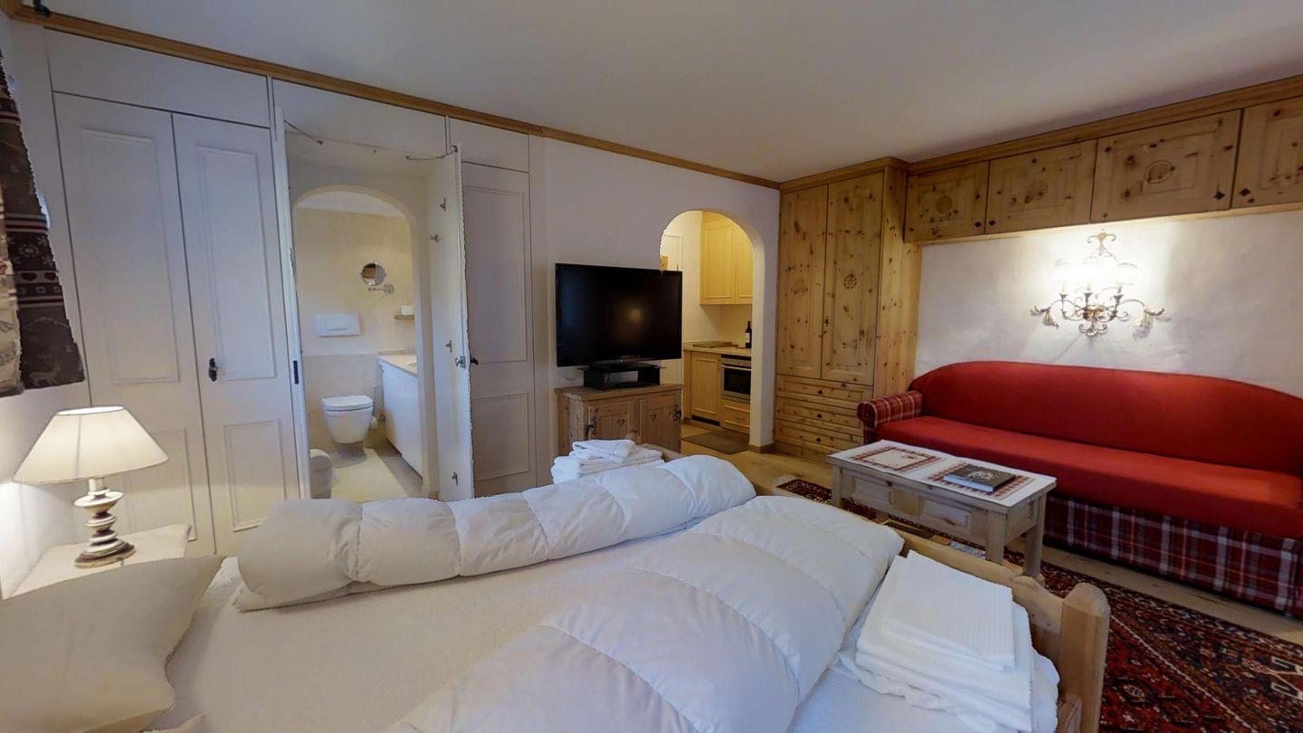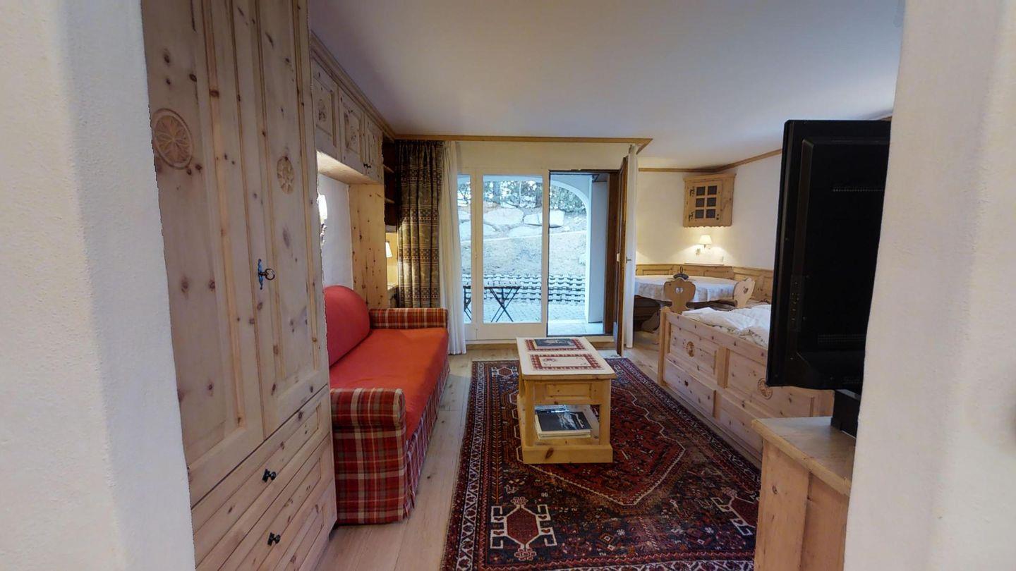 Studio im Erdgeschoss, ca. 40 m2. Sitzplatz mit Süd/Westlage, Bergsicht. Renoviert Ende 2014. Entree, kleine Küche mit Mikrowelle und Geschirrspüler, CHICCO D'ORO Kaffeemaschine, Keramikplatte. Wohnzimmer mit Essecke im Engadinerstil und Bettsofa. Doppelbett aus Arvenholz (180x200). Radio mit iPod/iPhone Station und TV. Badezimmer mit Regendusche/Lavabo/Bidet/WC. Garagenplatz. Haustiere sind nicht erlaubt.