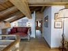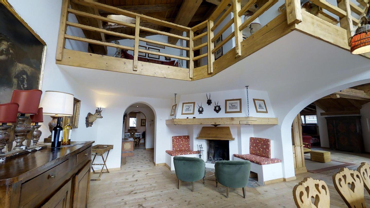 Im unteren Geschoss befindet sich der weitläufige Wohnbereich mit grossem Esstisch, gemütlicher offener Kaminecke sowie abgetrenntem Sitzbereich und TV-Ecke.