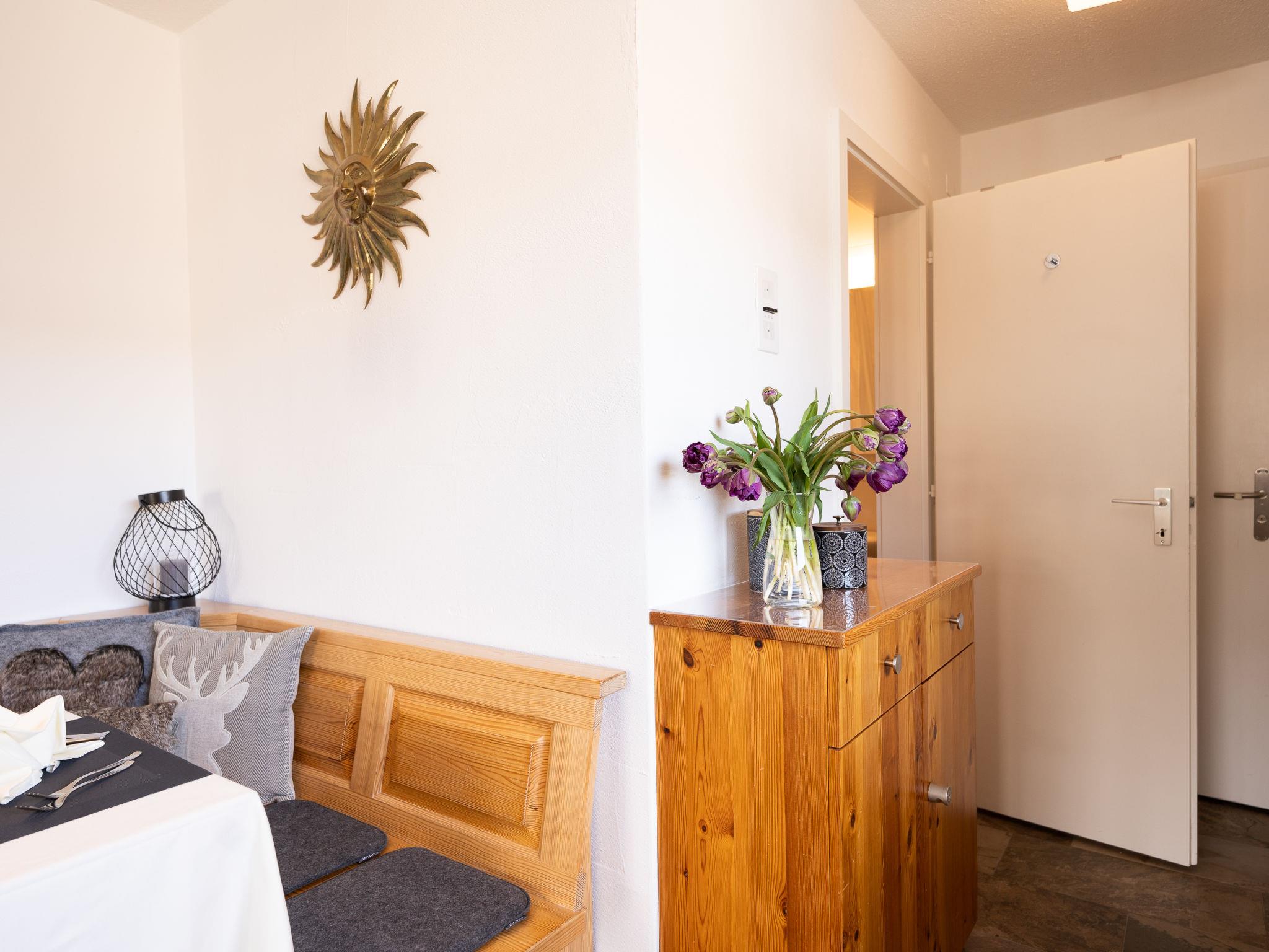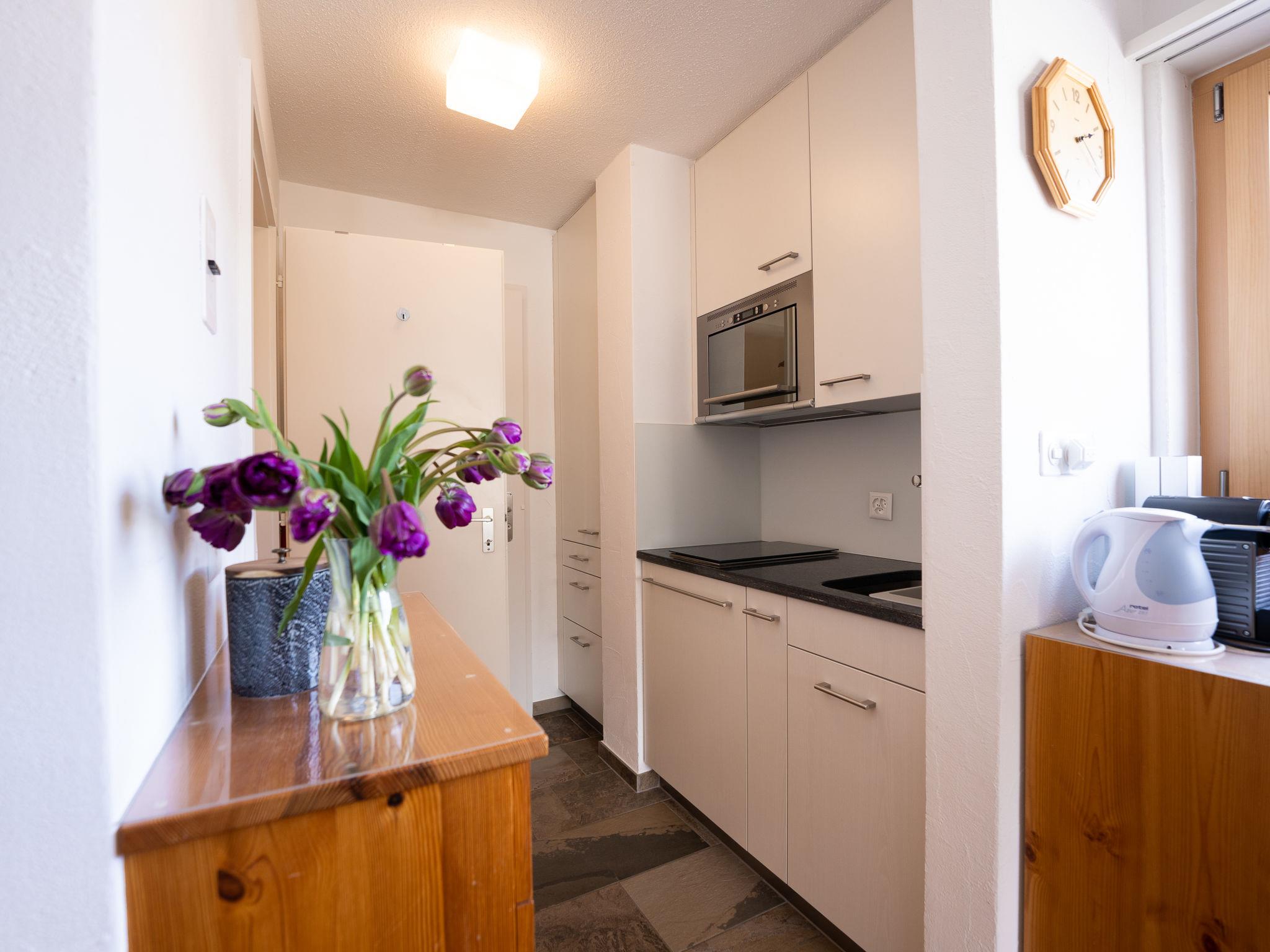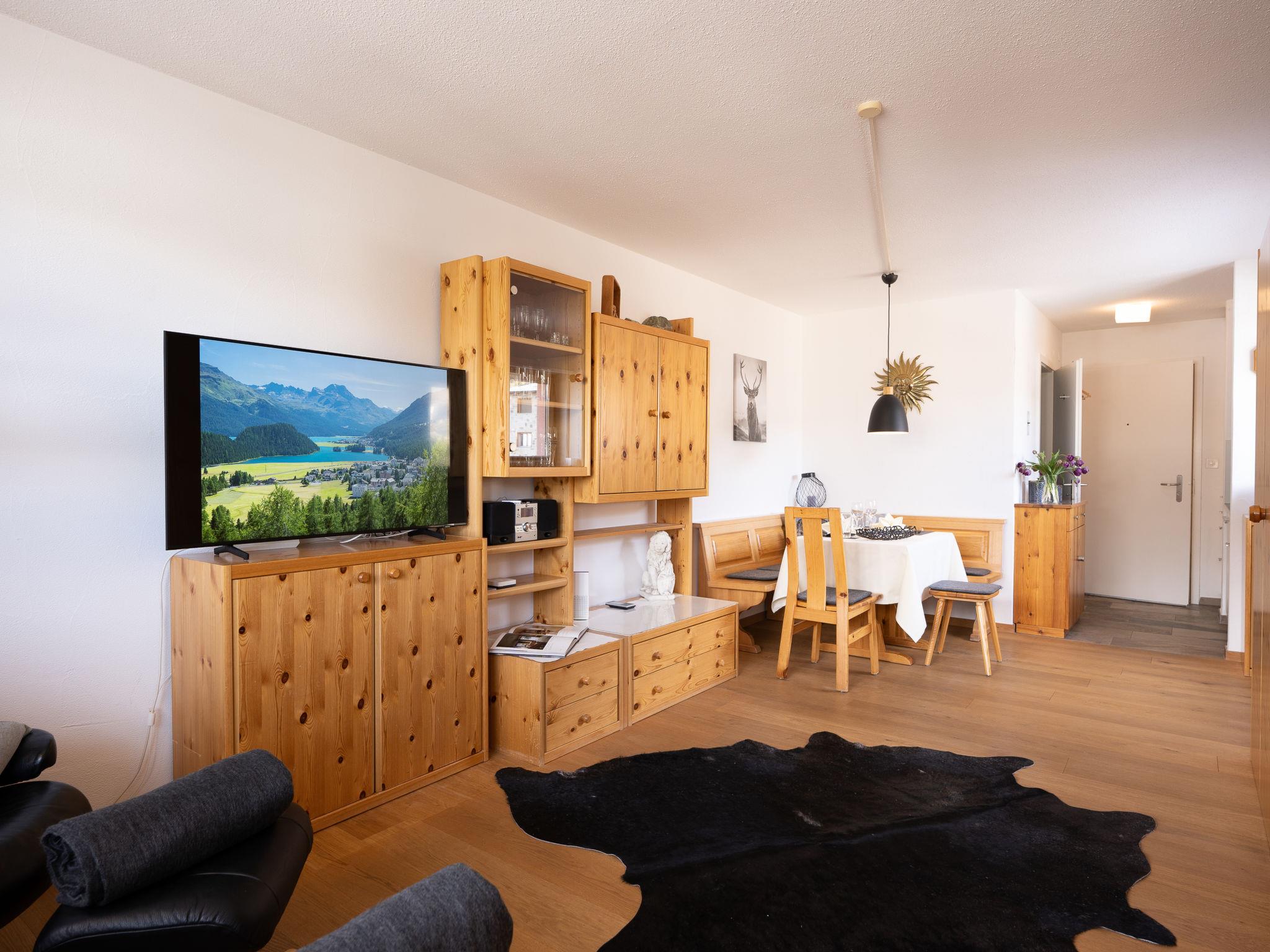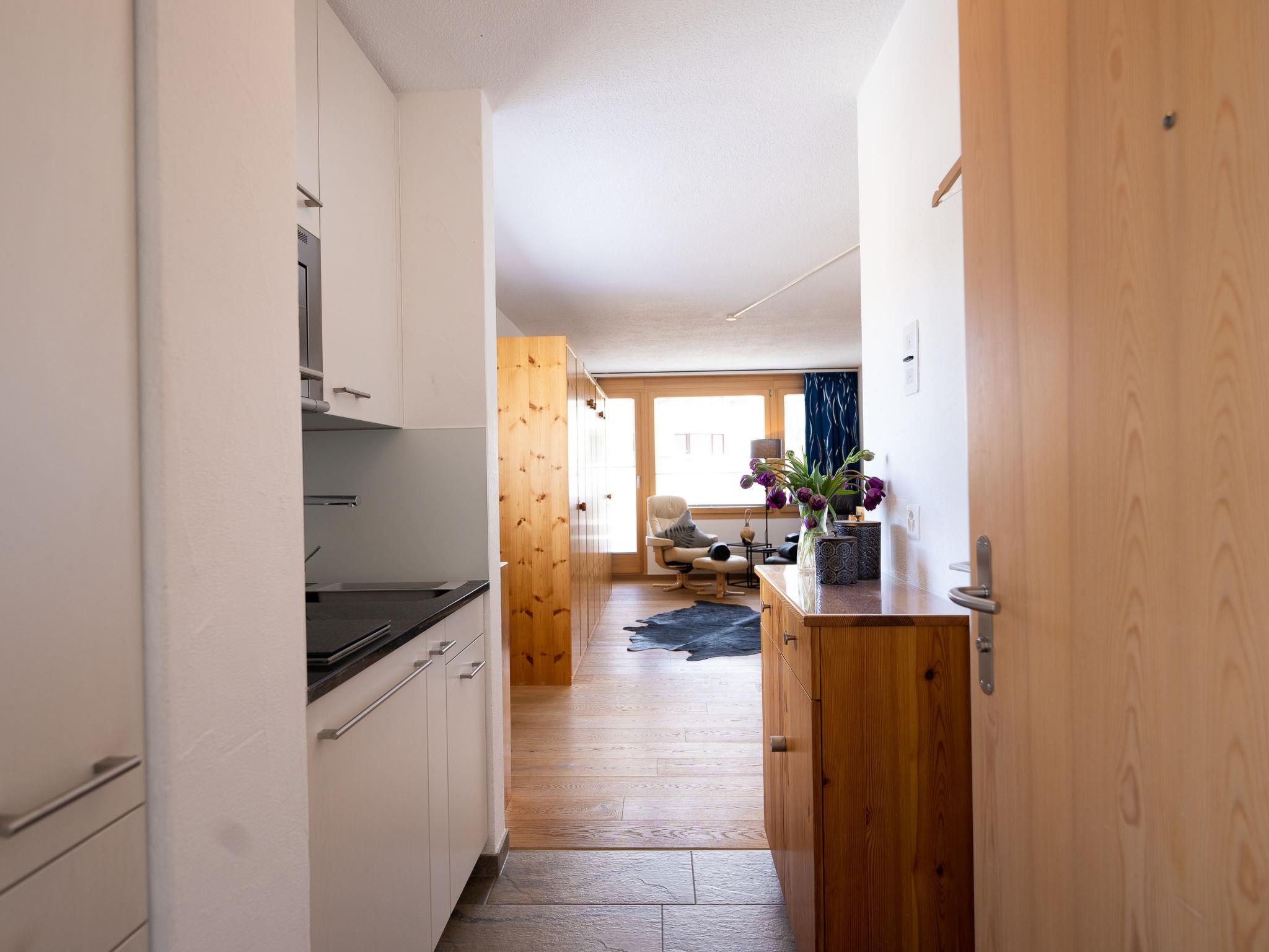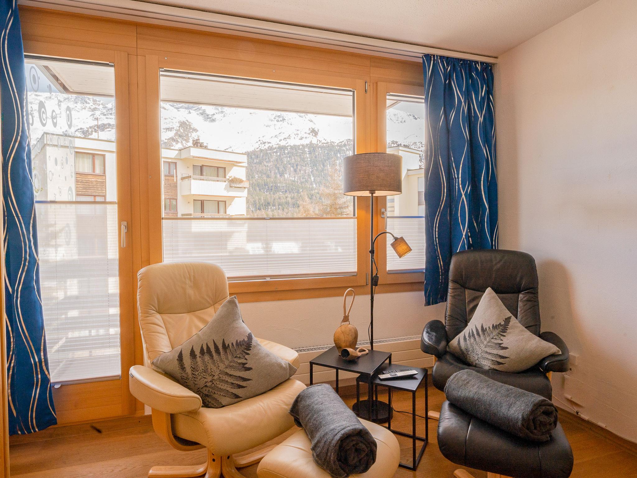 "Chesa Corvatsch 211 - Champfer", 1-room apartment 30 m2 on 2nd floor. Bright, cosy and wooden furniture furnishings: living/sleeping room with dining table and TV (flat screen). Exit to the balcony. Small, open kitchen in the entrance (2 ceramic glass hob hotplates, toaster, kettle, microwave, electric coffee machine, Capsules for coffee machine (Nespresso) extra) with 2 fold-away beds (90 cm, length 200 cm). Bath/WC. Heating. Wooden floors. Balcony furniture. Beautiful view of the mountains and the countryside. Facilities: iron, hair dryer. Internet (WiFi, free). Parking space n 211 (roofed), height 200 cm, width 220 cm. Please note: apartment courtyard side. Non-smokers only, non-smoking house.