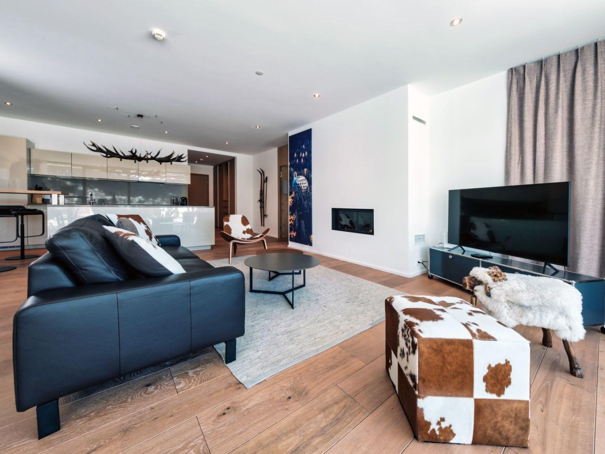 The interior design of our flat reflects the luxury and spaciousness you expect from a 5-star holiday. At 115 square metres, it offers enough space for 4 people. Experience culinary delights in a state-of-the-art Poggenpohl kitchen with V-ZUG appliances, from induction hob to dishwasher. The living and dining room, furnished with a leather sofa, designer lounge chairs and a gas fireplace, offers comfort as well as a priceless panoramic view. The bedroom has a comfortable double bed and a spacious wardrobe. There are also two fully equipped bathrooms with high-quality bath products.