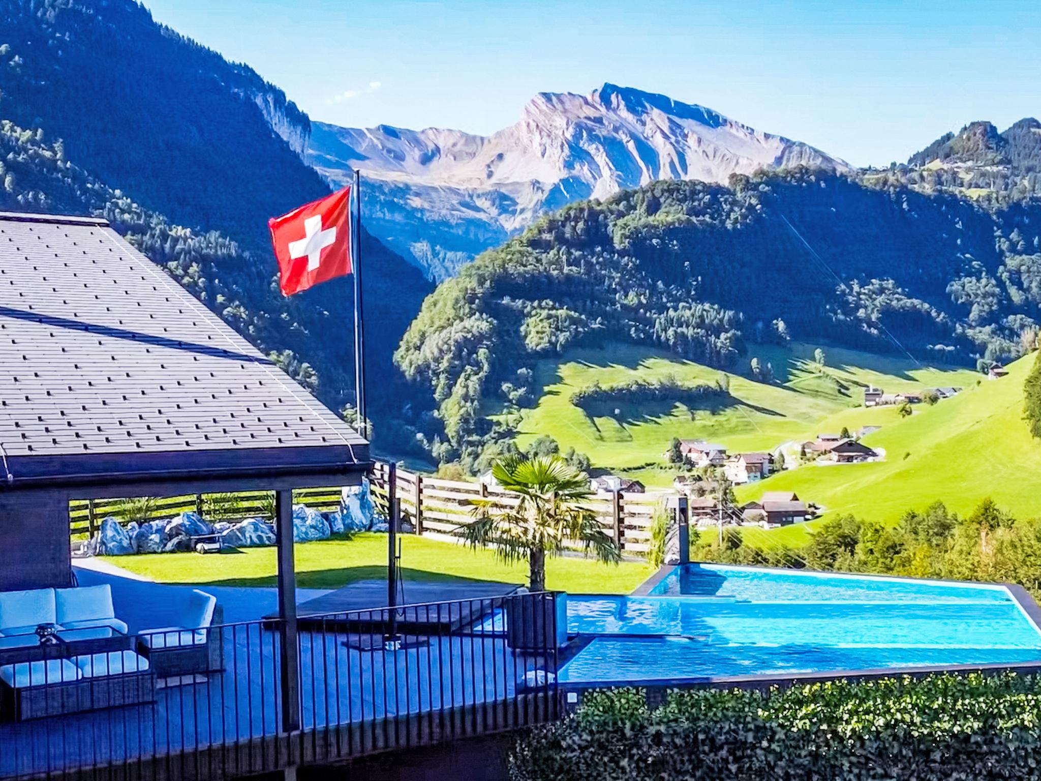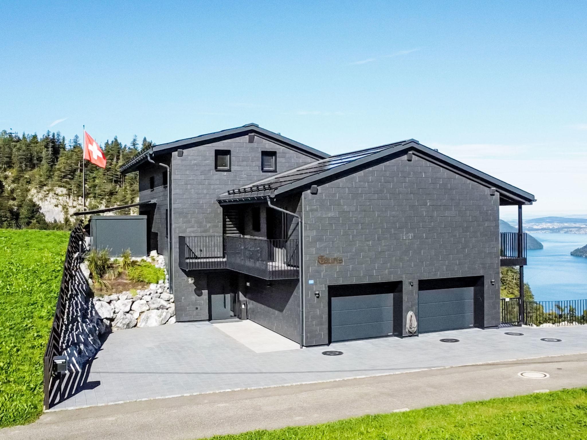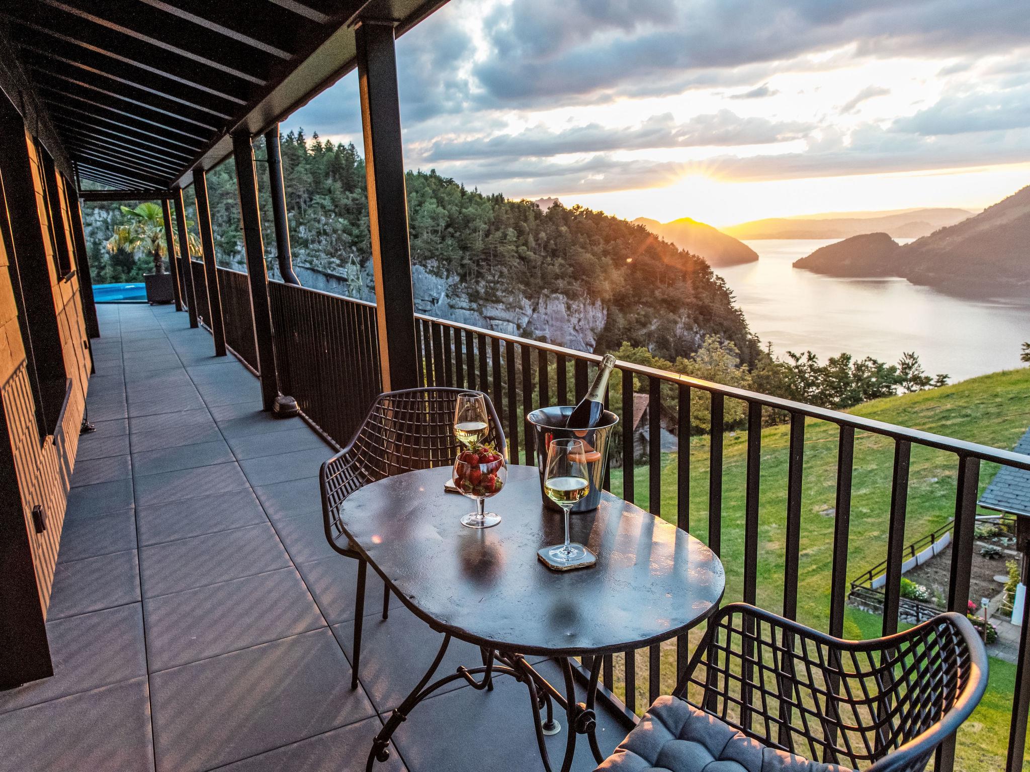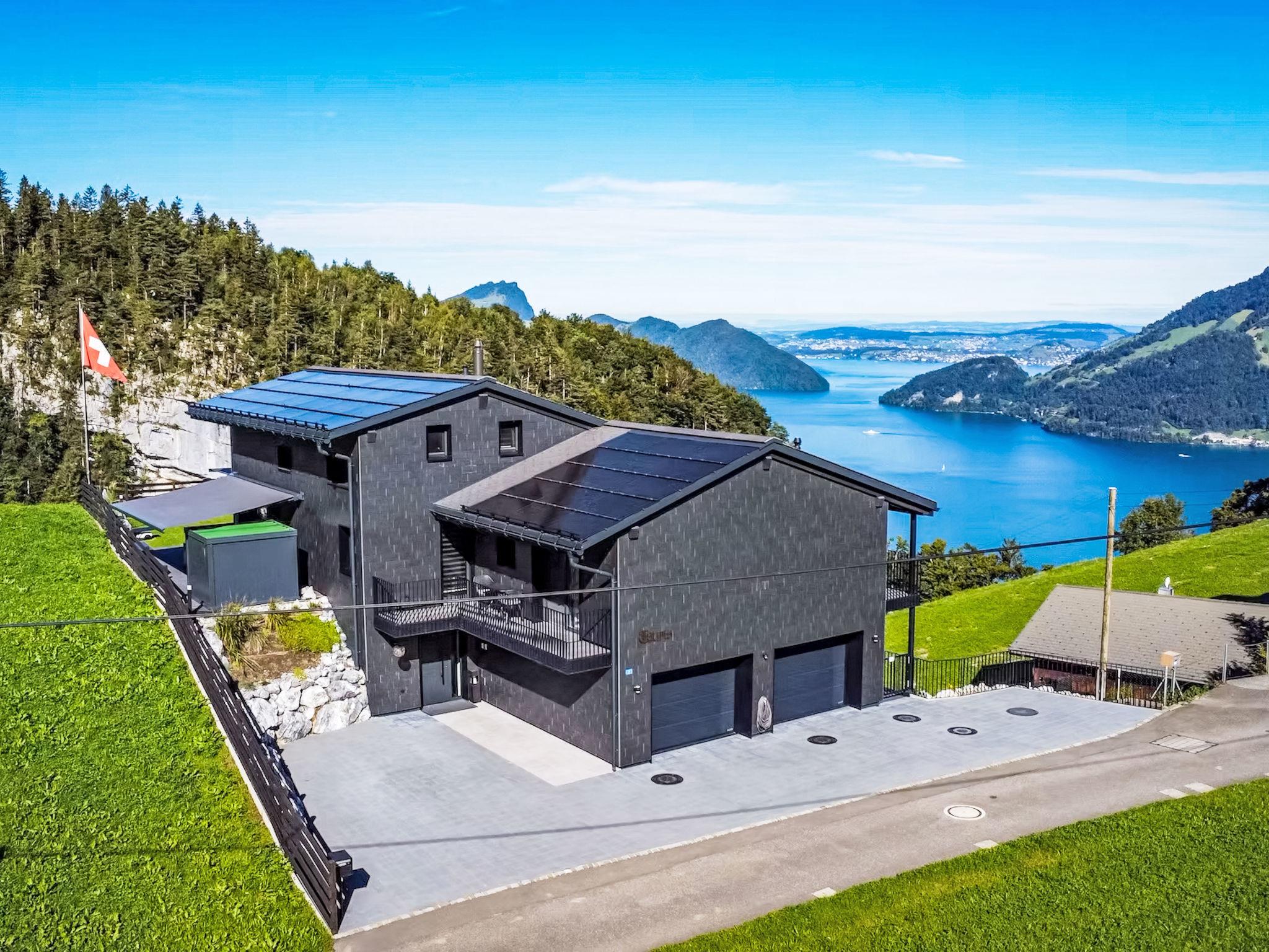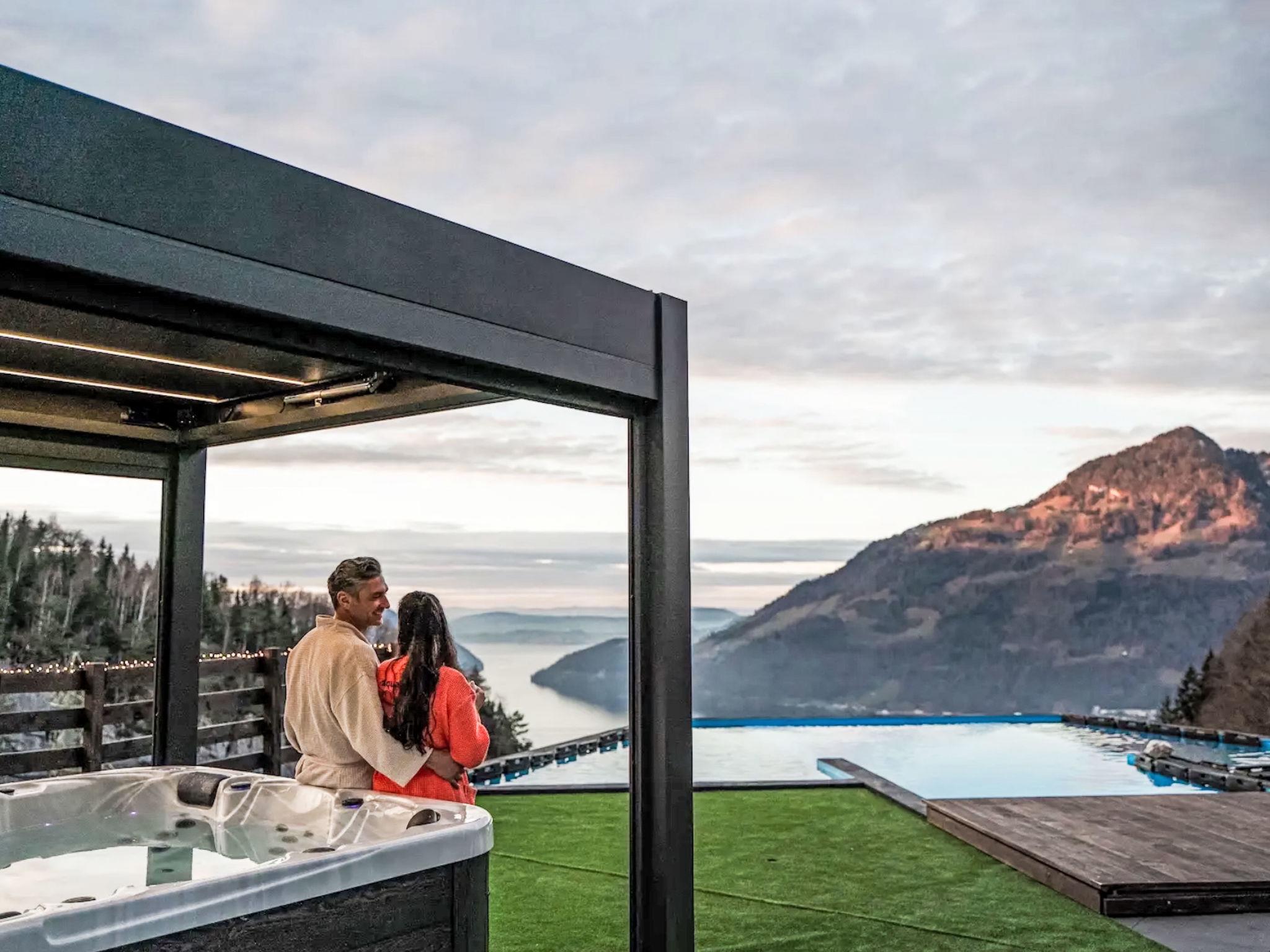 Luxury villa in the Swiss Alps at an altitude of 800 meters with panoramic views stretching all the way to the Black Forest. This elegant villa towers above the mystical Risleten Gorge, surrounded by untouched nature. Absolute tranquility. Absolute views. Absolute privacy. Comfortable villa "Tauris", 800 m a.s.l., detached, built in 1963, renovated in 2024. Above Emmetten, Risleten Gorge, in a secluded, quiet, elevated position, 7 km from the lake, 2 km from the skiing area. Private: property 700 m2 (fenced), garden 100 m2, swimming pool (3 x 7 m, depth 150 cm, seasonal availability: 01.Jan. - 31.Dec.) with alarm system. Hot tub, nat. Swimm. Pond, barbecue. In the house: sauna, fitness room. Parking (for 6 cars) at the house, single garage. E-charging station. Bus stop 900 m, pebble beach 7 km. Skisport facilities 2 km. Nearby attractions: Rütli 6 km. The owner does not accept any youth groups.
