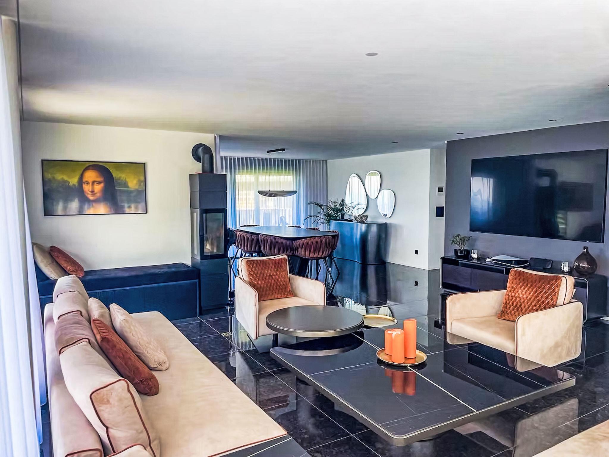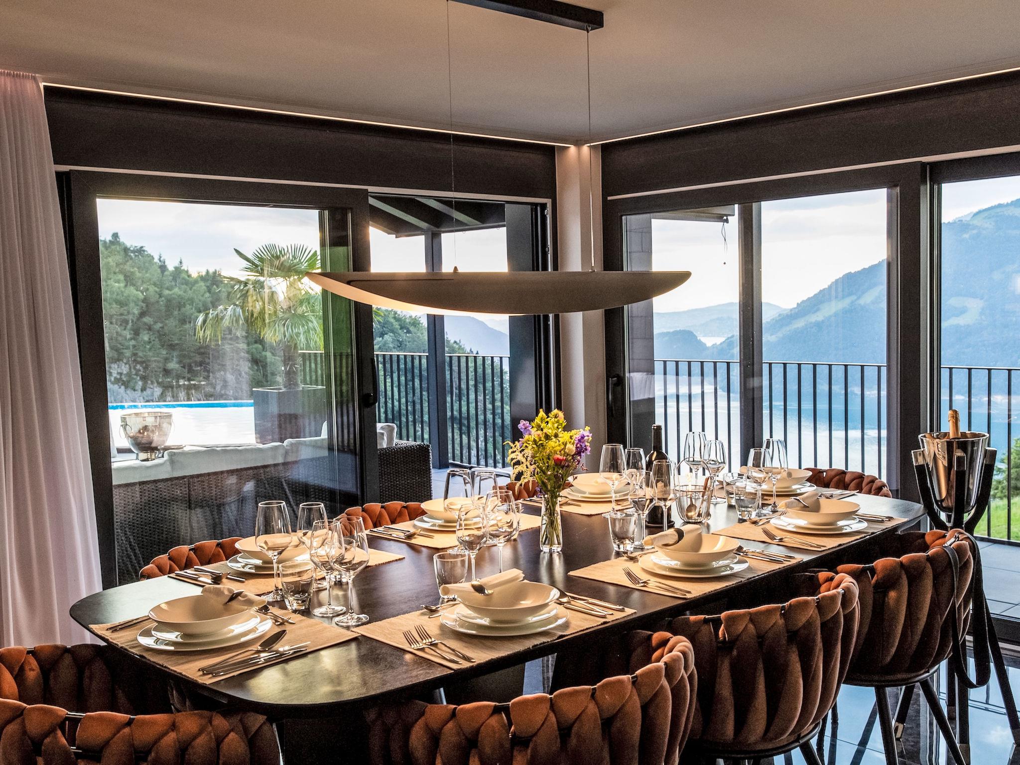 A spacious five-bedroom villa (approx. 250 m²) arranged over two levels, featuring a light-filled living and dining area with fireplace and breathtaking panoramic views across Lake Lucerne and the Alps.