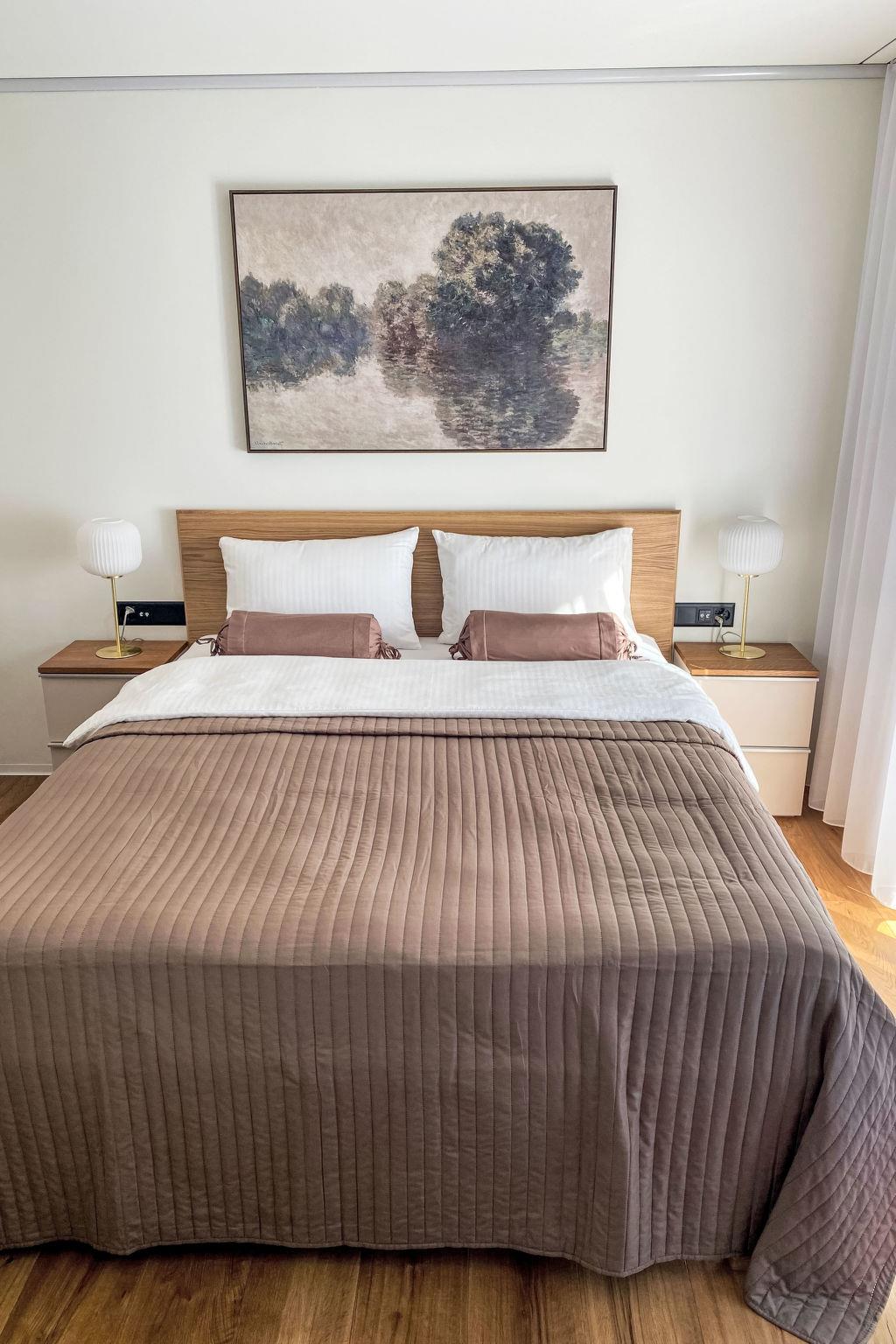 Five elegant bedrooms with French beds and Smart TV (including Netflix), four offering direct balcony access.