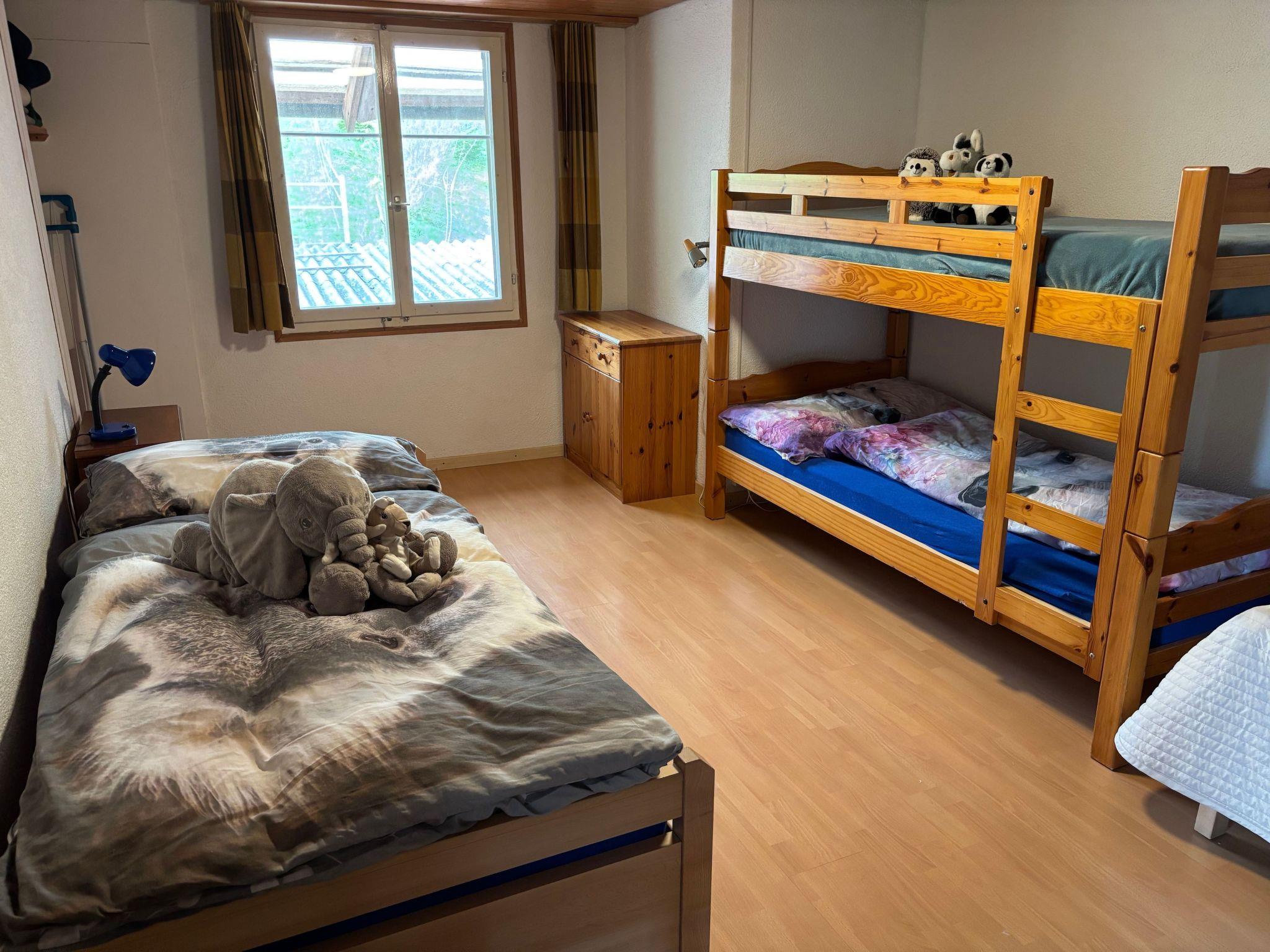 2 single beds, loft bed, wardrobe, chest of drawers, chair, shelf, small chest of drawers, bedside cabinet.
