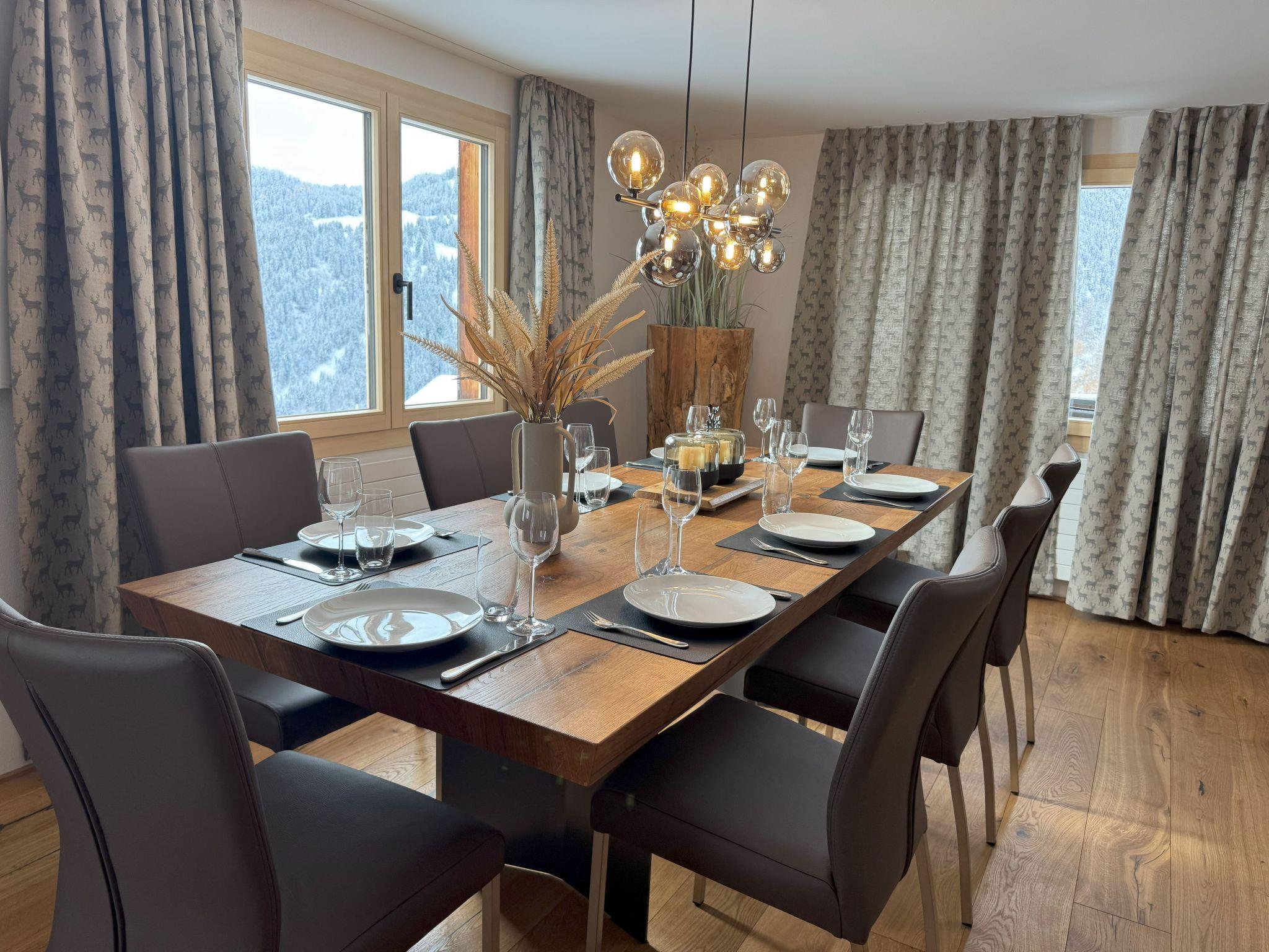 This stylish 4.5-room flat (121m2) in Falera was completely remodelled and renovated in November 2024. The flat offers space for 8 people. Only high-quality and modern materials were used. All the new furnishings come from the renowned Zurich furniture store Schubiger Möbel.