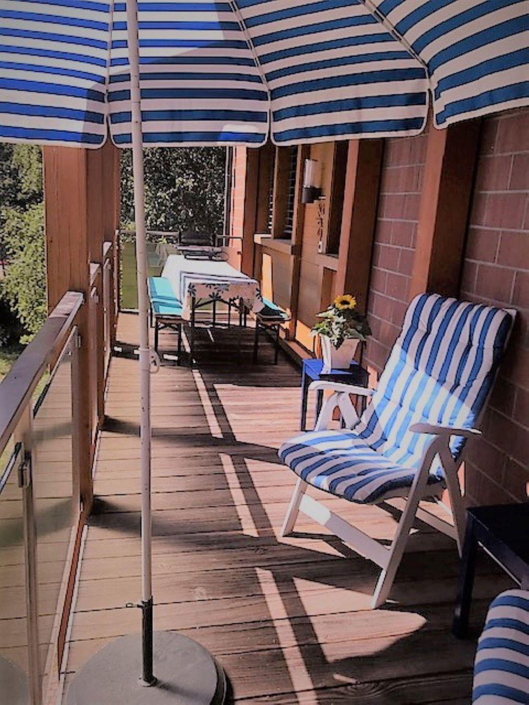 Entlang der gesamten Länge der Wohnung befindet sich ein Balkon mit langen Tischen, Bänken und Stühlen, sodass für jeden ausreichend Sitzplätze vorhanden sind.