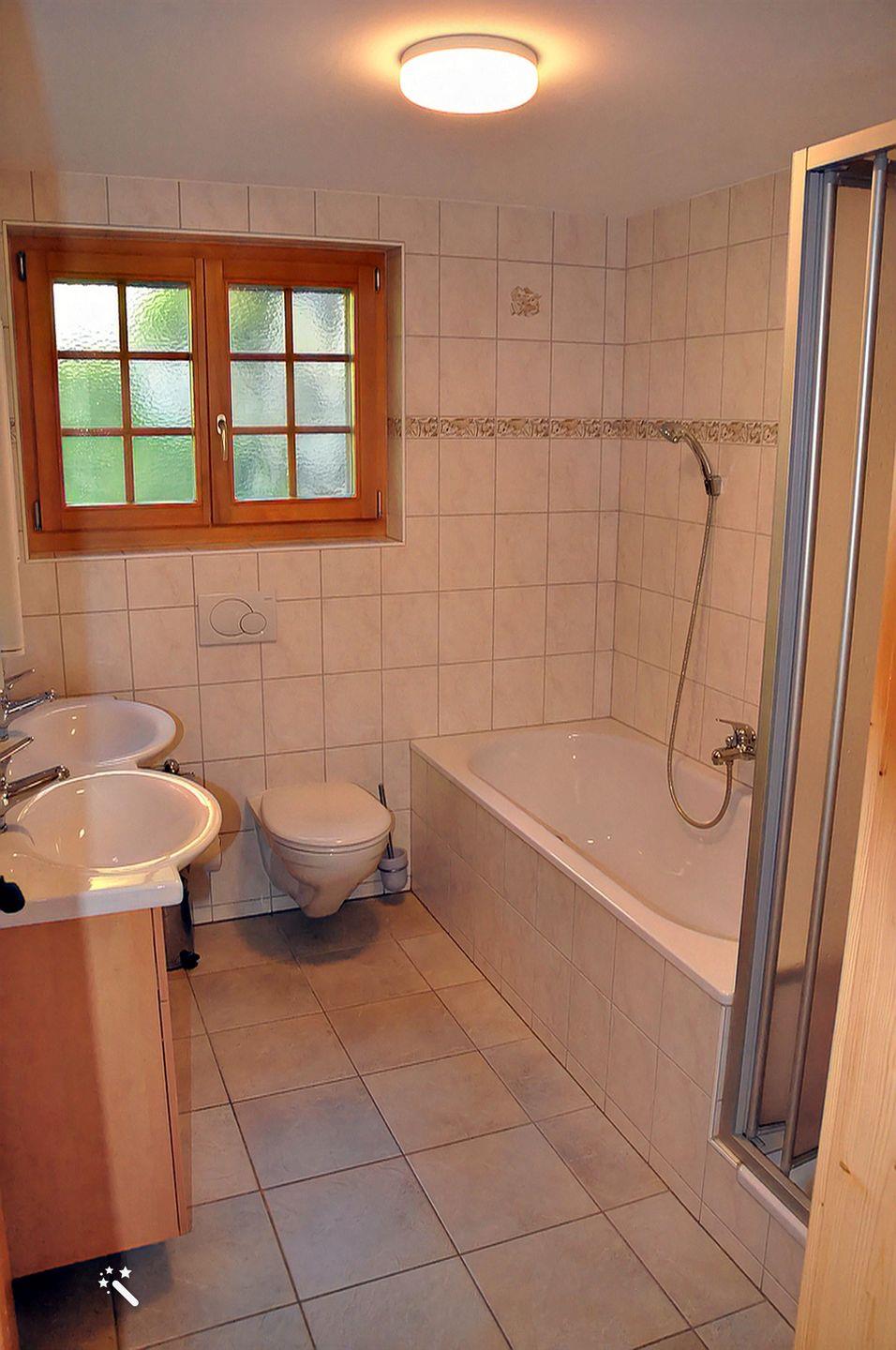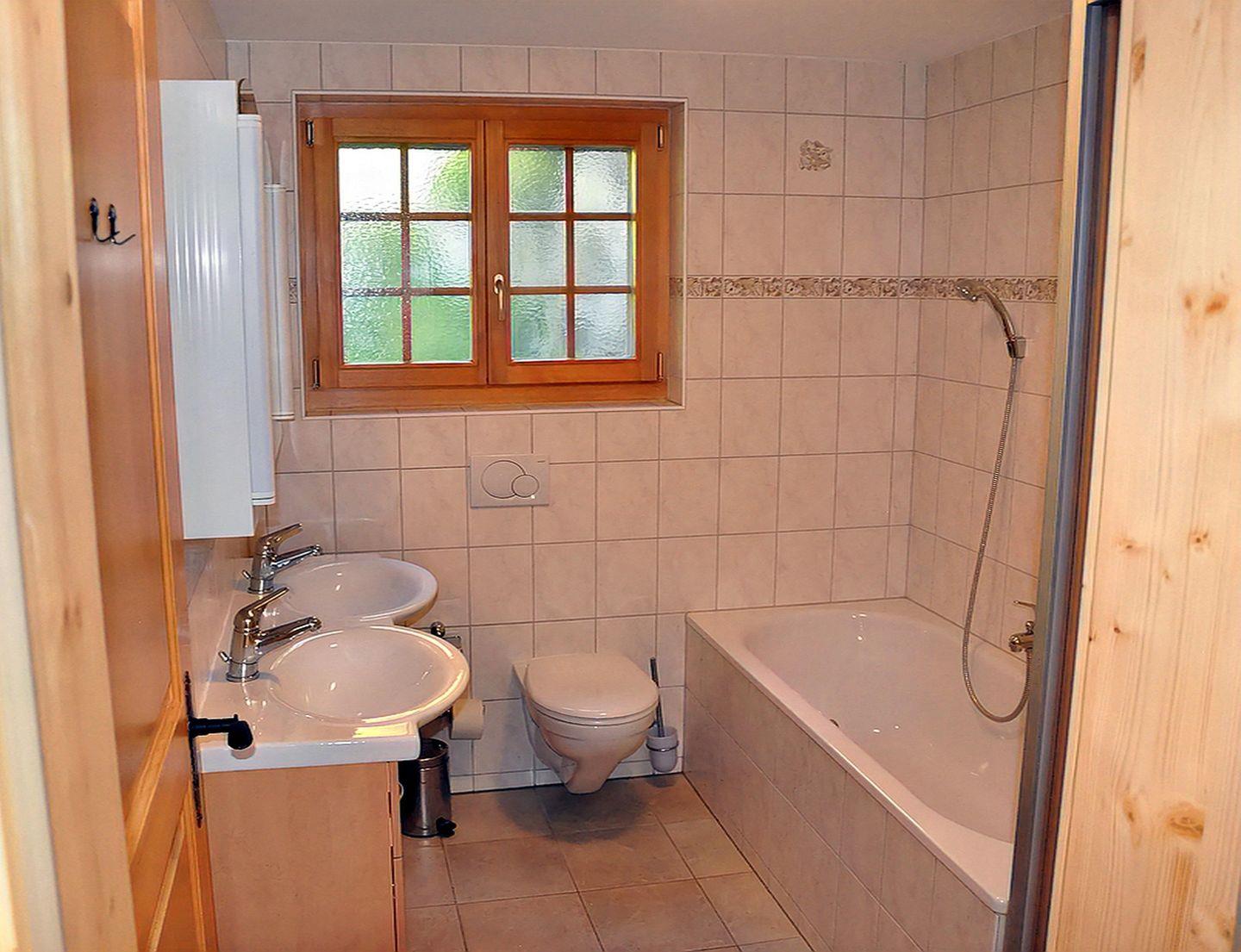 Zweites Badezimmer mit Badewanne, Waschbecken und Toilette, liegt im Erdgeschoss.