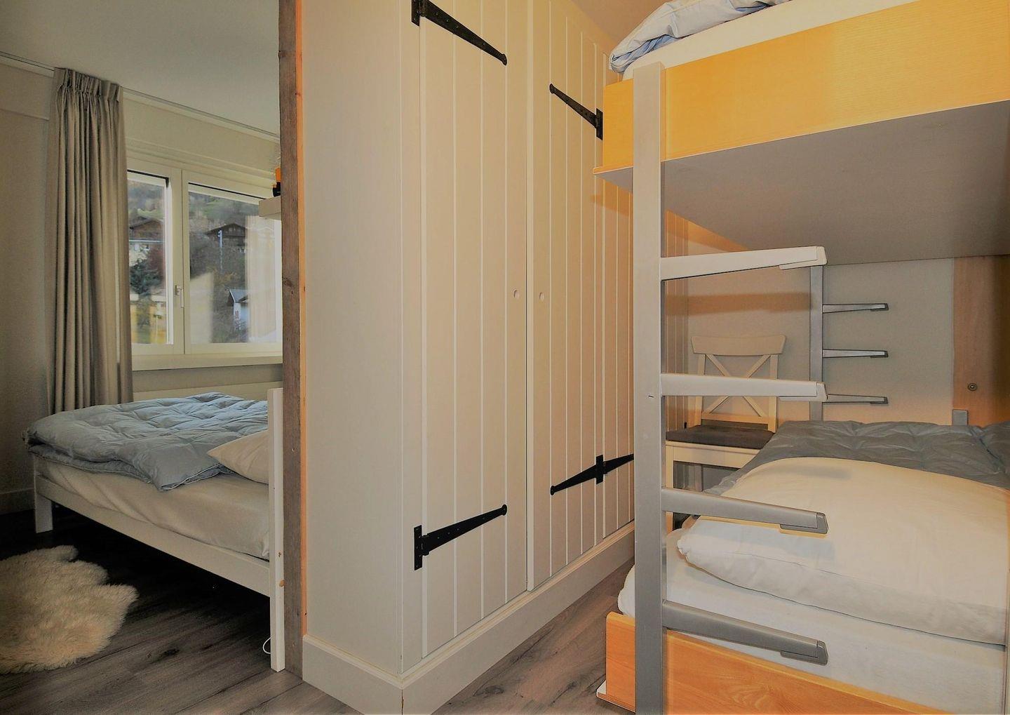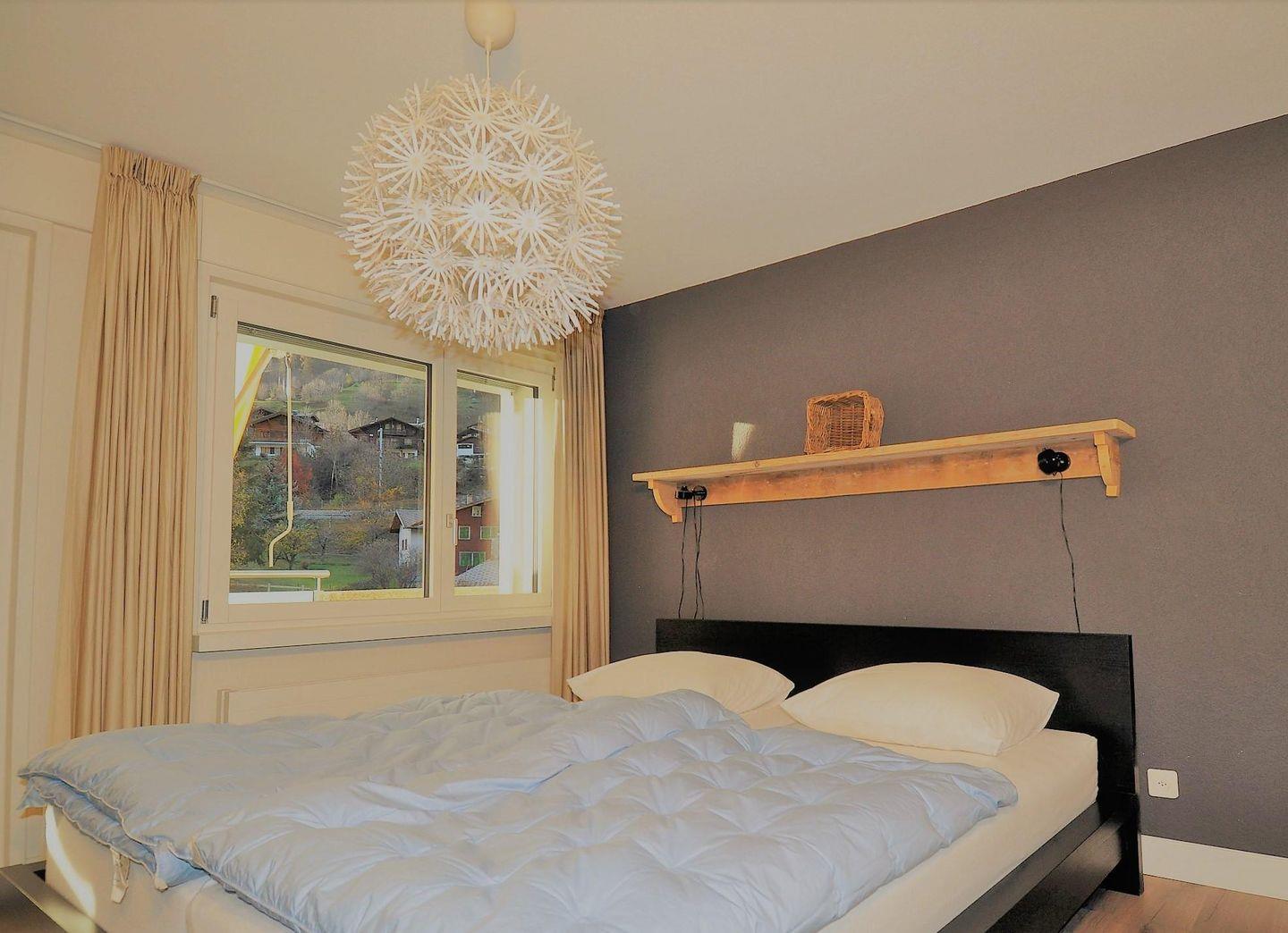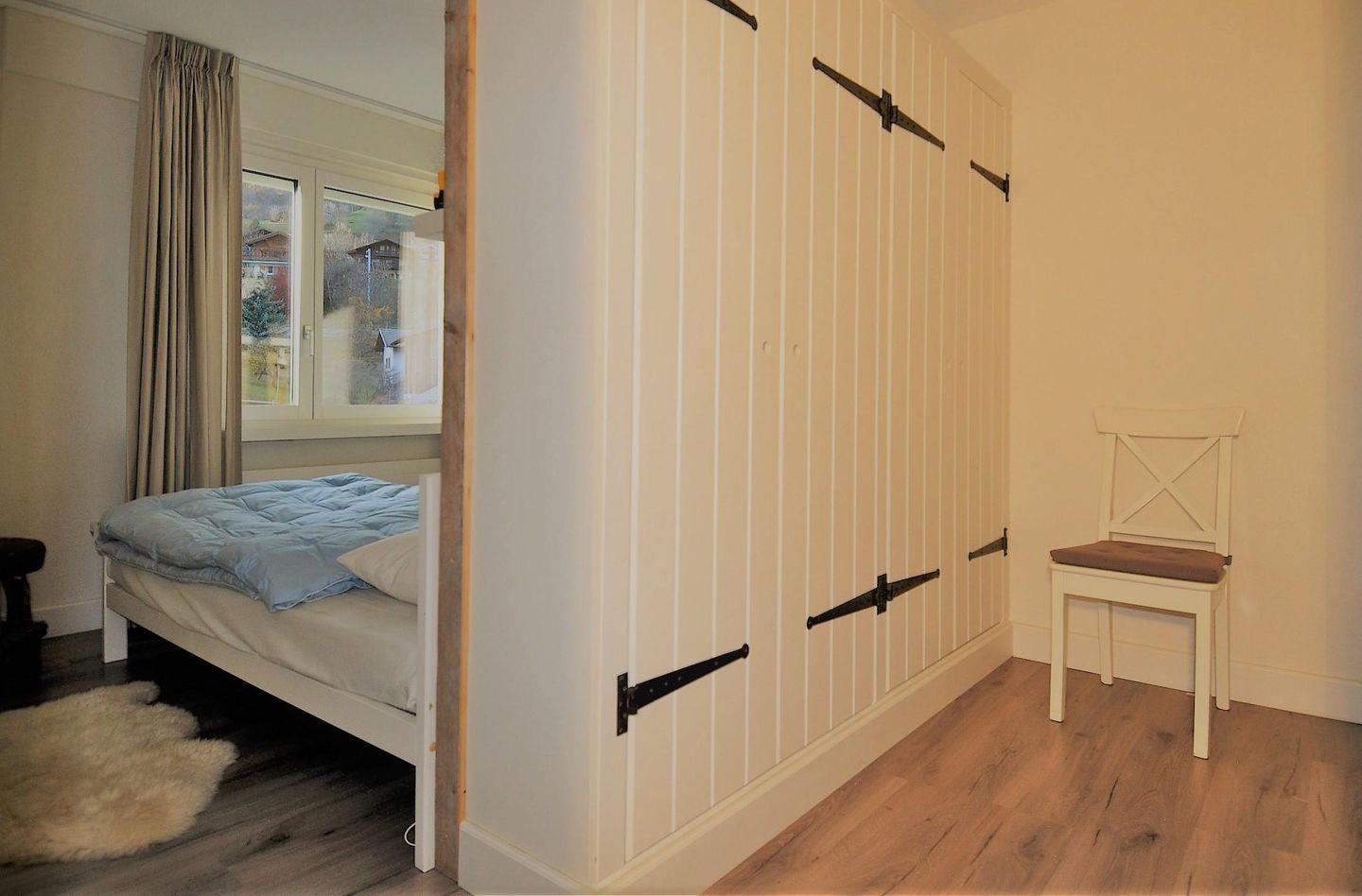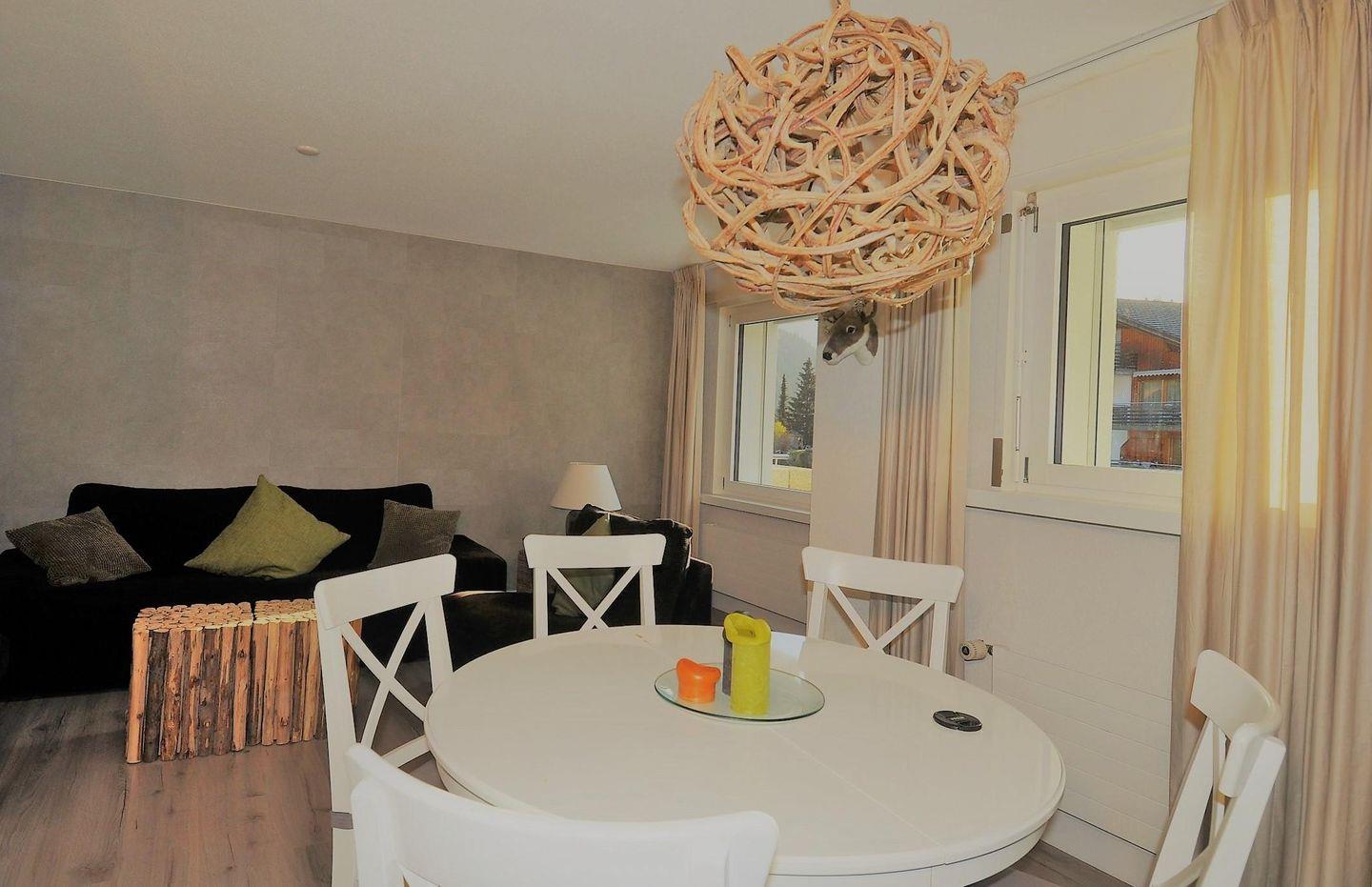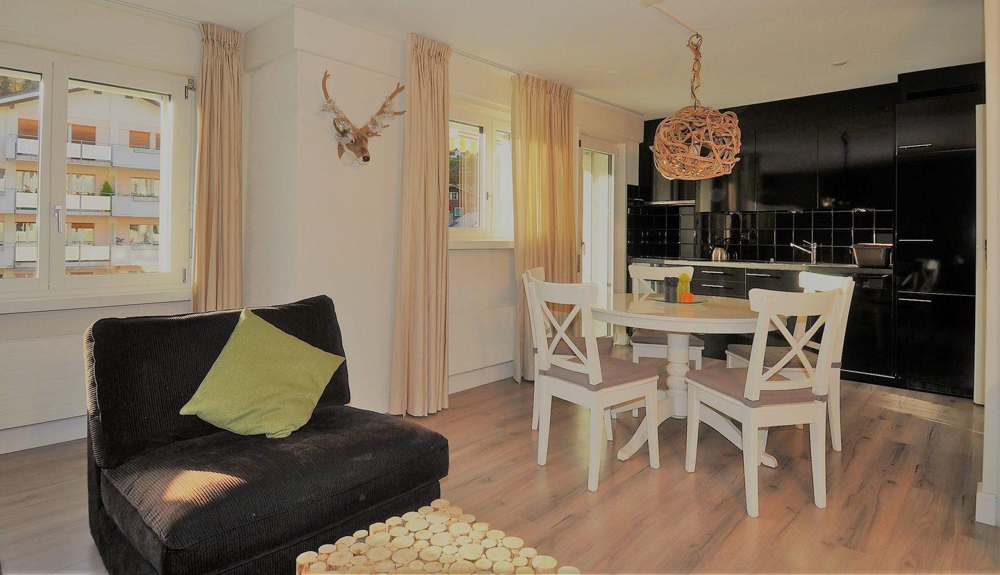 Die 3.5-Zimmerwohnung liegt im 2. Stock, ist behaglich eingerichtet und bequem mit Lift zu erreichen. Die Wohnung hat eine Fläche von 80m2. Sie ist folgendermassen ausgestattet: Wohnzimmer mit Sitzecke, Stereoanlage mit CD/DVD, TV, Radio und WiFi und Schreibtischecke. Küche mit Elektroherd, Spülmaschine, Backofen, Kühlschrank mit Gefrierfach, Kaffeemaschine, Wasserkocher. Ein Schlafzimmer mit Doppelbett und ein Schlafzimmer mit 2 Betten und ein Kajuttenbett. 2 Badezimmer, 1 Mal Badewanne / WC und Waschbecken und 1 Mal mit Dusche/ WC und Waschbecken. Die Wohnung verfügt über einen grossen Balkon. Optimale Ausgangspunkt zum Skilaufen und Wandern. Bahnhof, Seilbahn, Einkaufsmöglichkeiten und Kinderspielplatz sind zu Fuss erreichbar. Ski- und Veloraum im Erdgeschoss, Autoeinstellhalle im Untergeschoss. Platz beschränkt. Das Mehrfamilienhaus hat ein Garten/Liegewiese mit Kinderspielplatz.