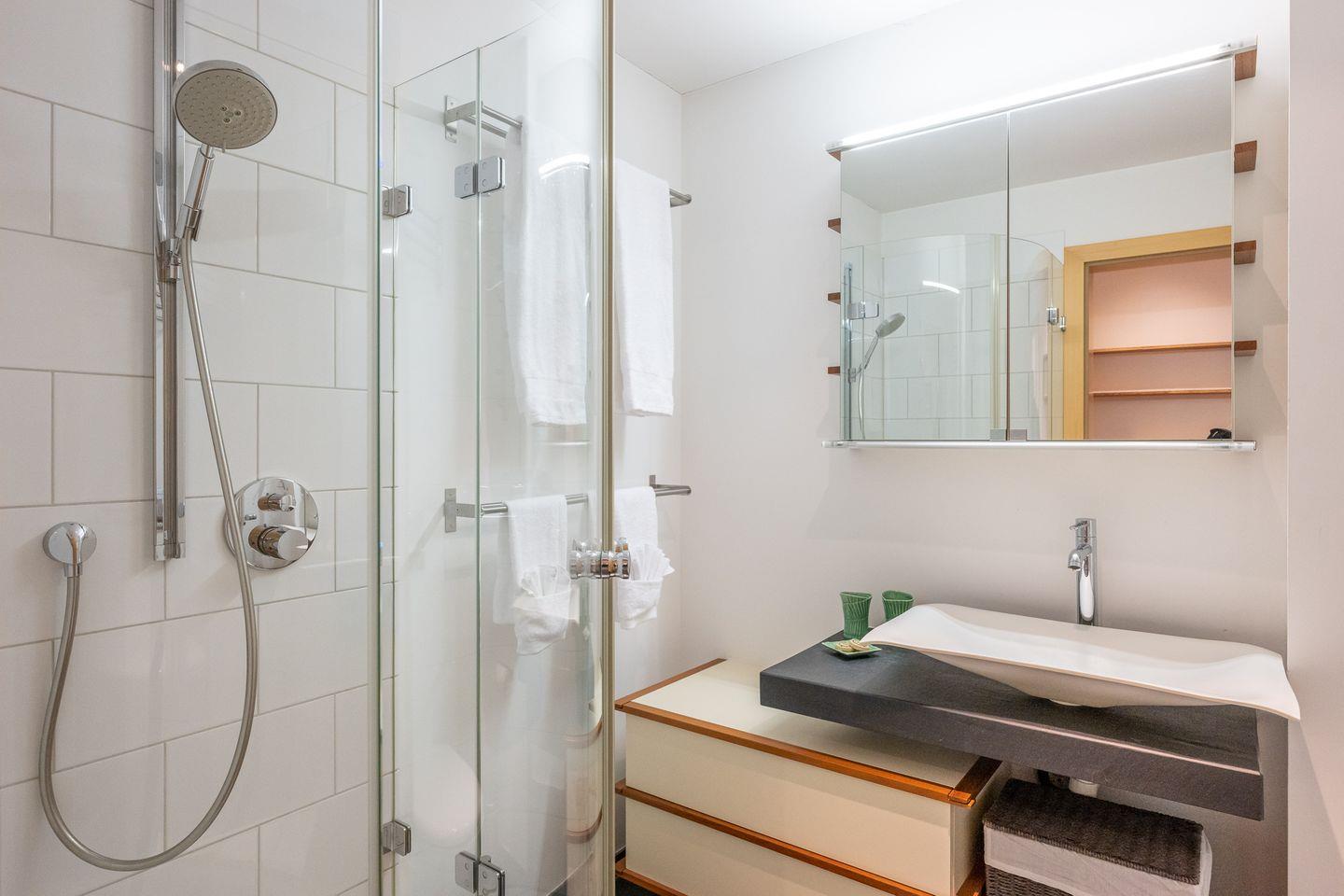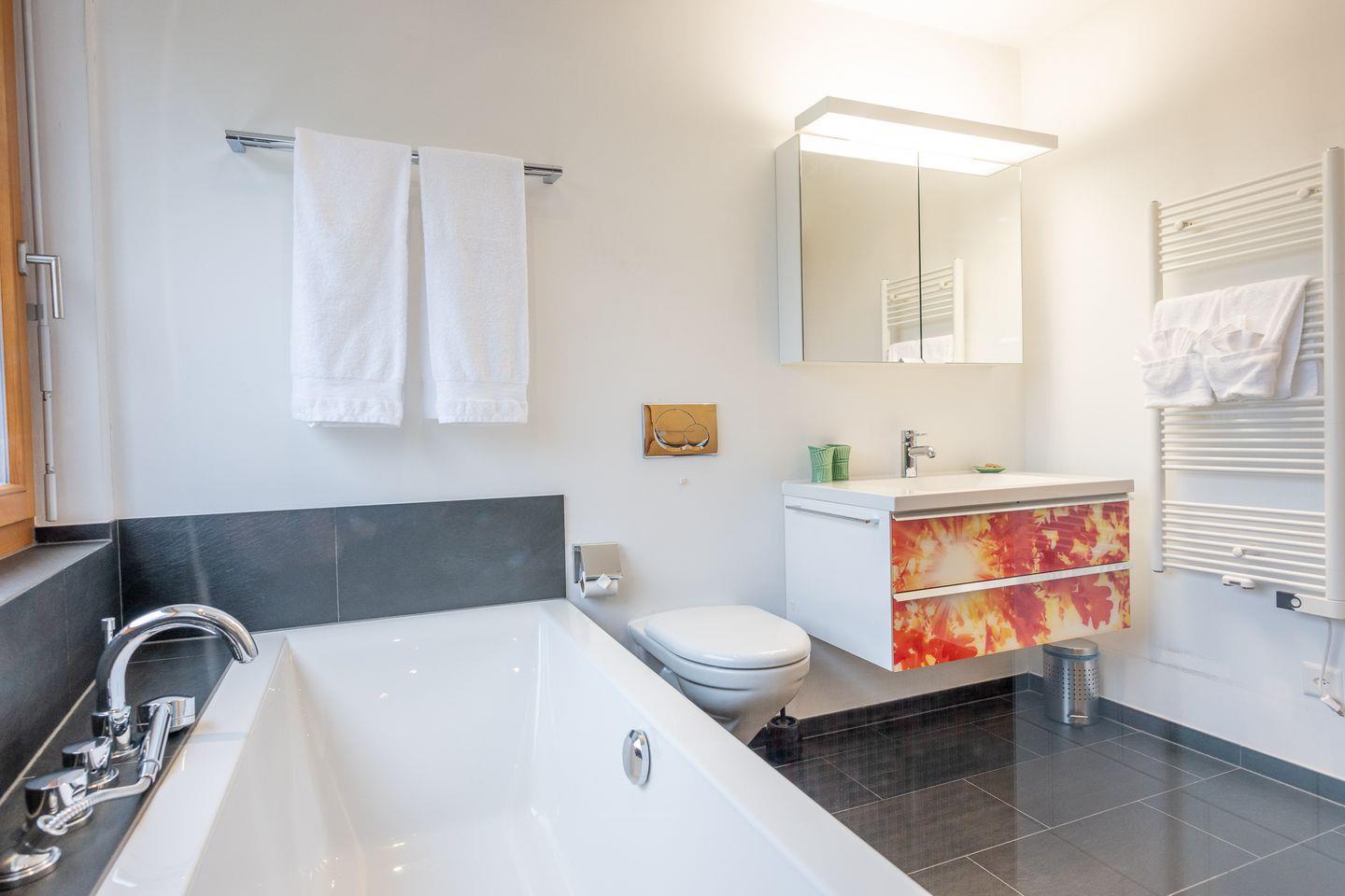 Das barrierefreie Apartment verfügt über ein Schlafzimmer mit Doppelbett und Ensuite Bad mit Badewanne, Dusche und Regenwalddusche, WC und Lavabo sowie einem Schlafzimmer mit zwei Einzelbetten. In diesem Zimmer gibt es eine Auszugsleiter über diese man in ein ca. 10qm grosses Galerie-Dachzimmer gelangt. Dieser Bereich mit gemütlichem Sofa und Tv kann auch als Spielraum genutzt werden wird aber nur grösseren Kindern und/oder Erwachsenen empfohlen, da dieser eben nur durch die Leiter zu erreichen ist. Zusätzlich steht Ihnen im Apartment ein weiteres Bad mit Dusche, Wc, Lavaboo sowie einer Waschmaschine und einem Trockner zur Verfügung.