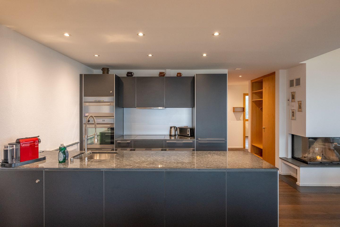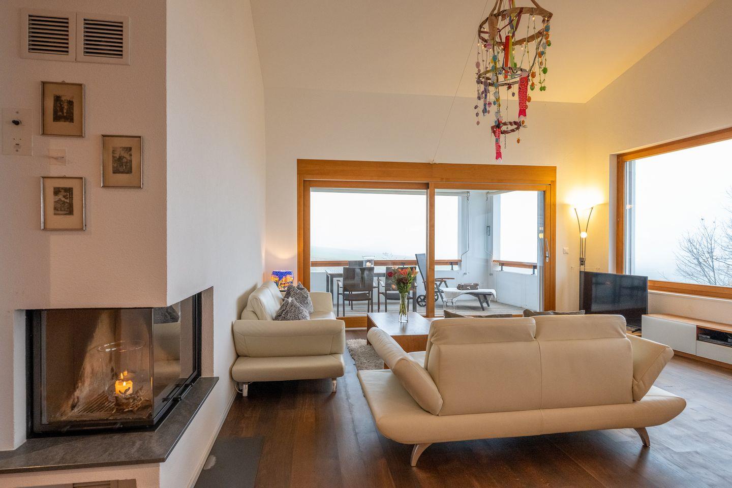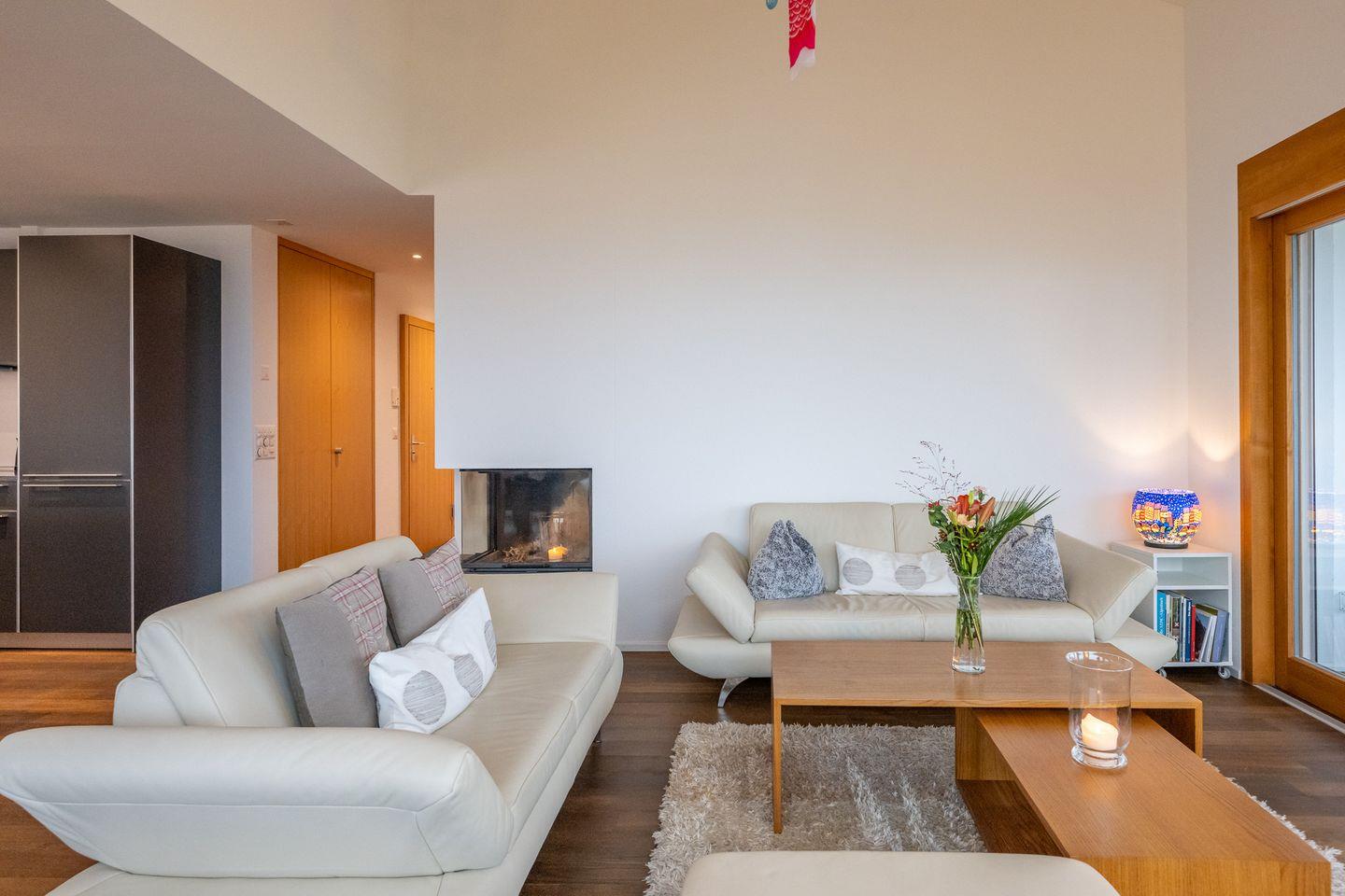 Das Wohnzimmer mit angrenzendem Balkon nach Süd-Osten ausgerichtet, lädt zu gemütlichen Abenden ein und besticht durch seine hohen Decken und die Panoramafenster, welche eine herrliche Sicht auf die umliegende Natur geben. Der dazu gehörige Essbereich und die offene Küche ausgestattet mit Herd, Backofen mit integrierter Mikrowelle, Geschirrspüler und Nespresso Kaffeemaschine, runden das Wohlfühlerlebnis ab. Genießen Sie die wohlige Wärme des Kamins, der jederzeit genutzt werden darf. Bitte beachten Sie, dass das Holz für den Kamin selbst organisiert werden muss.