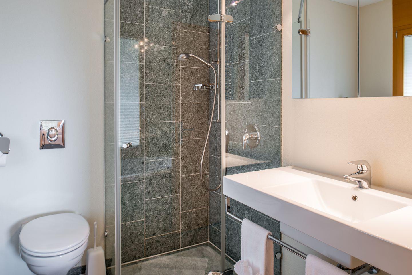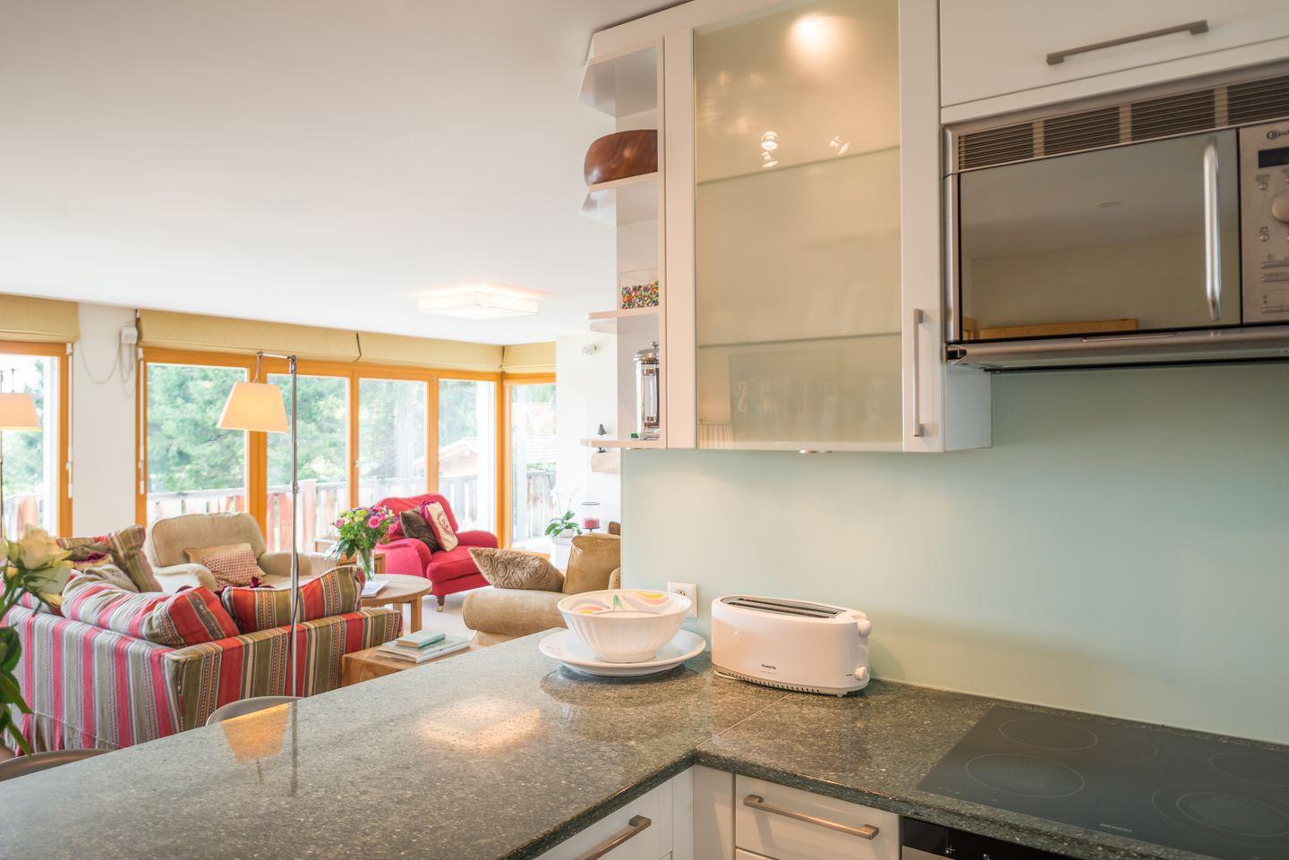 Die luxuriöse Chalet-Wohnung ist stilvoll eingerichtet und hat ein grosses Wohnzimmer in welchem Sie neben dem gemütlichen Sofa ein Flachbild-TV’s mit DVD Player, viele Bücher, DVD’s und Brettspiele finden. In der komplett eingerichtete Küche finden Sie einen Geschirrspüler, Backofen und Herd sowie eine Nespresso-Kapselmaschine, Mikrowelle, Wasserkocher, Toaster, Mixer sowie ein Fondue-Set +Raclette. Der grosse Balkon welcher sich über die ganze Seite der Wohnung erstreckt lädt zu gemütlichen Abenden ein.