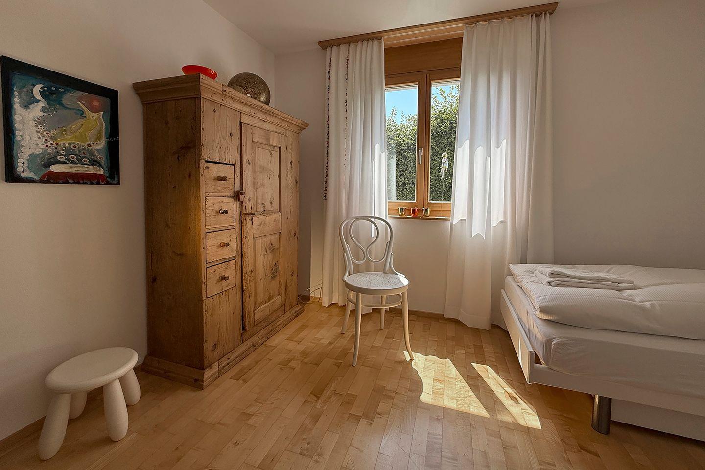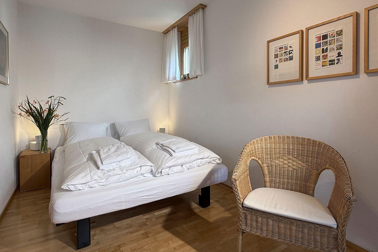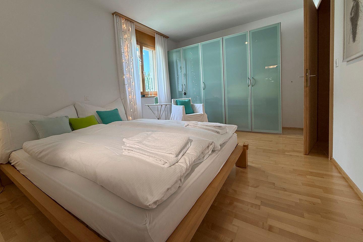 Das Elternschlafzimmer mit Doppelbett (180x200cm) und grossem Kleiderschrank verfügt über ein eigenes Bad/WC. Das zweite Schlafzimmer ist mit 2 Einzelbetten (90x200cm) und einem antiken Schrank ausgestattet und ist direkt neben dem zweiten Badezimmer mit Dusche/WC gelegen. Das dritte Schlafzimmer ist mit einem Französischen Doppelbett (140x200cm), TV-Gerät und Playstation ausgestattet und grenzt an den offenen Wohnraum an, welcher mit einer Schiebetür abgegrenzt werden kann.