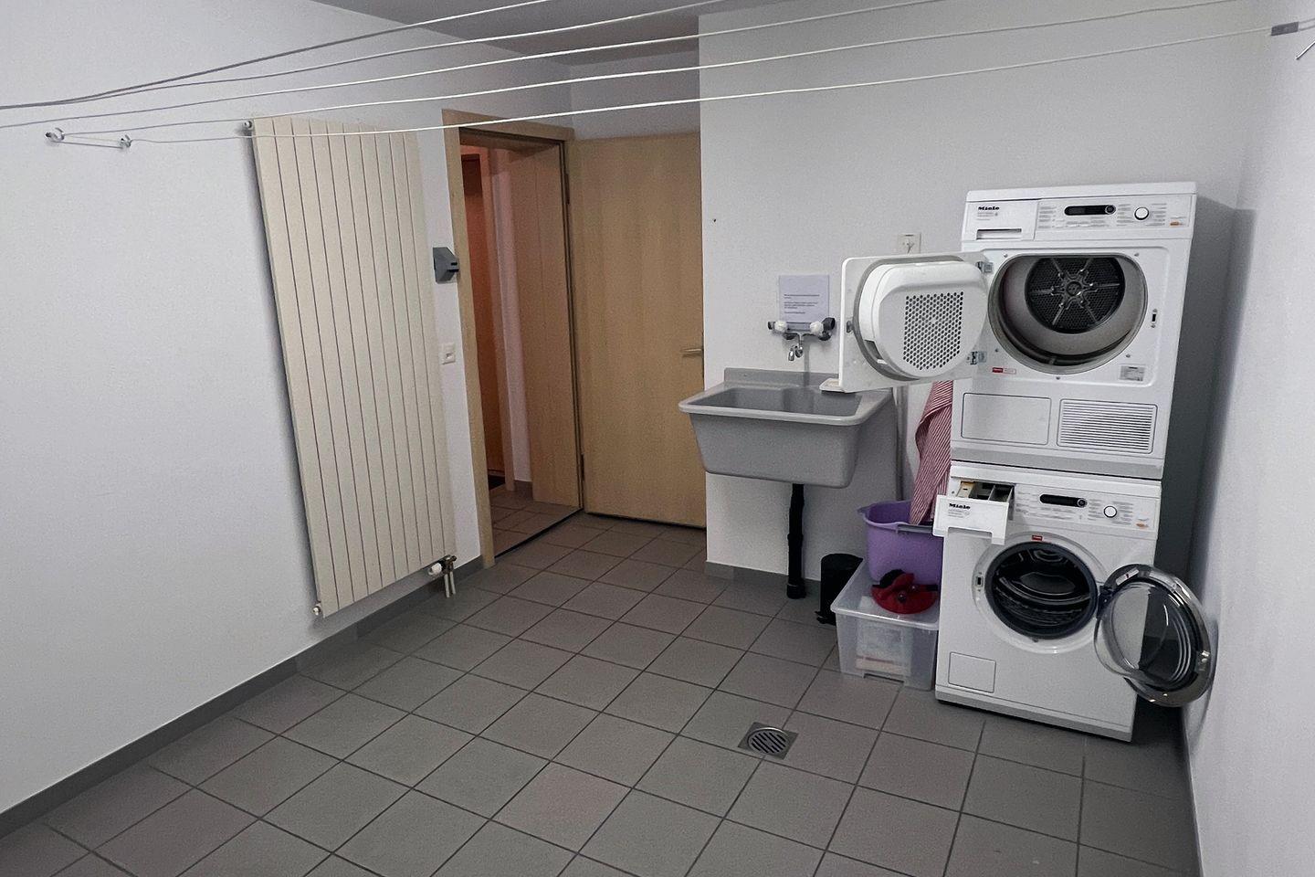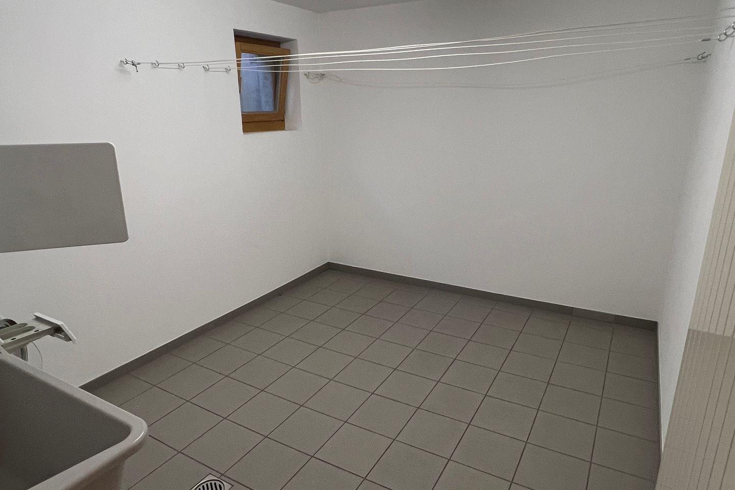 Eine grosszügige Waschküche mit separater Waschmaschine und Wäschetrockner sowie ein abschliessbarer Skiraum werden mit den zwei anderen Parteien im Haus geteilt.