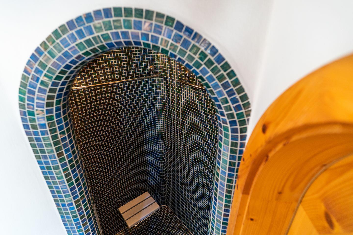 Von hier aus gelangt man mittels einer Treppe in die Turmspitze, in dem sich noch ein solitäres Badezimmer mit einer Dusche, Lavabo und WC unter dem historischen Dach befindet.