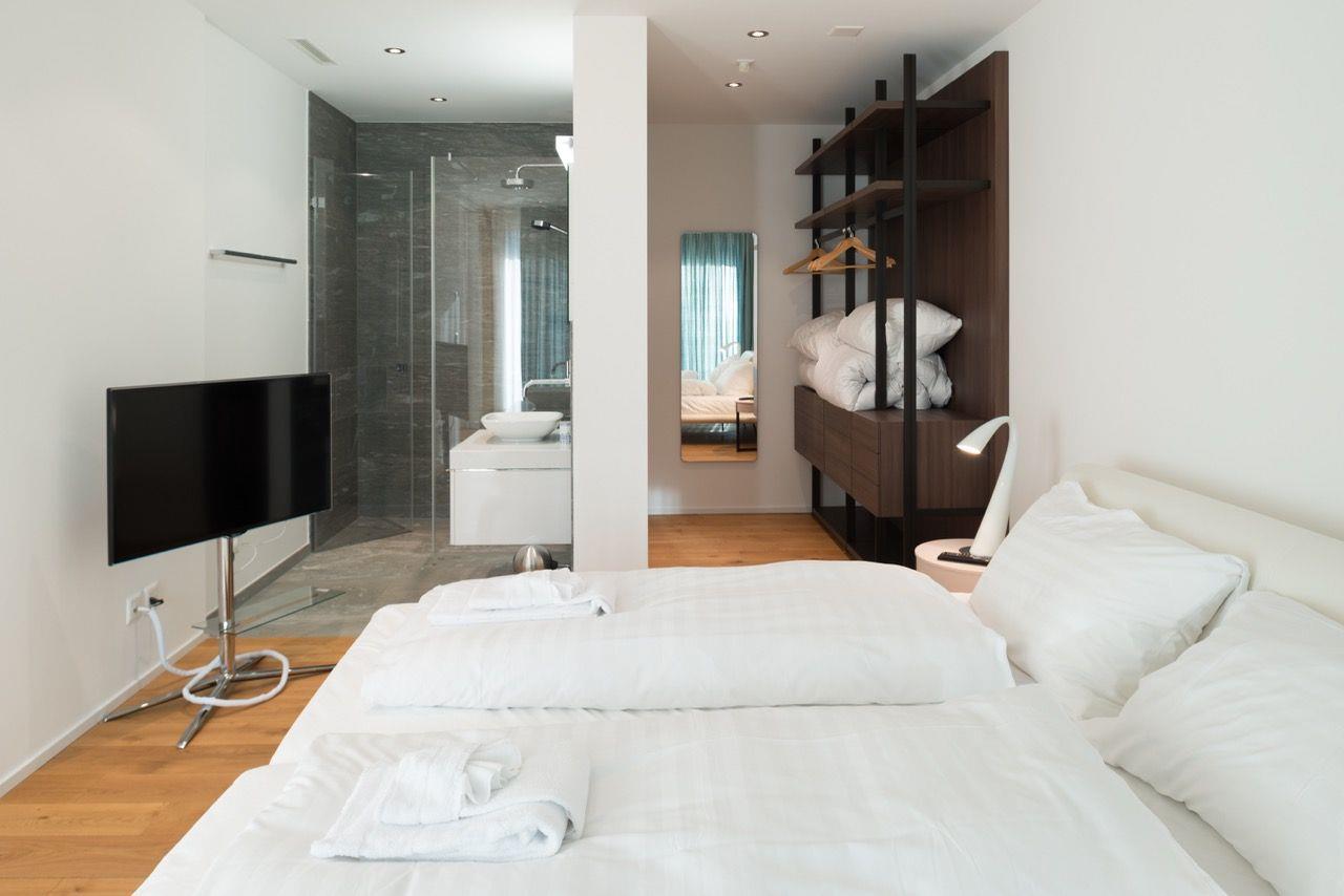 Luxuriöse 4.5 Zimmerwohnung, 3 Schlafzimmer mit TV und jeweils eigenem Badezimmer mit Badewanne (teilweise freistehend im Zimmer) oder Dusche, 240m2 Wohnfläche mit Fussbodenheizung in der Luxus-Ferienwohnungresidenz The Mountain Suites. Nur 10 Gehminuten von der Talstation Flims entfernt. Die Suite ist verfügbar für max. 6 Erwachsene und 2 Kinder. Die Wohnung befindet sich im Hauptteil und liegt im 4. Obergeschoss mit Blickrichtung Nordost und bietet fantastische Aussicht auf die umliegende Bergwelt (Crap Sogn Gion, Tschingelhörner und Flimserstein).