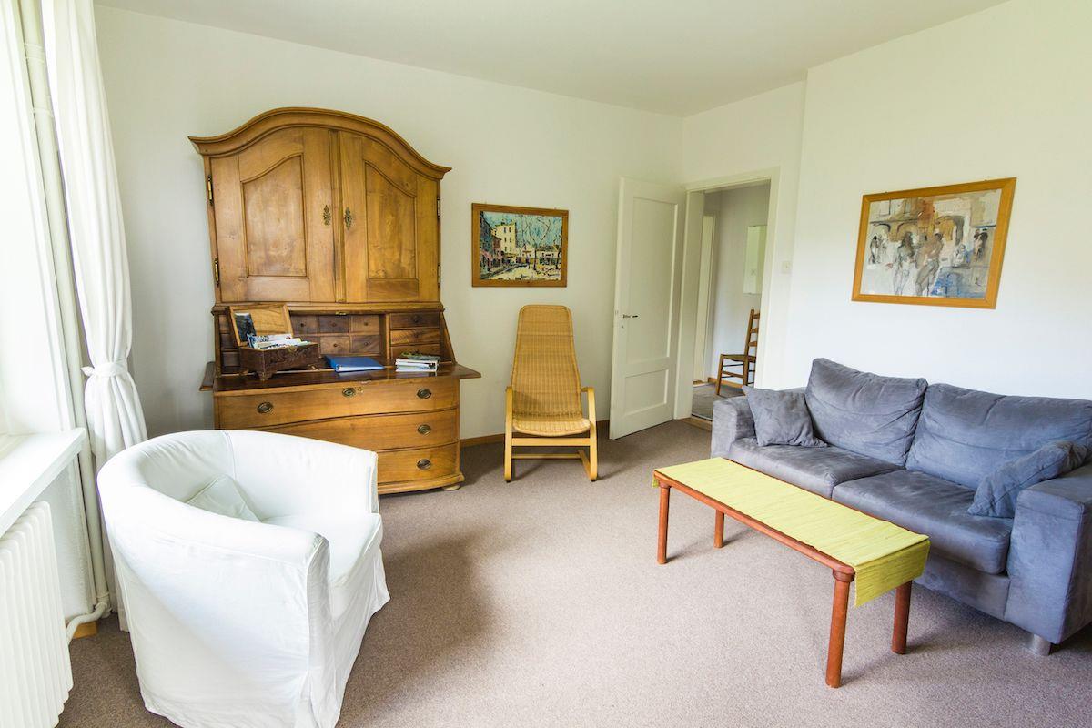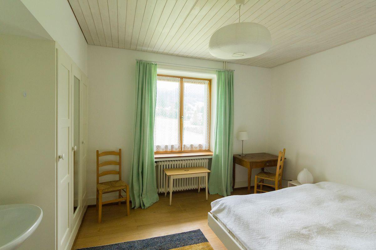 Ein Schlafzimmer ist im Biedermeierstil ausgestattet mit Doppelbett (Speziallänge 2.10m) und Teppichboden. Das zweite Schlafzimmer ist mit einem Doppelbett ausgestattet, mit fliessend Wasser und Holzboden. Das Familienbadezimmer mit Tageslicht verfügt über Badewanne, Dusche, WC sowie Haartrockner. Küche mit Geschirrspüler, Herd und Backofen, Cafétiera, Käsefondueset, Mixer und vielen Küchenutensilien.
