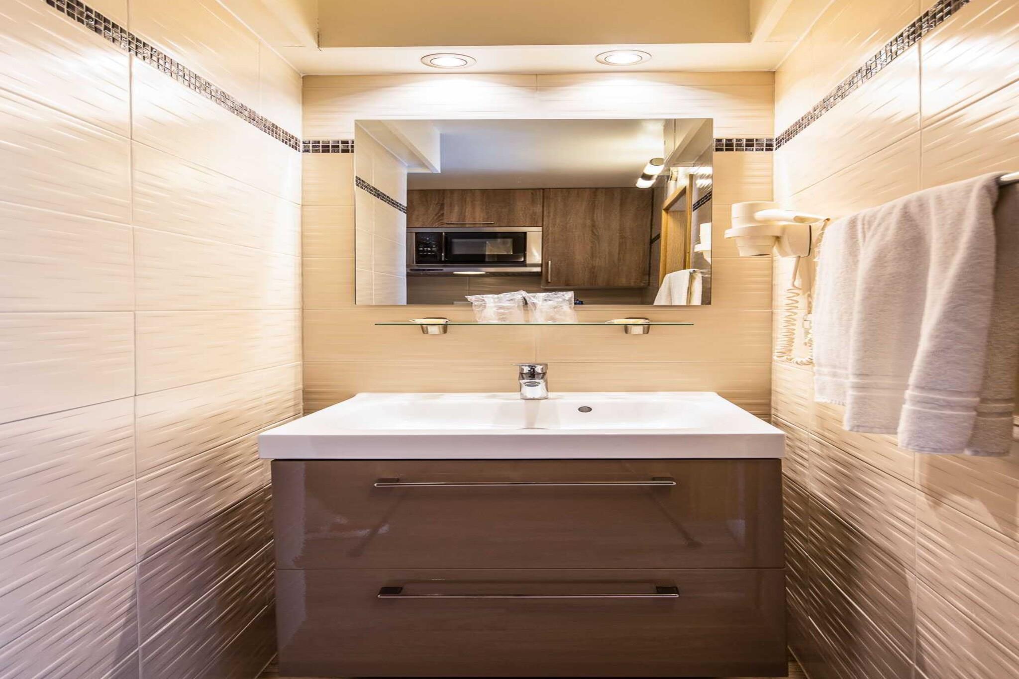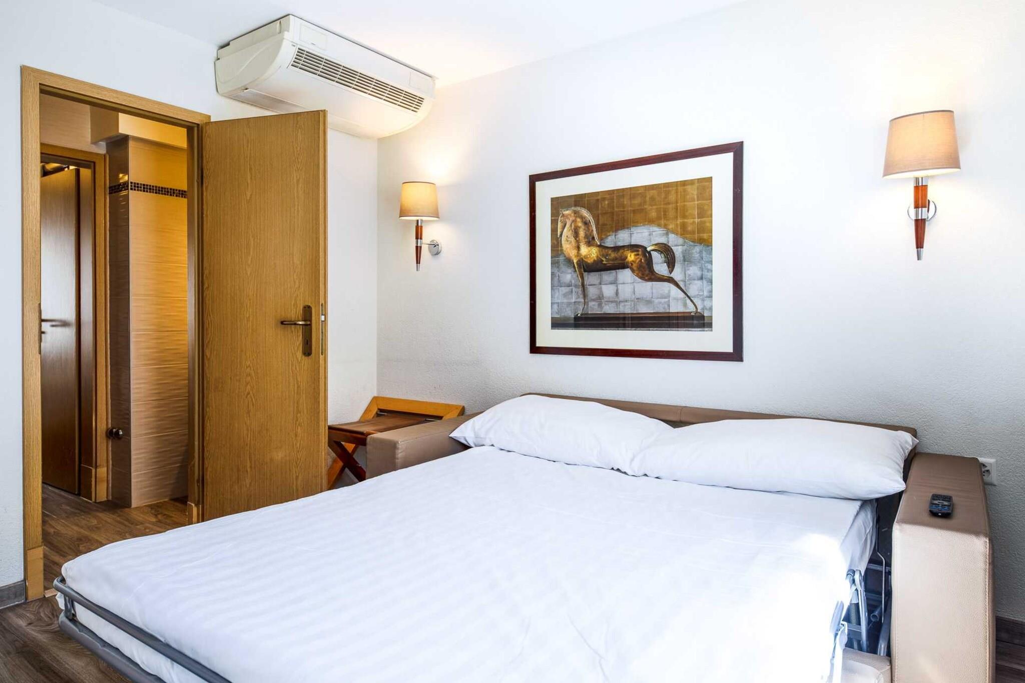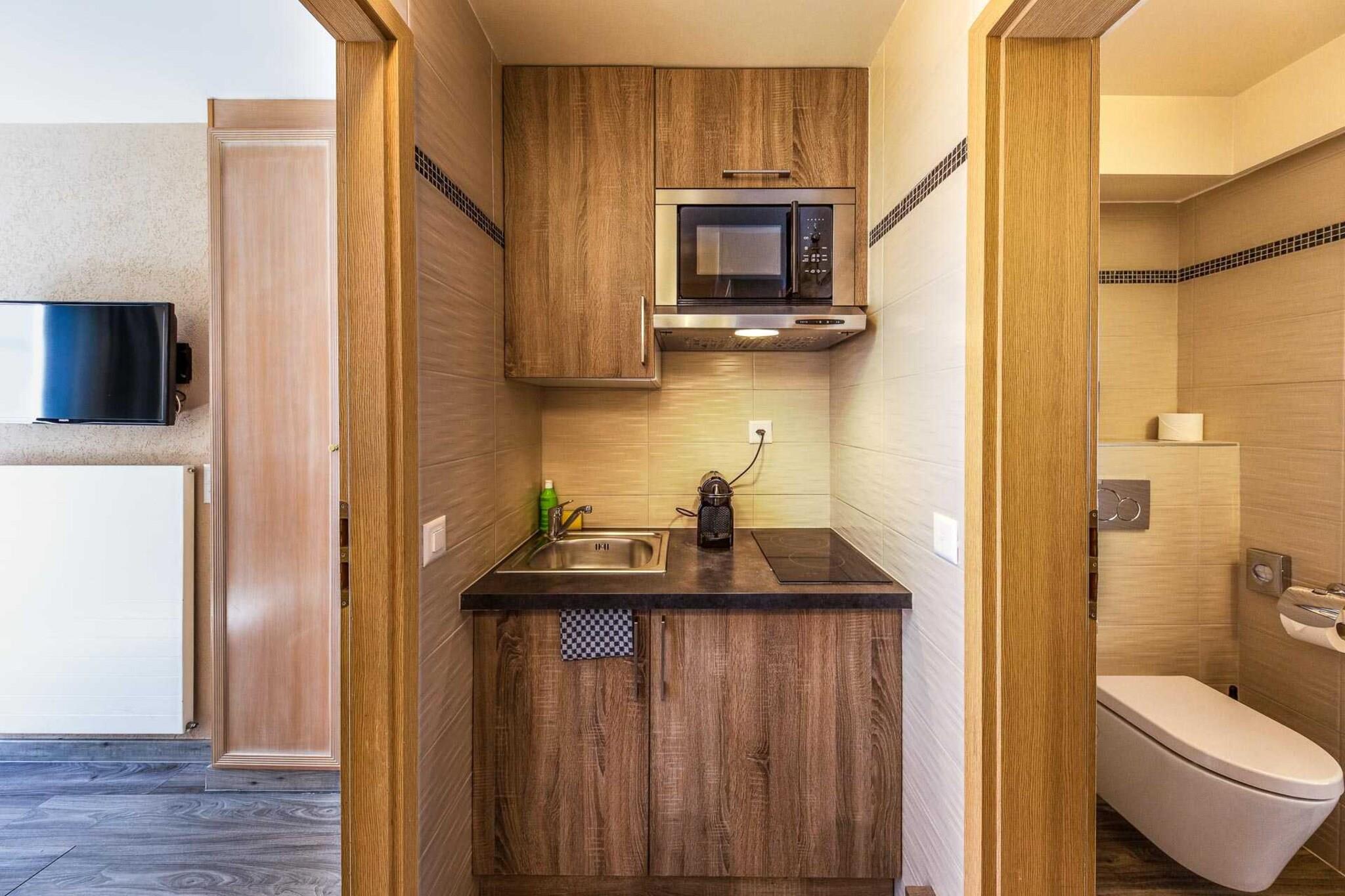 On the 5th floor: (Living room(double sofa bed, TV(flatscreen)), Kitchen(hob, coffee machine, combination microwave, fridge, electric hot plates, dishes and cutlery, Cooking basics, Wine glasses), bedroom(double bed, TV), bathroom(toilet, hairdryer, shampoo, body soap, hot water))