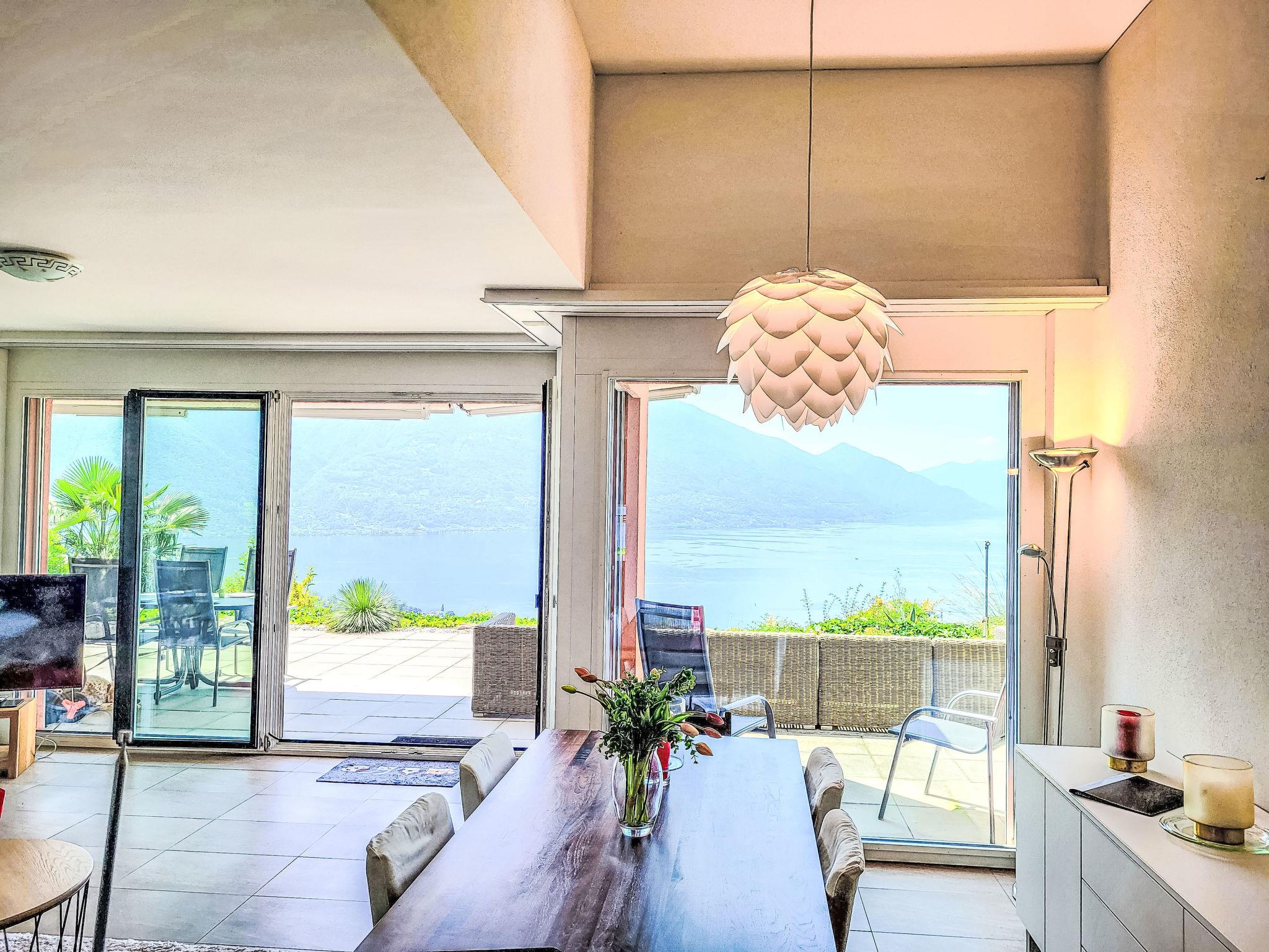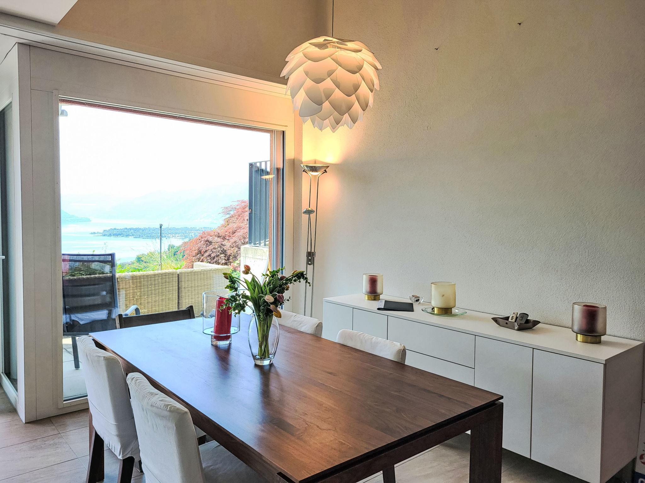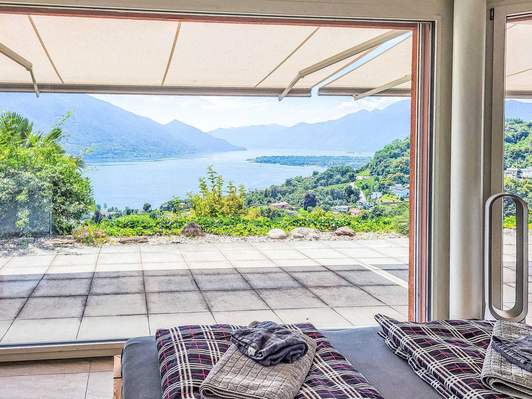 "Residenza Solaria Endless View", 3-room apartment on the ground floor. Object suitable for 2 adults + 2 children. Spacious and bright, comfortable and modern furnishings: open living/dining room with panoramic window with TV and international TV channels. Exit to the terrace. 1 double bedroom with panoramic window with 1 double bed (2 x 90 cm, length 200 cm). Exit to the terrace. 1 double bedroom with 2 beds (90 cm, length 200 cm). Open kitchen (oven, dishwasher, 4 ceramic glass hob hotplates, toaster, kettle, electric coffee machine, Capsules for coffee machine (Nespresso) extra). Bath/shower/WC. Underfloor heating. Natural stone floors. Large patio. Terrace furniture, sitting area. Marvellous panoramic view of the lake, the mountains and the countryside. Facilities: washing machine, dryer, hair dryer. Internet (WiFi, free). Parking space n Interhome at the house. Please note: suitable for families. Non-smokers only. Maximum 1 pet/ dog allowed. NL-00012460
