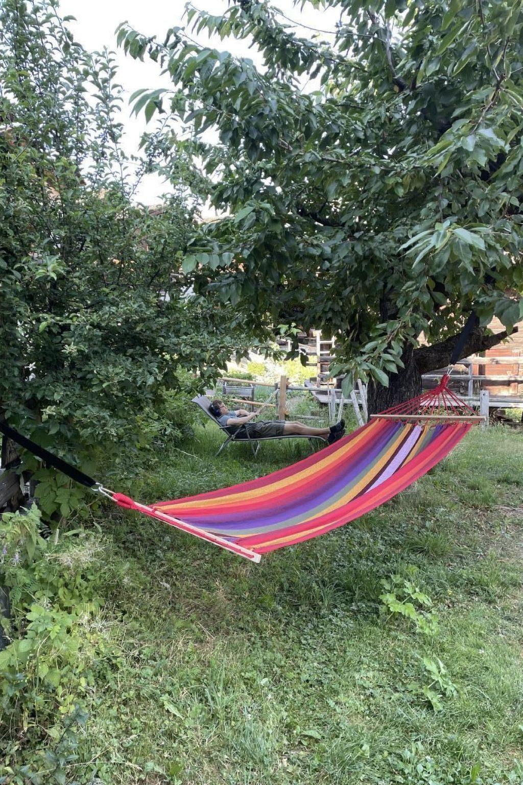 Outside, apart from an organic lawn and a cherry tree, there is a table for 10 people and a grill. Two deckchairs and a hammock are available on request.