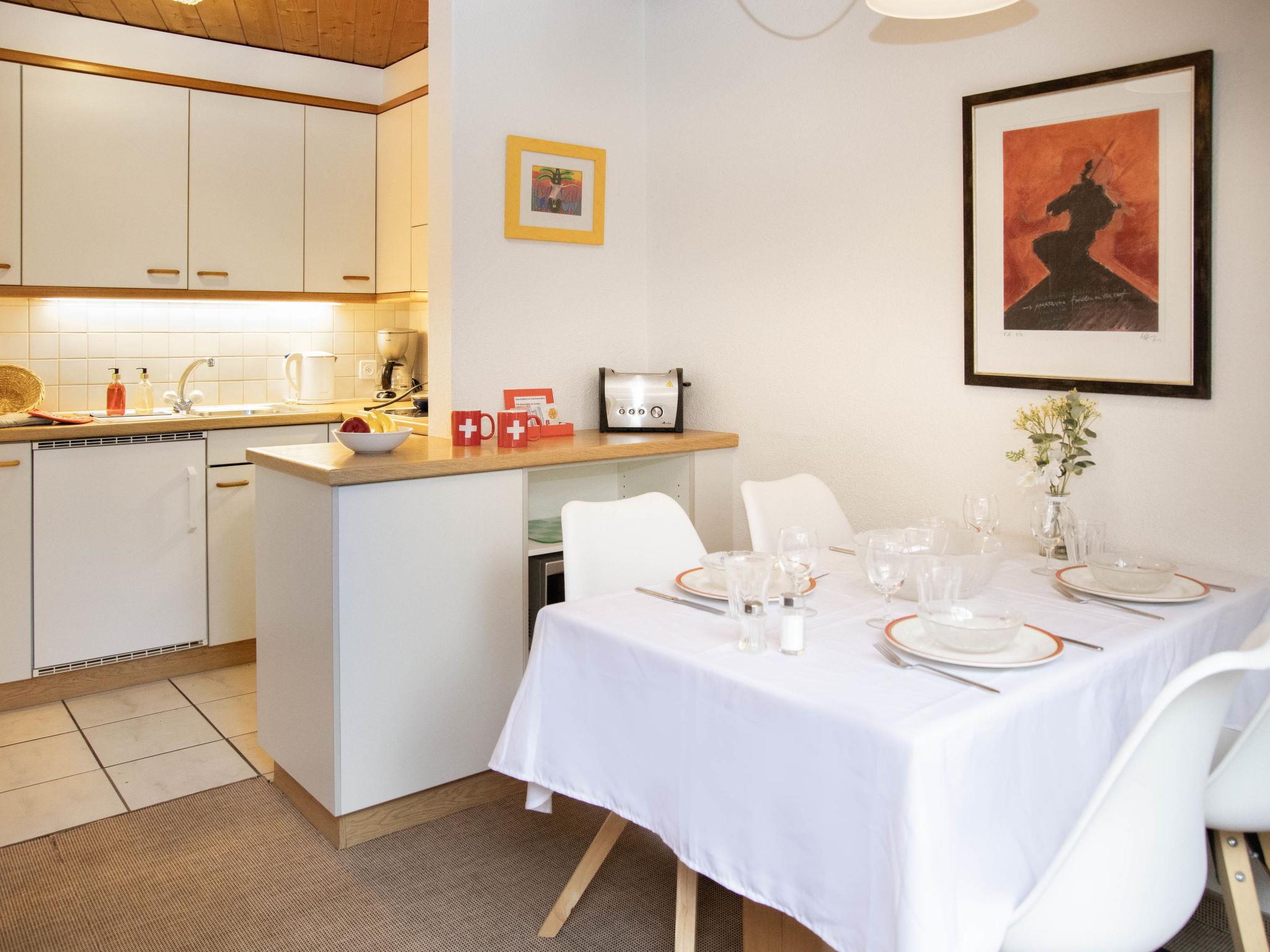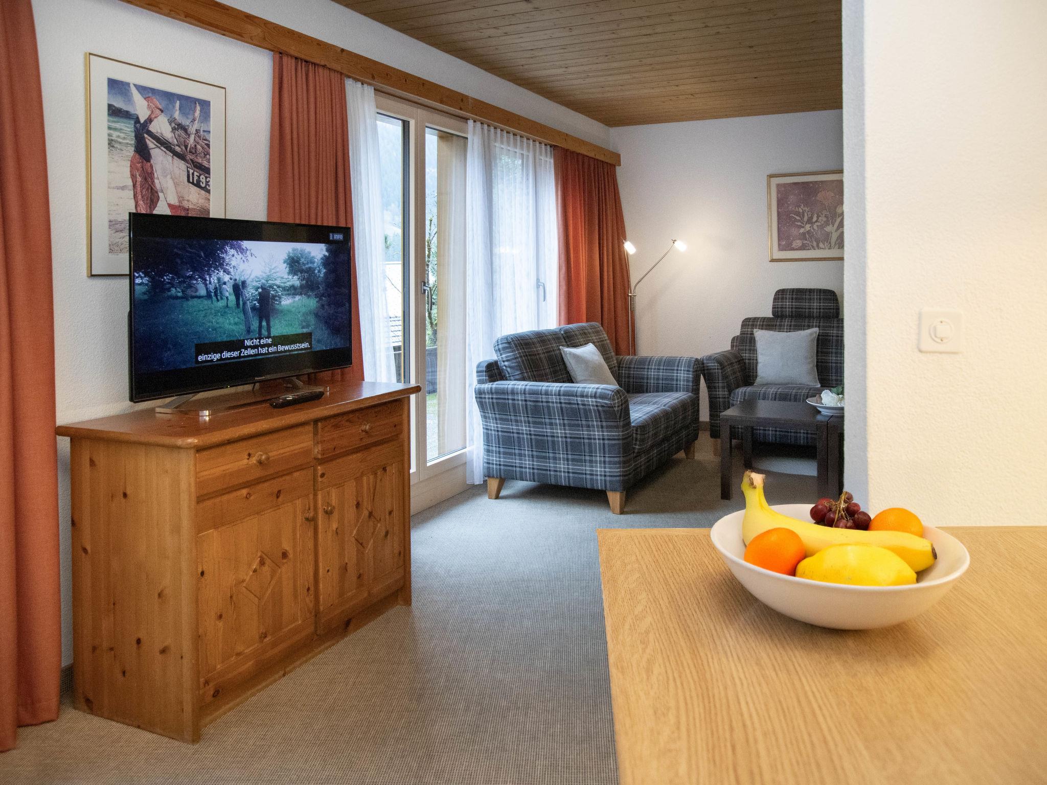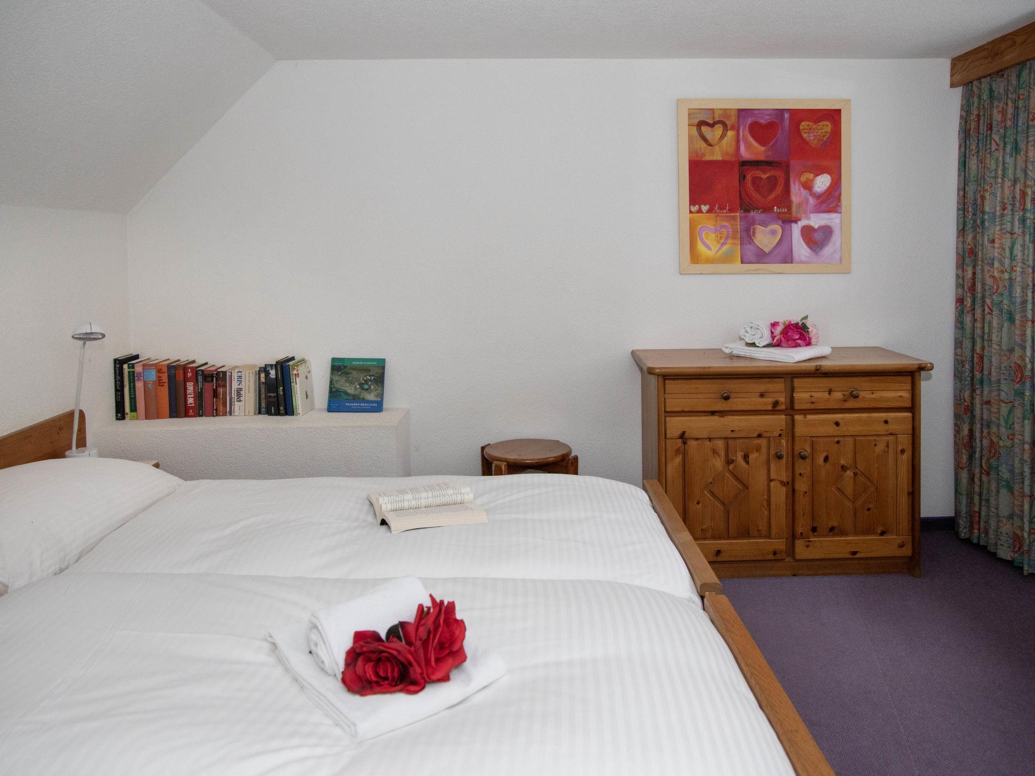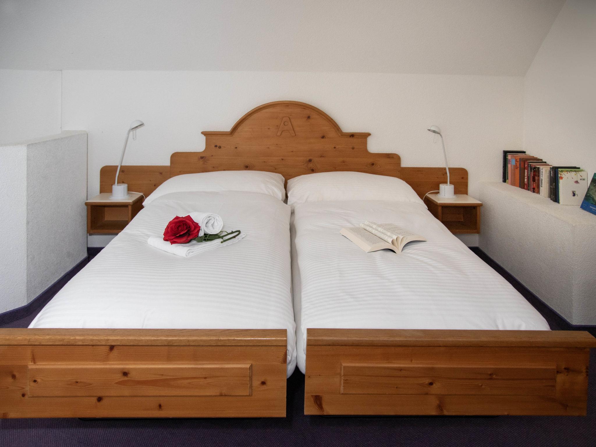 3-room apartment 62 m2 on 2 levels on 1st floor, east facing position. Living/dining room with cable TV (flat screen). 1 double bedroom. Open kitchen (oven, 4 ceramic glass hob hotplates, toaster, kettle, electric coffee machine, Capsules for coffee machine (Nespresso) extra). Bath/WC. Floor heating. Upper floor: 1 double bedroom. Terrace, east facing position. Terrace furniture. View of the mountains. Facilities: hair dryer. Internet (WiFi, free). Please note: non-smokers only. Maximum 1 pet/ dog allowed. A fondue set (meat or cheese) and a raclette oven can be borrowed from reception.