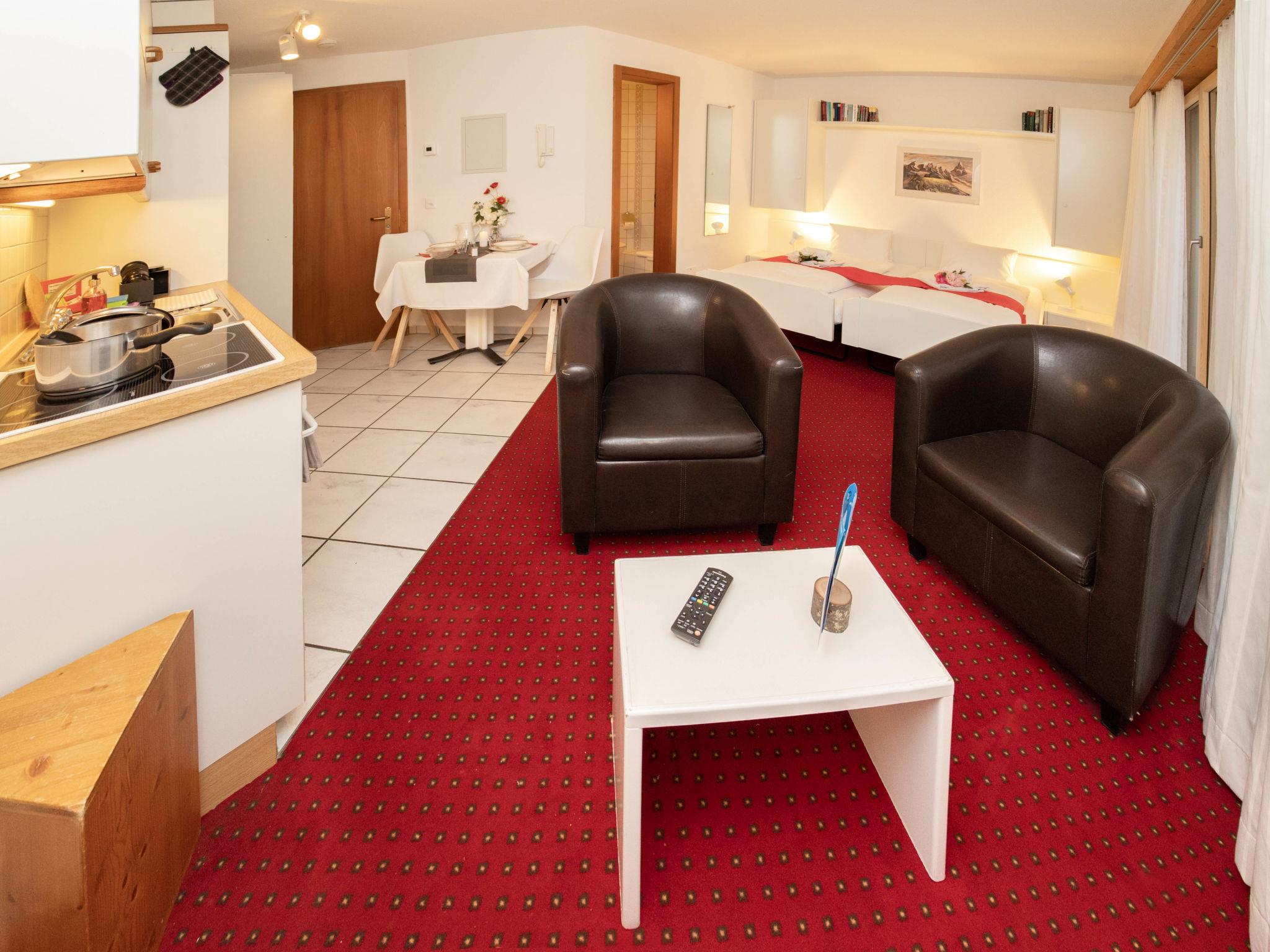 1-room apartment 22 m2 on 2nd floor. Living/dining room with 2 beds and cable TV (flat screen). Kitchenette (oven, 4 ceramic glass hob hotplates, toaster, kettle, electric coffee machine). Shower/WC. Floor heating. No view. Facilities: hair dryer. Internet (WiFi, free). Please note: apartment courtyard side. Non-smokers only. Maximum 1 pet/ dog allowed. A fondue set (meat or cheese) and a raclette oven can be borrowed from reception.