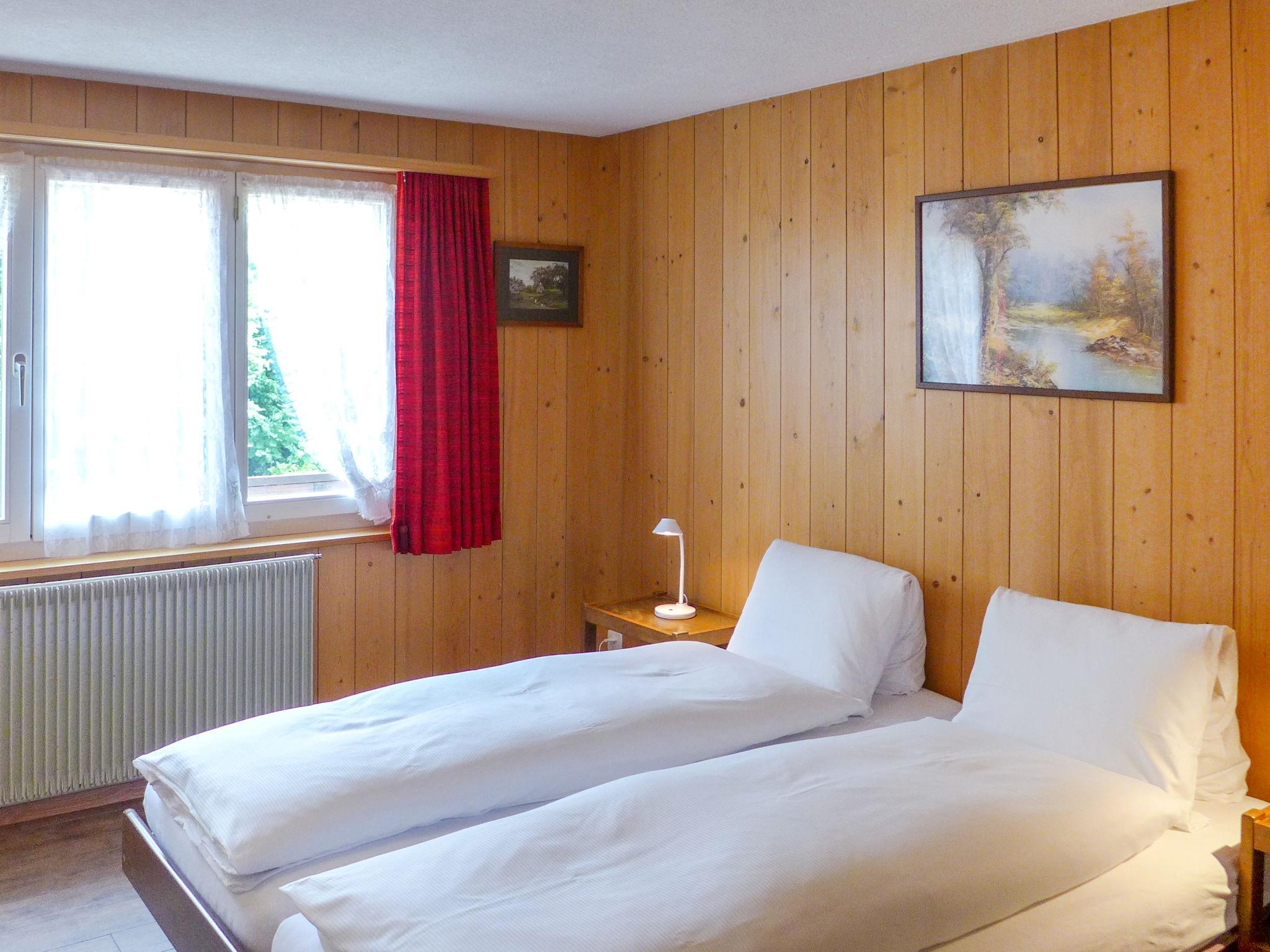 3-room apartment 65 m2 on 1st floor, south facing position. Simple and cosy furnishings: living/dining room with satellite TV. 2 rooms, each room with 2 beds (90 cm, length 200 cm). Kitchen (3 hot plates, oven, dishwasher, electric coffee machine, raclette grill, fondue Set (cheese)). Bath/WC. Sitting area. Beautiful view of the mountains and Eiger. Facilities: Internet (WiFi, free). Parking at the house. Please note: apartment street side. Non-smokers only. Private entrance, fire extinguisher.