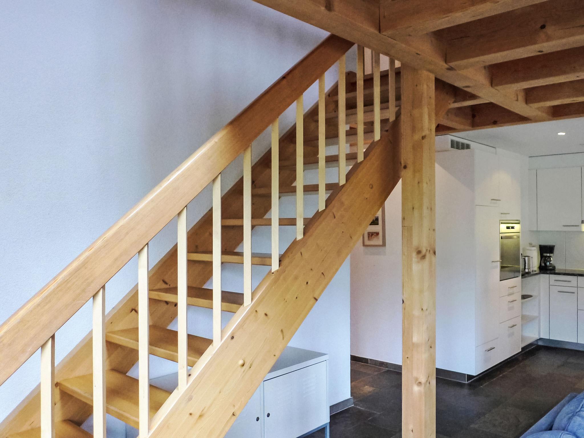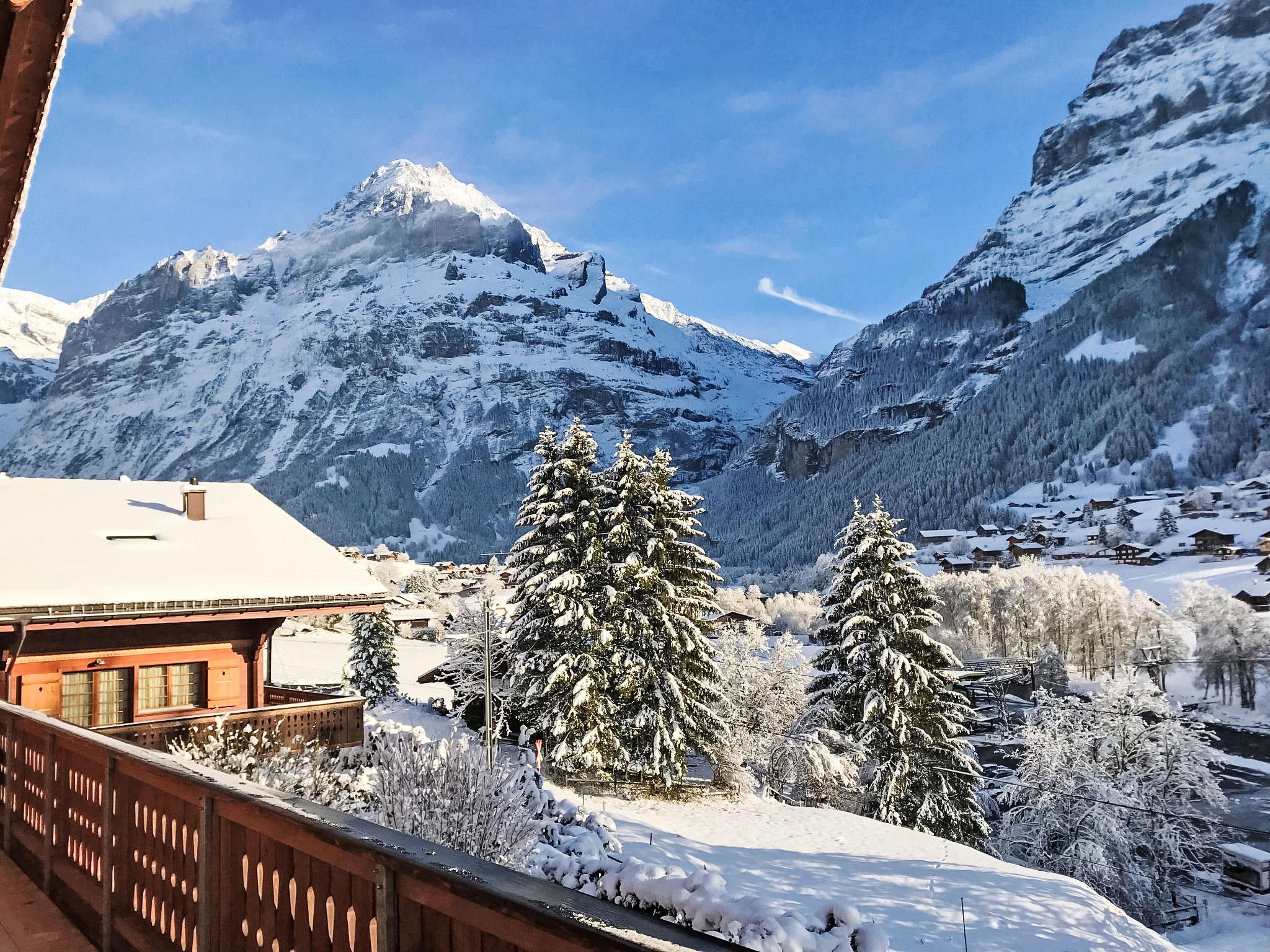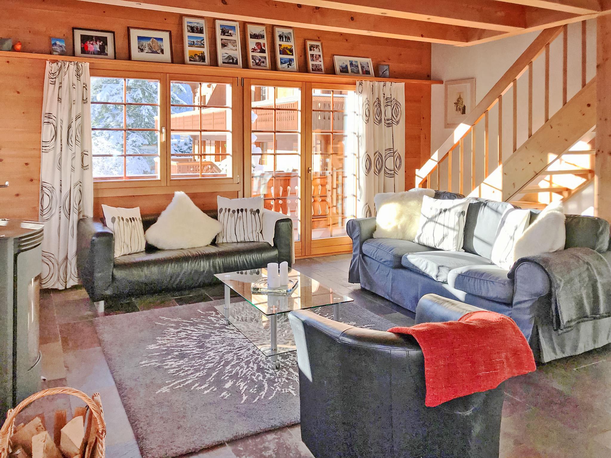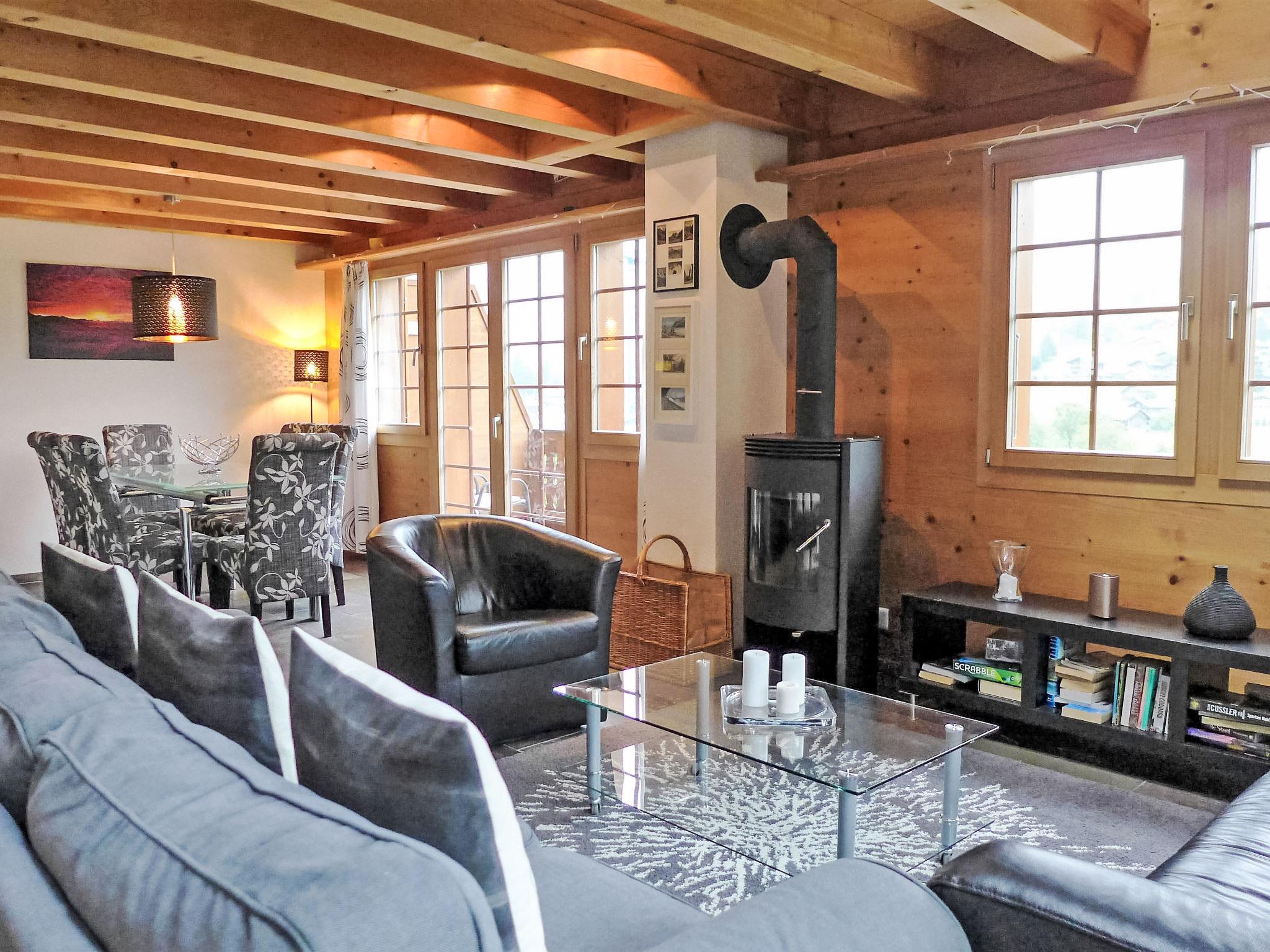 4-room penthouse 126 m2 on 2 levels on 1st floor, south facing position. Partly with sloping ceilings, comfortable and cosy furnishings: living/dining room with Scandinavian wood stove and cable TV (flat screen), radio, CD-player and DVD. Exit to the balcony, south facing position and west facing position. 1 room with 2 beds (90 cm, length 200 cm). Open kitchen (oven, dishwasher, 4 ceramic glass hob hotplates, toaster, kettle, microwave, electric coffee machine, Capsules for coffee machine (Nespresso) extra, raclette grill, fondue Set (cheese)). Shower/WC. Floor heating. Upper floor: 1 room with 2 beds (90 cm, length 200 cm). 1 room with 1 french bed (160 cm). Bath/WC. Underfloor heating. Parquet floors, natural stone floors. Balcony 21 m2, south facing position and west facing position. Balcony furniture. Marvellous view of the mountains and Eiger. Facilities: washing machine, dryer, hair dryer. Internet (WiFi, free). Parking space n 10 Leeson (roofed, 1 car). Please note: non-smokers only. Fire extinguisher.