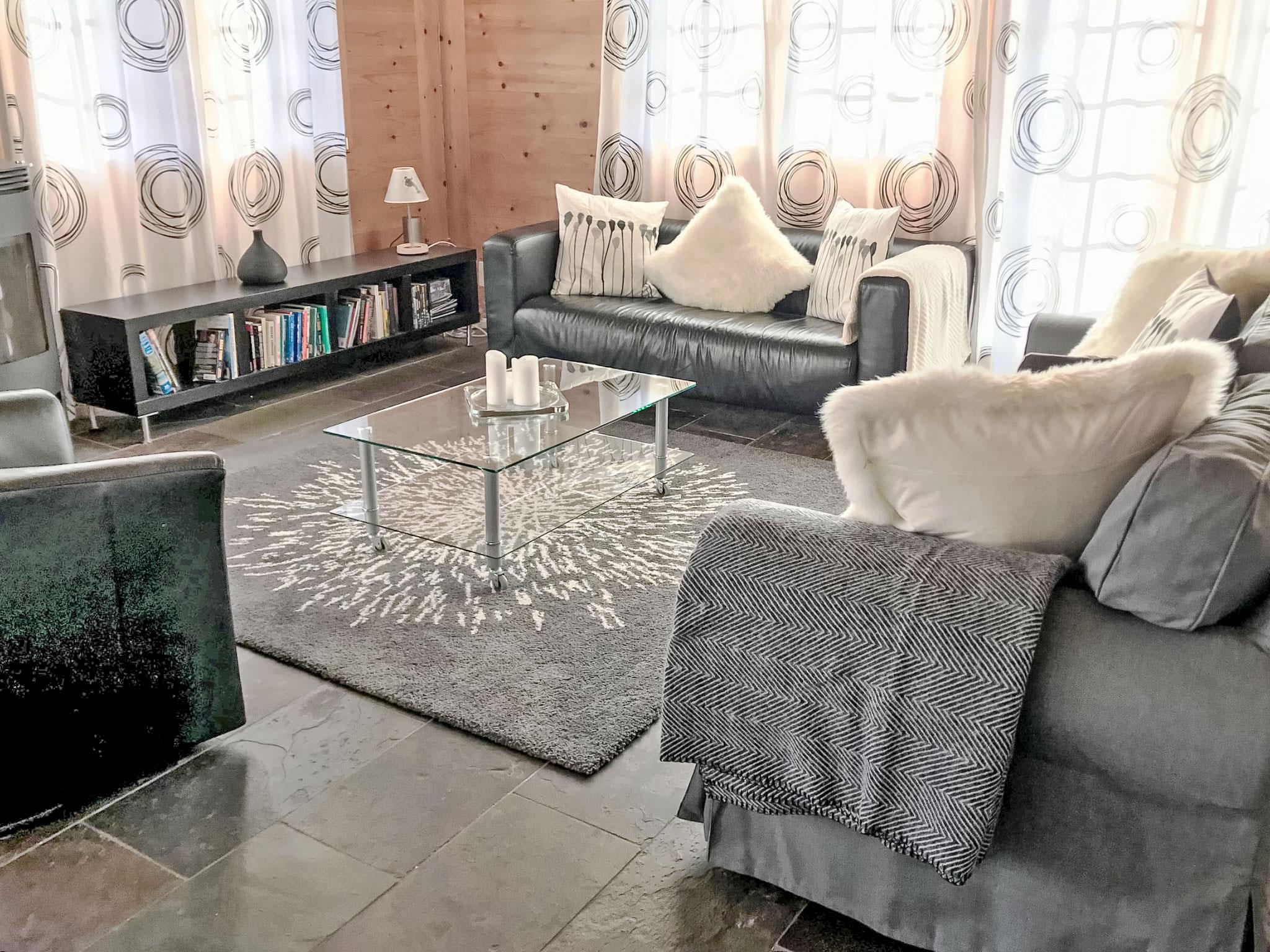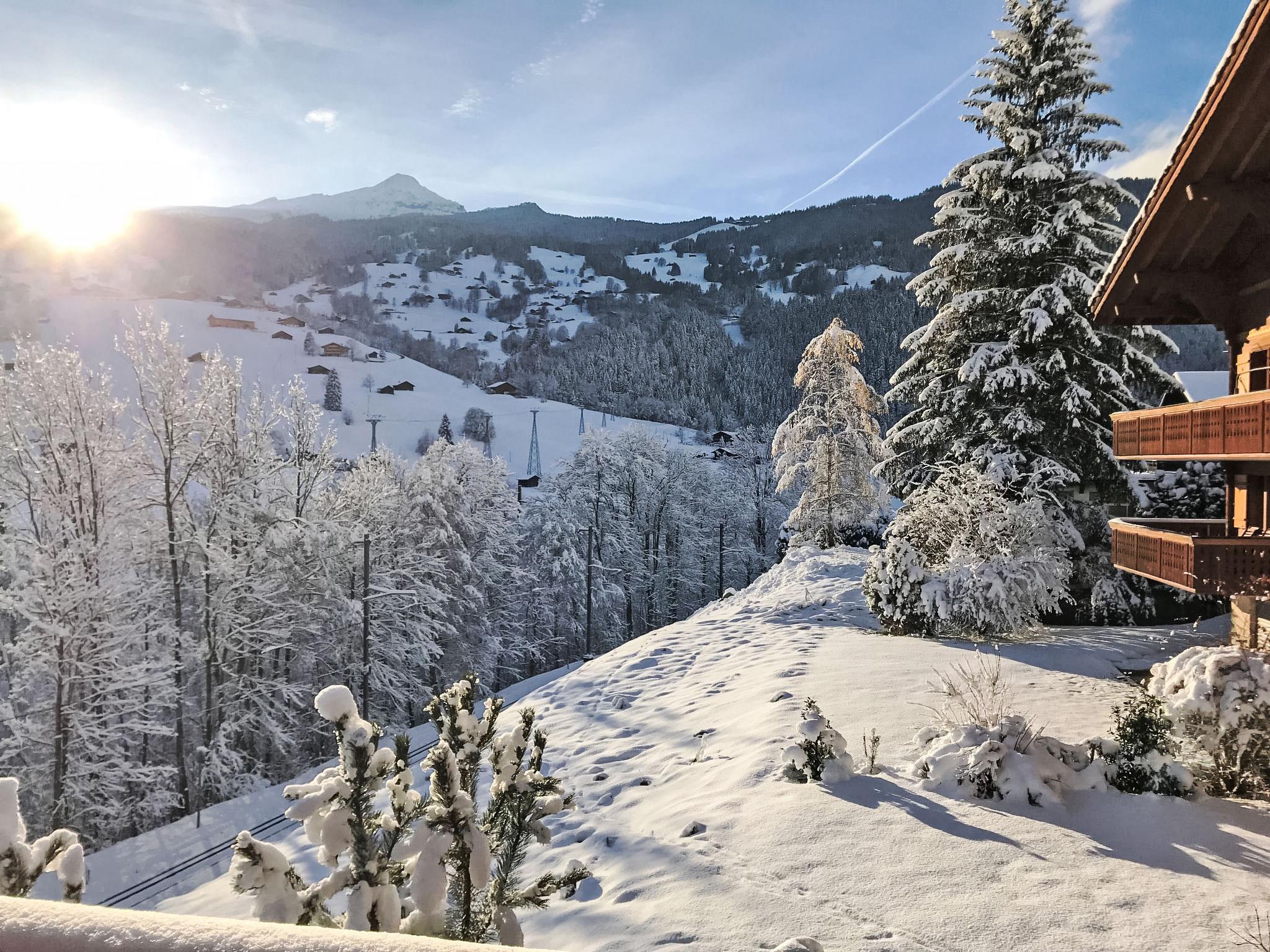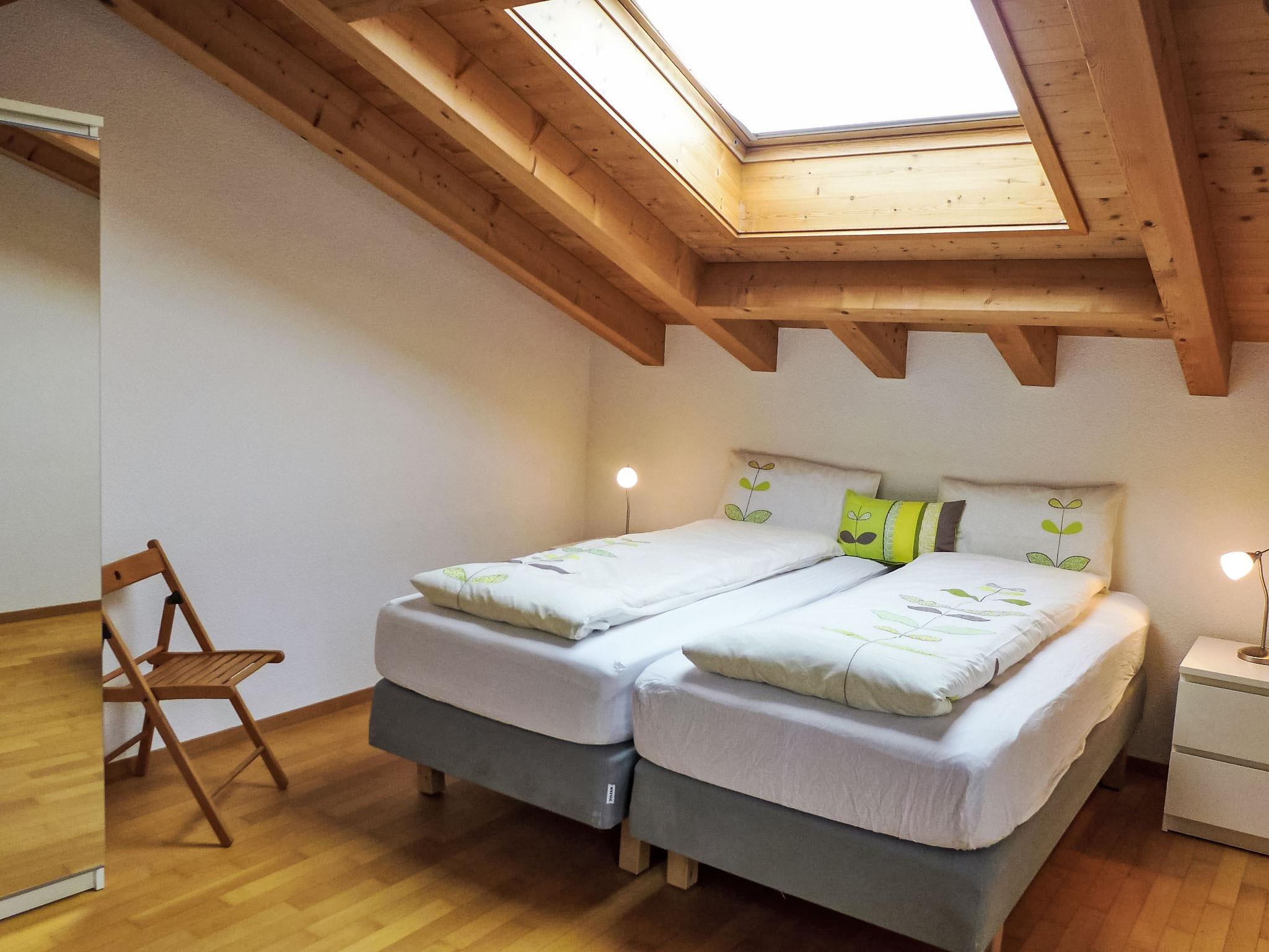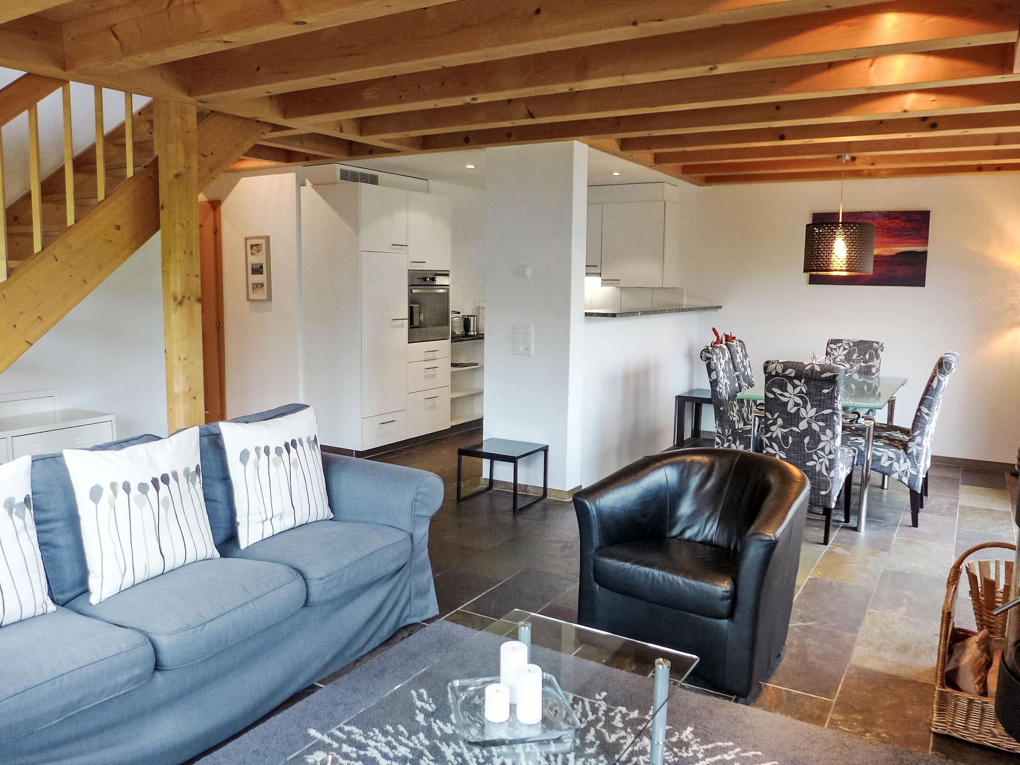 4-room penthouse 126 m2 on 2 levels on 1st floor, south facing position. Partly with sloping ceilings, comfortable and cosy furnishings: living/dining room with Scandinavian wood stove and cable TV (flat screen), radio, CD-player and DVD. Exit to the balcony, south facing position and west facing position. 1 room with 2 beds (90 cm, length 200 cm). Open kitchen (oven, dishwasher, 4 ceramic glass hob hotplates, toaster, kettle, microwave, electric coffee machine, Capsules for coffee machine (Nespresso) extra, raclette grill, fondue Set (cheese)). Shower/WC. Floor heating. Upper floor: 1 room with 2 beds (90 cm, length 200 cm). 1 room with 1 french bed (160 cm). Bath/WC. Underfloor heating. Parquet floors, natural stone floors. Balcony 21 m2, south facing position and west facing position. Balcony furniture. Marvellous view of the mountains and Eiger. Facilities: washing machine, dryer, hair dryer. Internet (WiFi, free). Parking space n 10 Leeson (roofed, 1 car). Please note: non-smokers only. Fire extinguisher.
