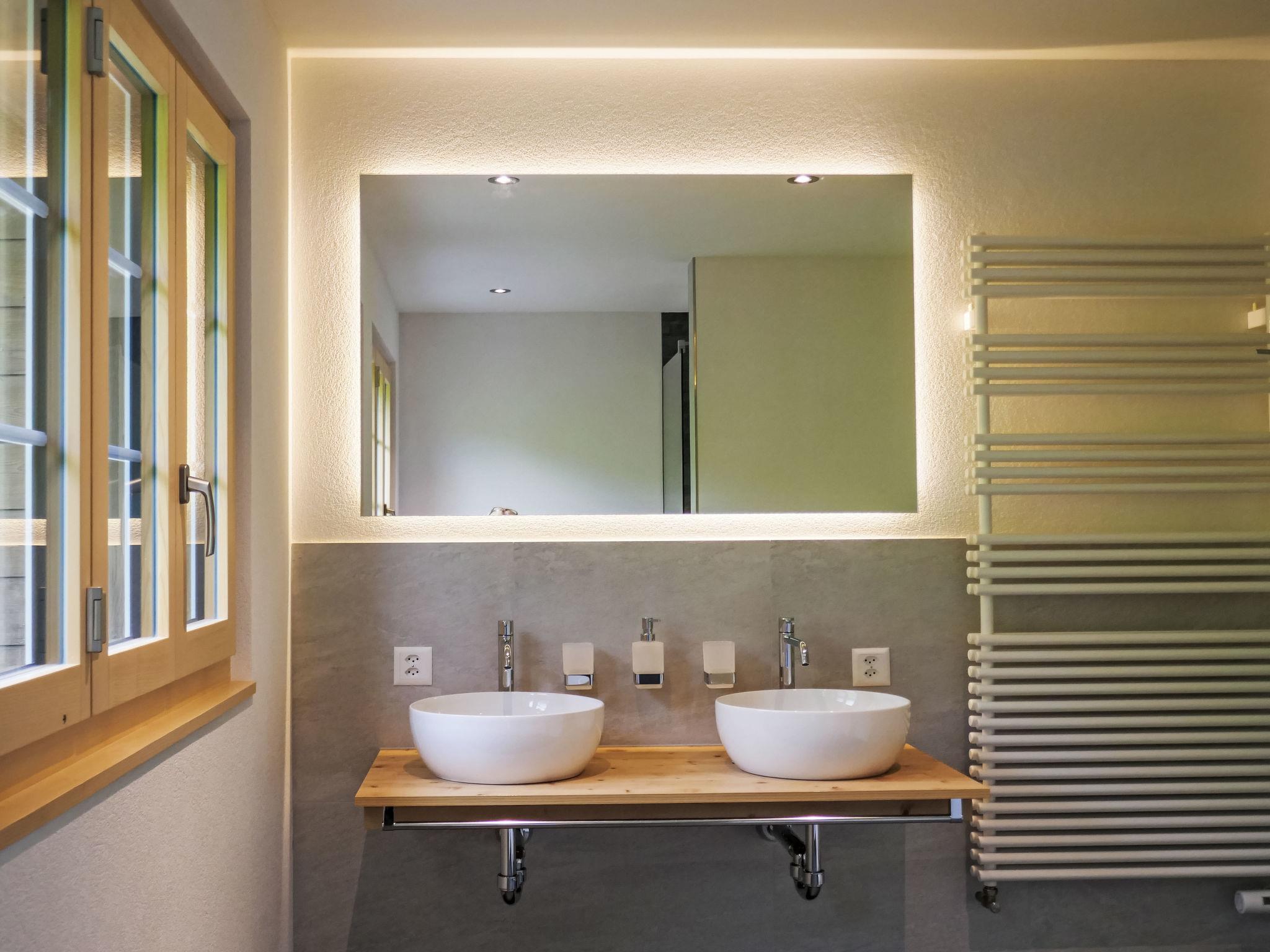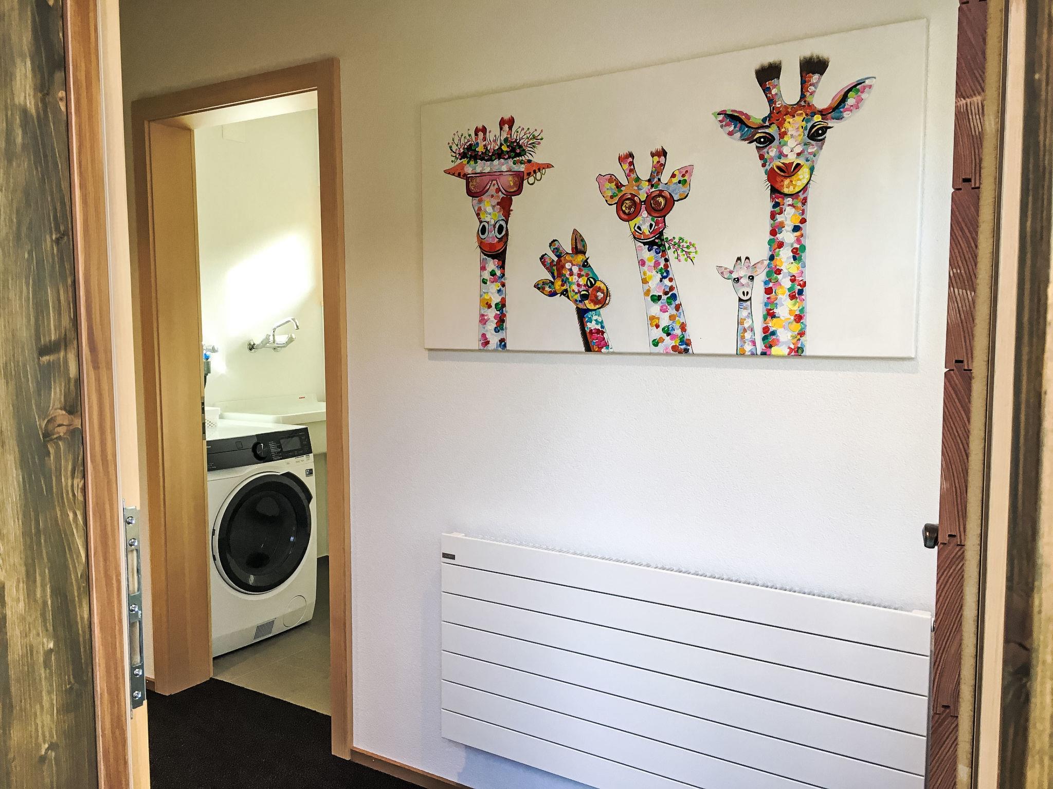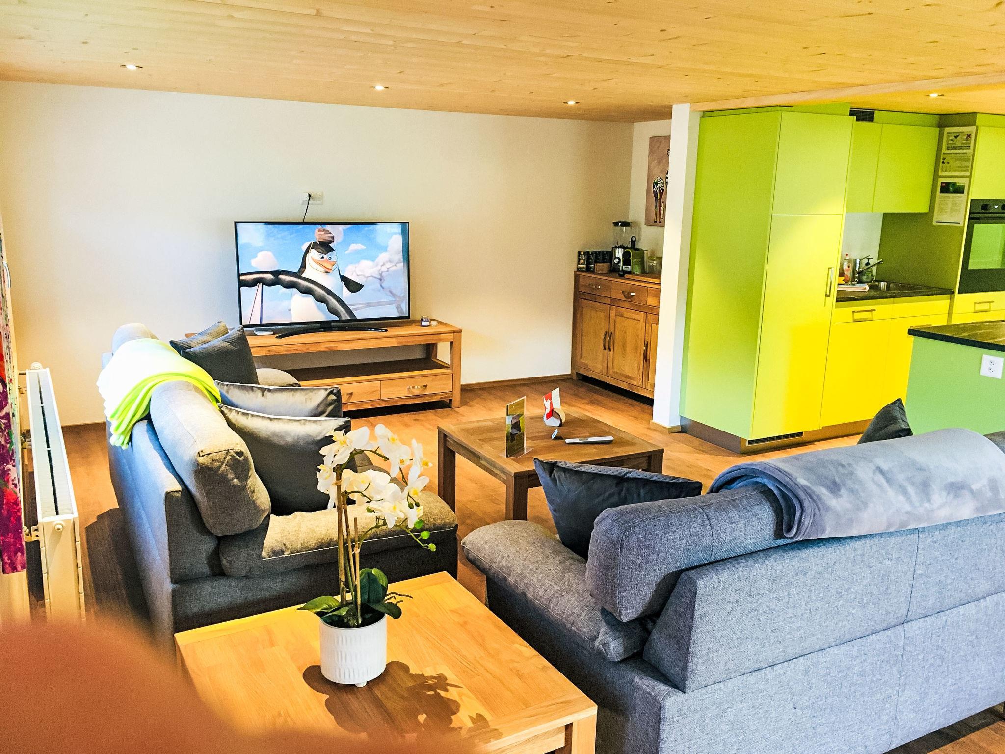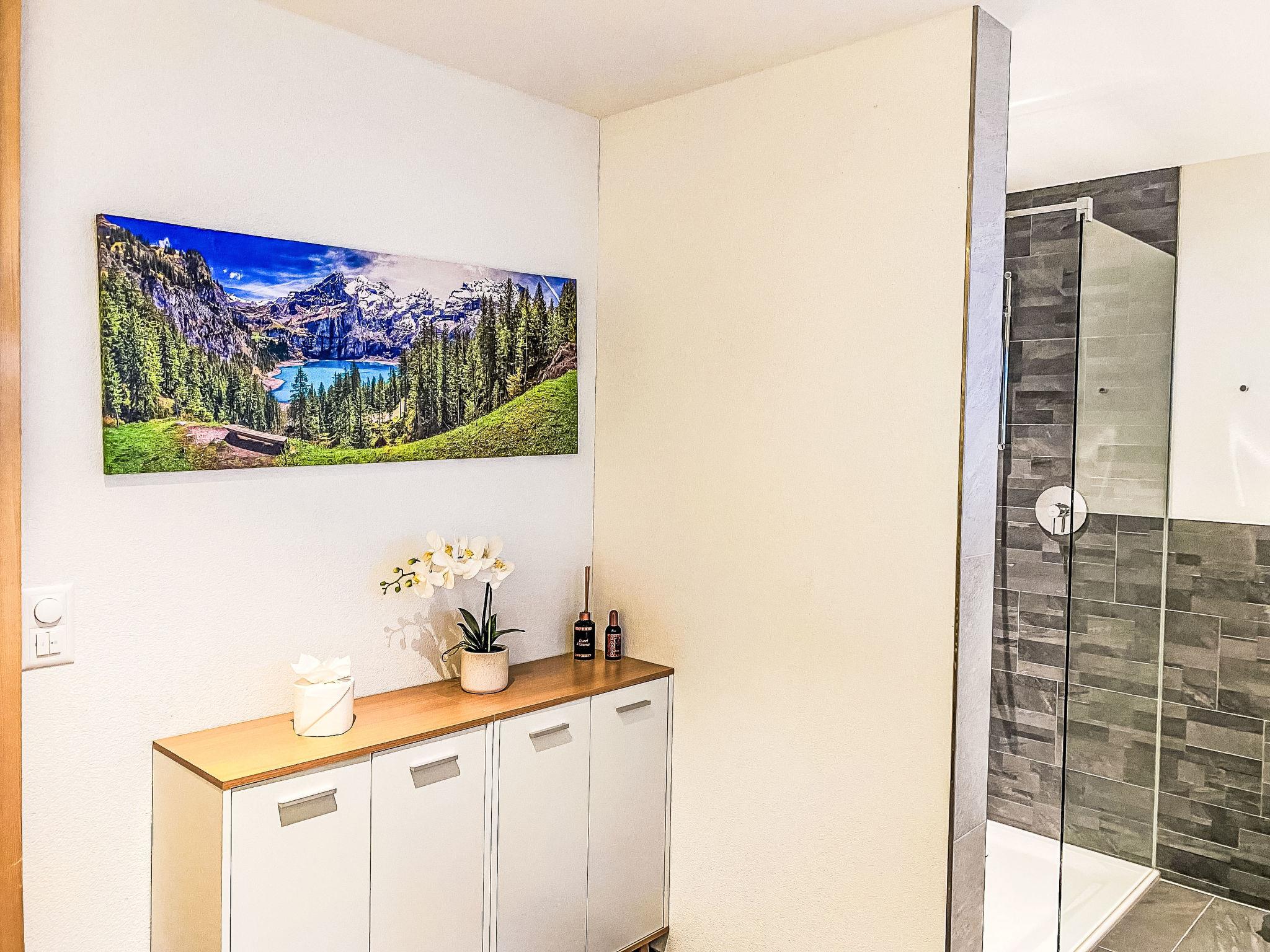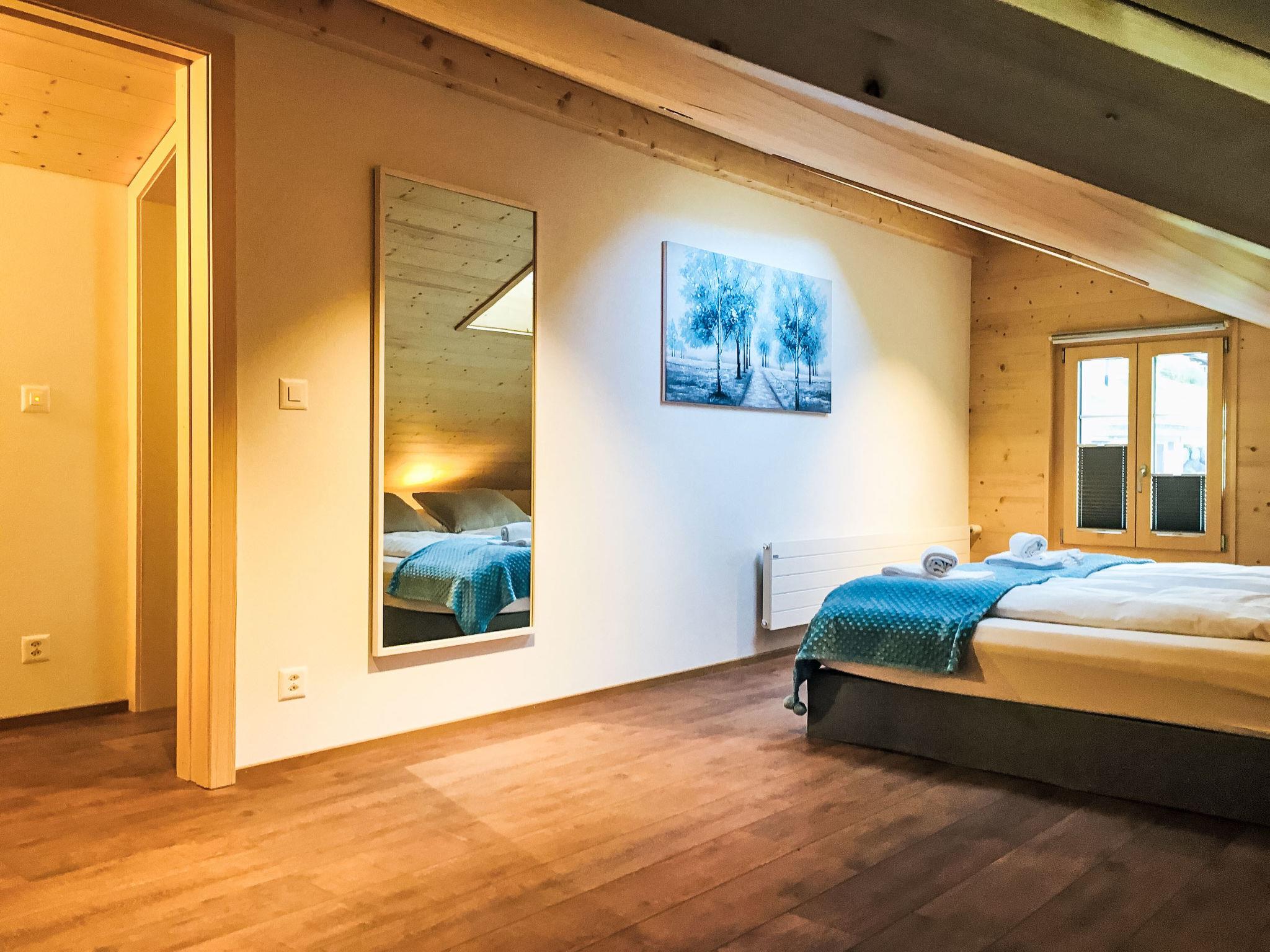3-room apartment 100 m2 on 2 levels, south facing position. Spacious, fully renovated in 2023, comfortable and cosy furnishings: open living/dining room, ceiling height 200 cm with dining table, TV and international TV channels. Exit to the patio. Open kitchen (oven, dishwasher, 4 ceramic glass hob hotplates, toaster, kettle, electric coffee machine, Capsules for coffee machine (Nespresso) extra, raclette grill, fondue Set (cheese)). Shower/WC. Upper floor: 2 rooms with sloping ceilings, Low door height 190 cm ceiling height 60 - 200 cm, each room with 1 bed (180 cm, length 200 cm). Marvellous view of the mountains and the countryside. Facilities: washing machine, dryer, hair dryer. Internet (WiFi, free). Parking at the house. Please note: non-smokers only. Private entrance, fire extinguisher.