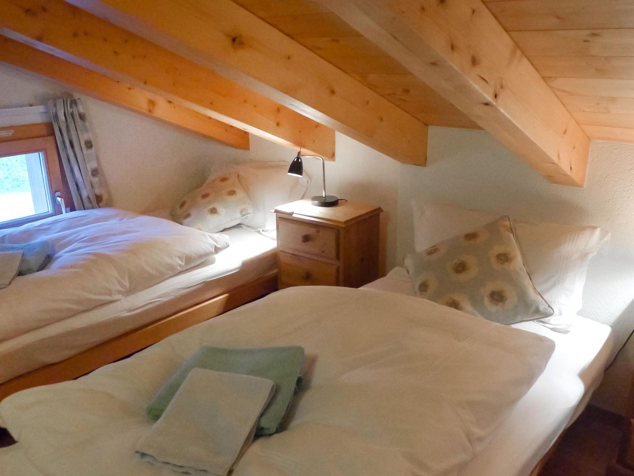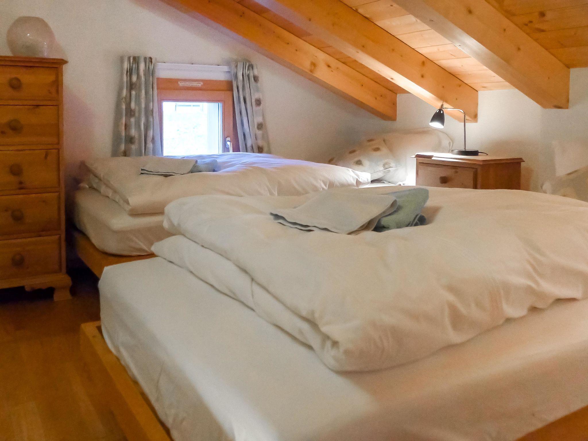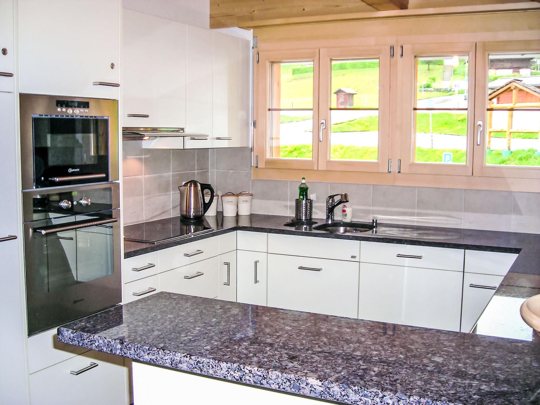 5-room apartment 130 m2, on the top floor, south facing position. Partly with sloping ceilings, tasteful and cosy furnishings: living/dining room with sloping ceilings with Scandinavian wood stove and satellite TV (flat screen), hi-fi system. Exit to the balcony, south facing position and west facing position. 1 room with 2 beds (90 cm, length 200 cm). Exit to the balcony. 1 room with 1 french bed (160 cm, length 200 cm). Exit to the balcony. 1 room with 2 beds (90 cm, length 200 cm), shower/WC. Exit to the balcony. 1 small room 10 m2, with sloping ceilings with 2 beds (90 cm, length 200 cm). Open kitchen (oven, dishwasher, 4 ceramic glass hob hotplates, electric coffee machine, Capsules for coffee machine (Nespresso) extra, raclette grill, fondue Set (cheese)). Bath/WC, shower/WC. Underfloor heating. Natural stone floors. Large balcony, south facing position and west facing position balcony, east facing position. Balcony furniture. Marvellous view of the mountains and Eiger. Facilities: hair dryer, logs (extra). Internet (WiFi, free). Parking, garage space n 6 & 7 (2 cars) at the house, height 200 cm. Please note: non-smokers only. Fire extinguisher, no lift.