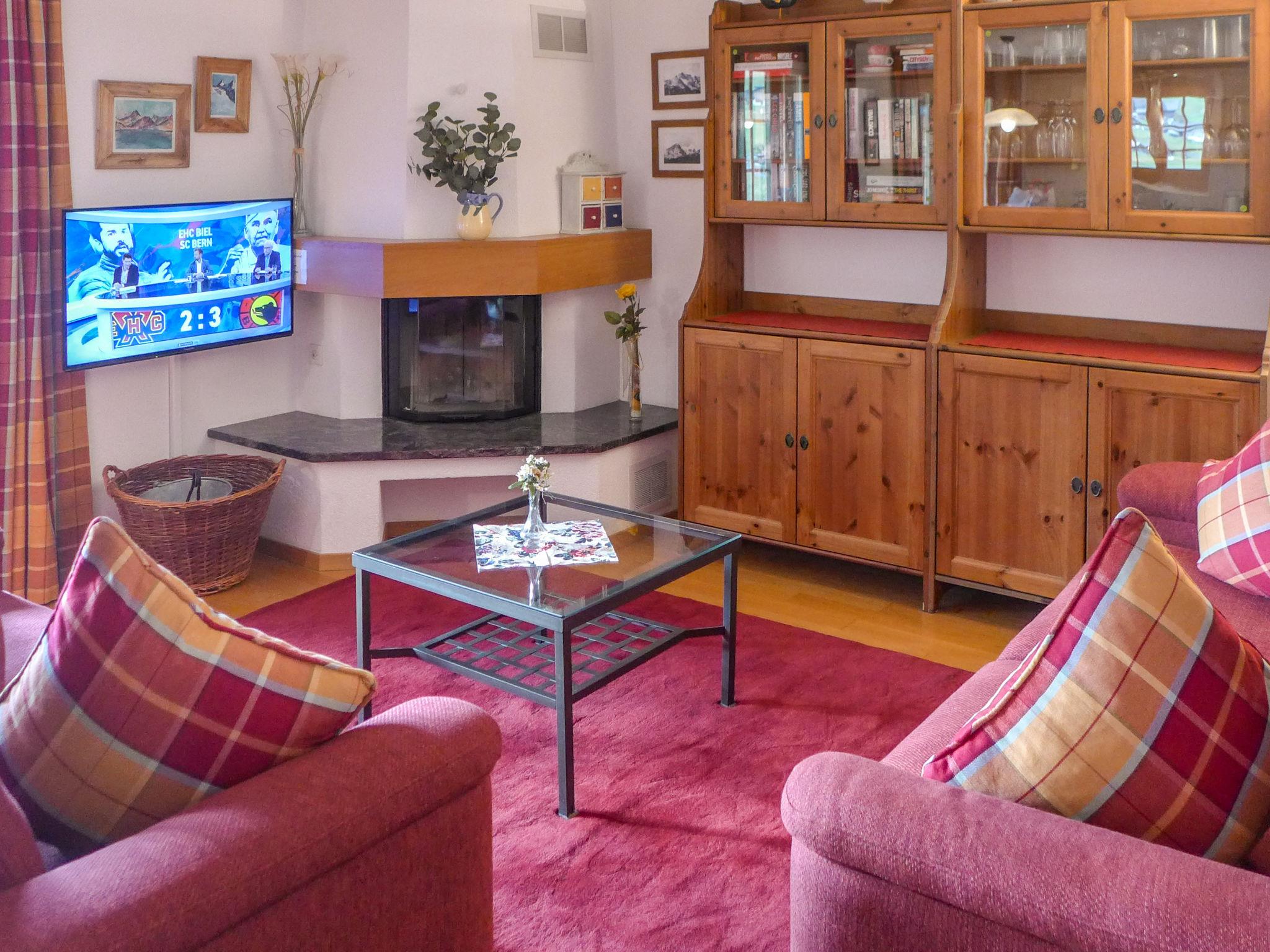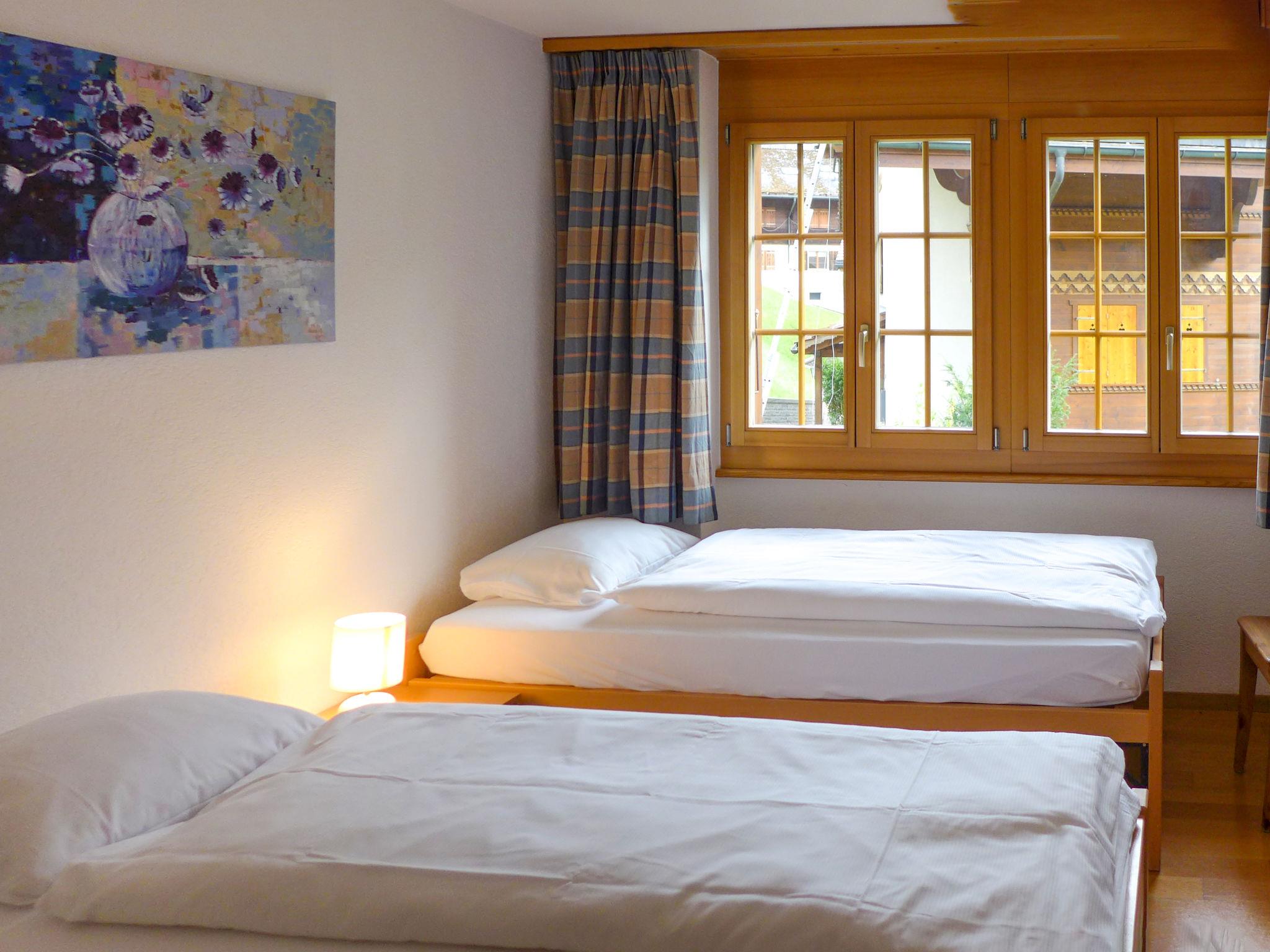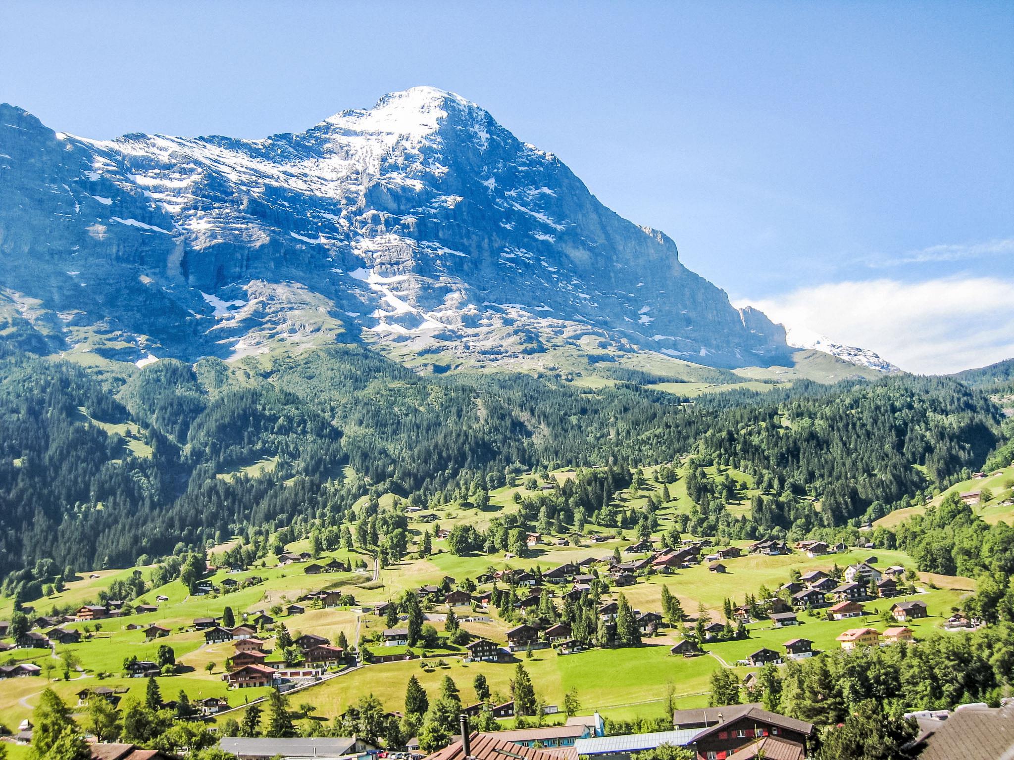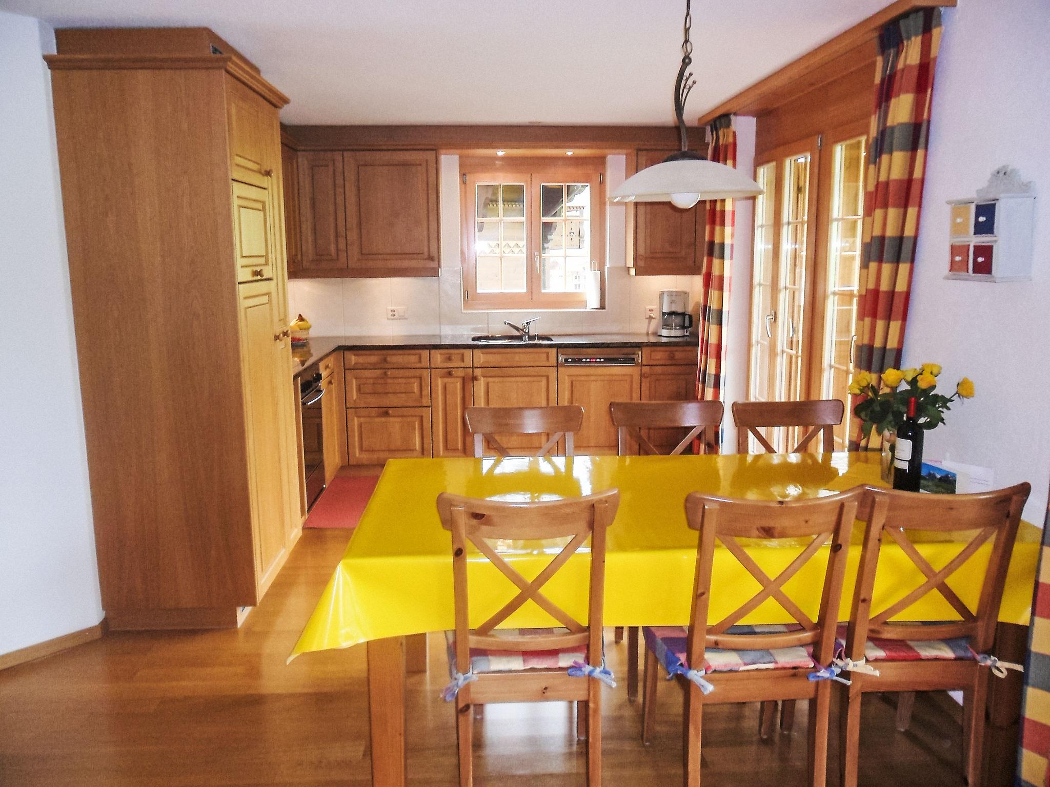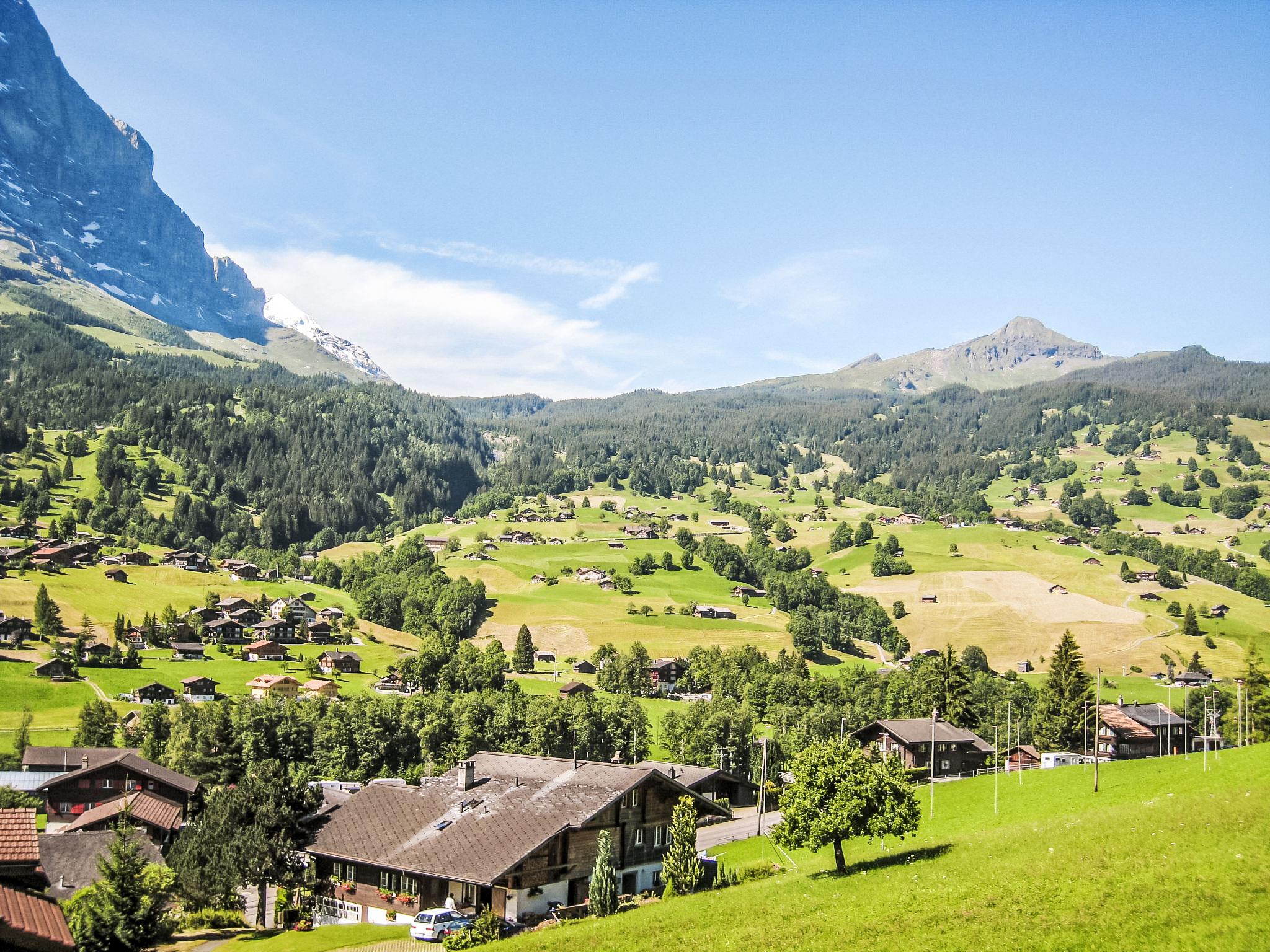 3-room apartment 80 m2 on 1st floor, south-west facing position. Bright, beautiful and cosy furnishings: living/dining room with open-hearth fireplace, international TV channels, flat screen, radio and CD-player. Exit to the balcony, south facing position and west facing position. 1 room with 2 beds (90 cm, length 200 cm), shower/WC. 1 room with 1 bed (160 cm, length 200 cm). Open kitchen (oven, dishwasher, 4 ceramic glass hob hotplates, toaster, kettle, microwave, electric coffee machine, Capsules for coffee machine (Nespresso) extra, raclette grill, fondue Set (cheese)). Bath/WC. Underfloor heating. Parquet floors, natural stone floors. Large balcony 24 m2, south facing position and west facing position. Balcony furniture. Marvellous view of the mountains and Eiger. Facilities: hair dryer, logs (extra). Internet (WiFi, free). Parking space n 6 & 7. Please note: non-smokers only. Fire extinguisher.