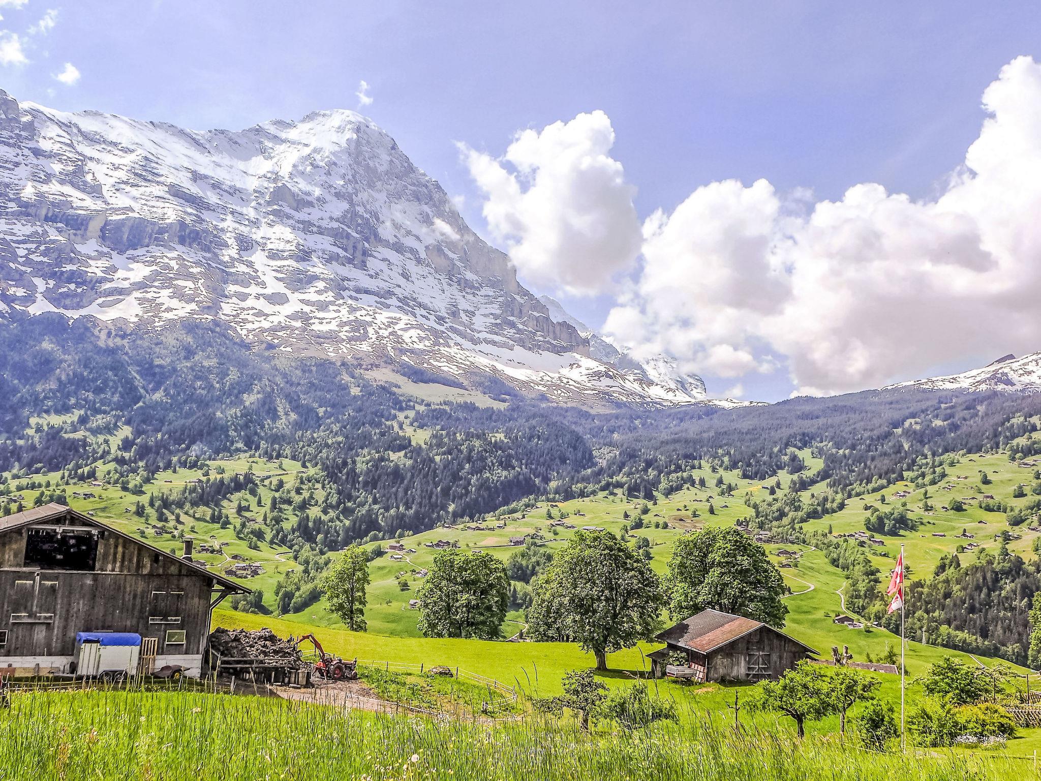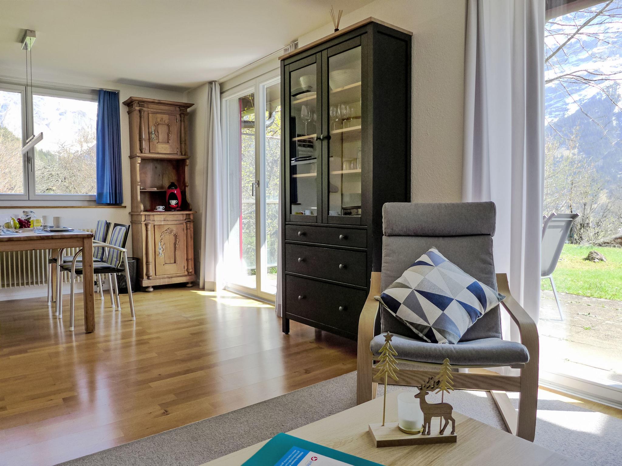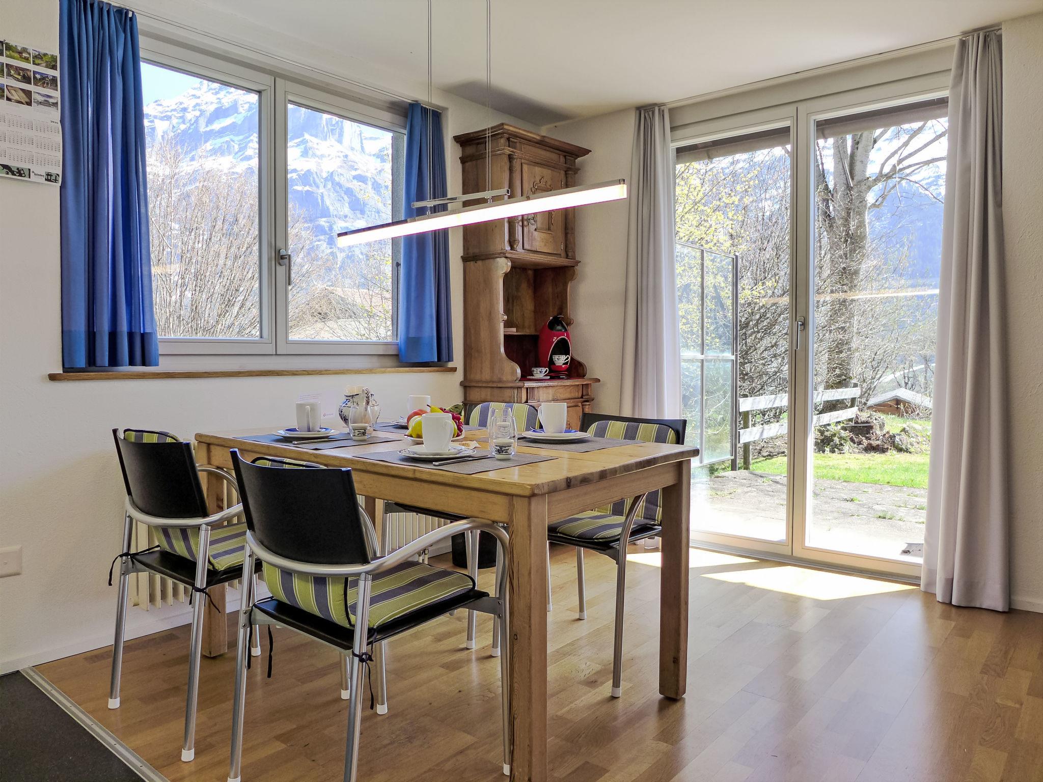2-room apartment 64 m2, on the ground floor, south facing position. Practical and cosy furnishings: living/sleeping room with 1 double sofabed (140 cm, length 200 cm), satellite TV (flat screen), radio. Exit to the terrace. 1 room with 1 double bed (2 x 90 cm, length 200 cm). Open kitchen (4 hot plates, oven, dishwasher, toaster, kettle, electric coffee machine, Capsules for coffee machine (Dolce Gusto) extra, raclette grill, fondue Set (cheese)). Bathroom, sep. WC. Large terrace, south facing position. Terrace furniture. Marvellous view of the mountains, the valley and Eiger. Facilities: hair dryer. Internet (WiFi, free). Parking at the house. Please note: non-smokers only. Fire extinguisher.