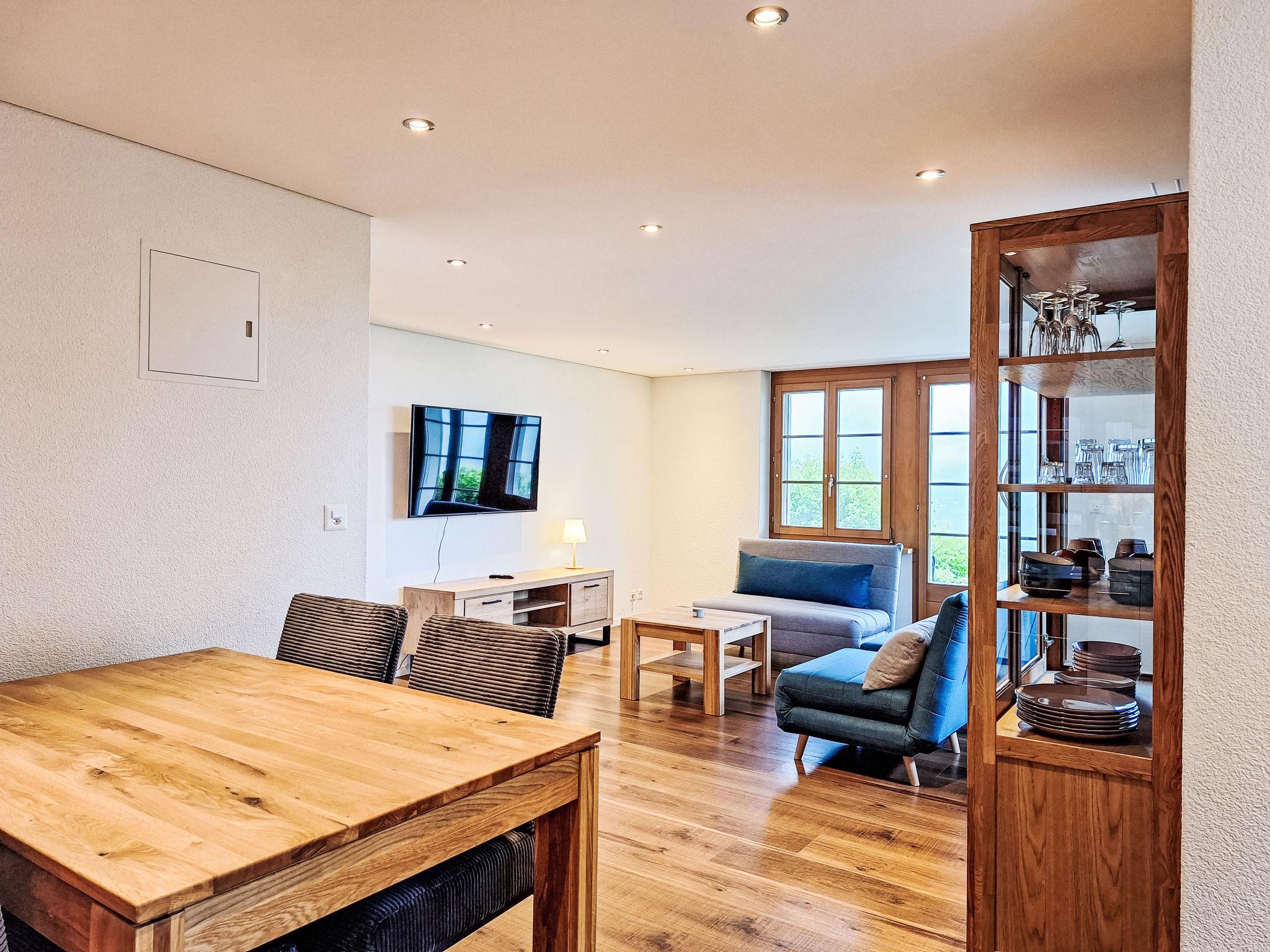 "Chalet Adlerhorst EG", 3-room apartment on the ground floor, south facing position. Spacious and bright, very comfortable and tasteful furnishings: open large living room with cable TV and flat screen. Exit to the terrace. 2 rooms, each room with 1 double bed (2 x 90 cm, length 200 cm). Large, open kitchen (oven, dishwasher, 4 ceramic glass hob hotplates, toaster, kettle, microwave, electric coffee machine, Capsules for coffee machine (Dolce Gusto) extra) with dining table. Bath/WC. Underfloor heating. Large terrace, south facing position. Terrace furniture. Marvellous panoramic view of the mountains, the valley and the countryside. Facilities: hair dryer. Internet (WiFi, free). Parking. Please note: non-smokers only. Smoke alarm, fire extinguisher.
