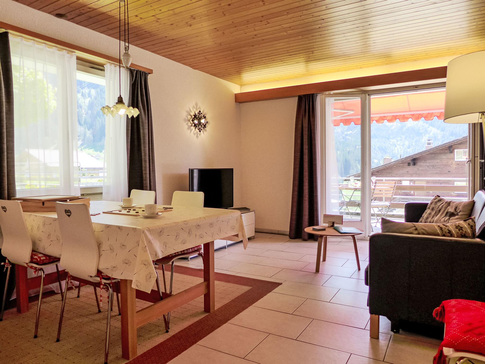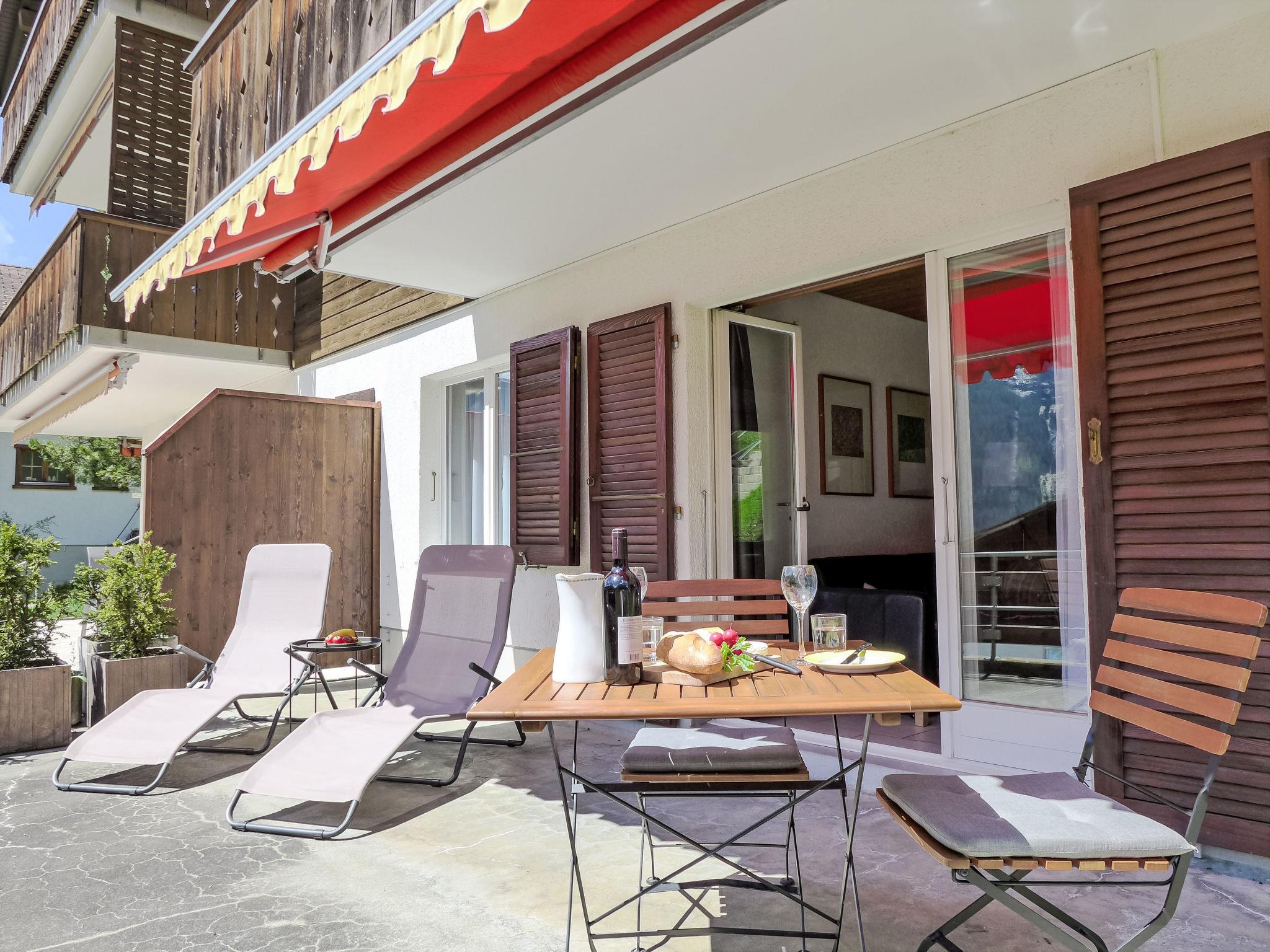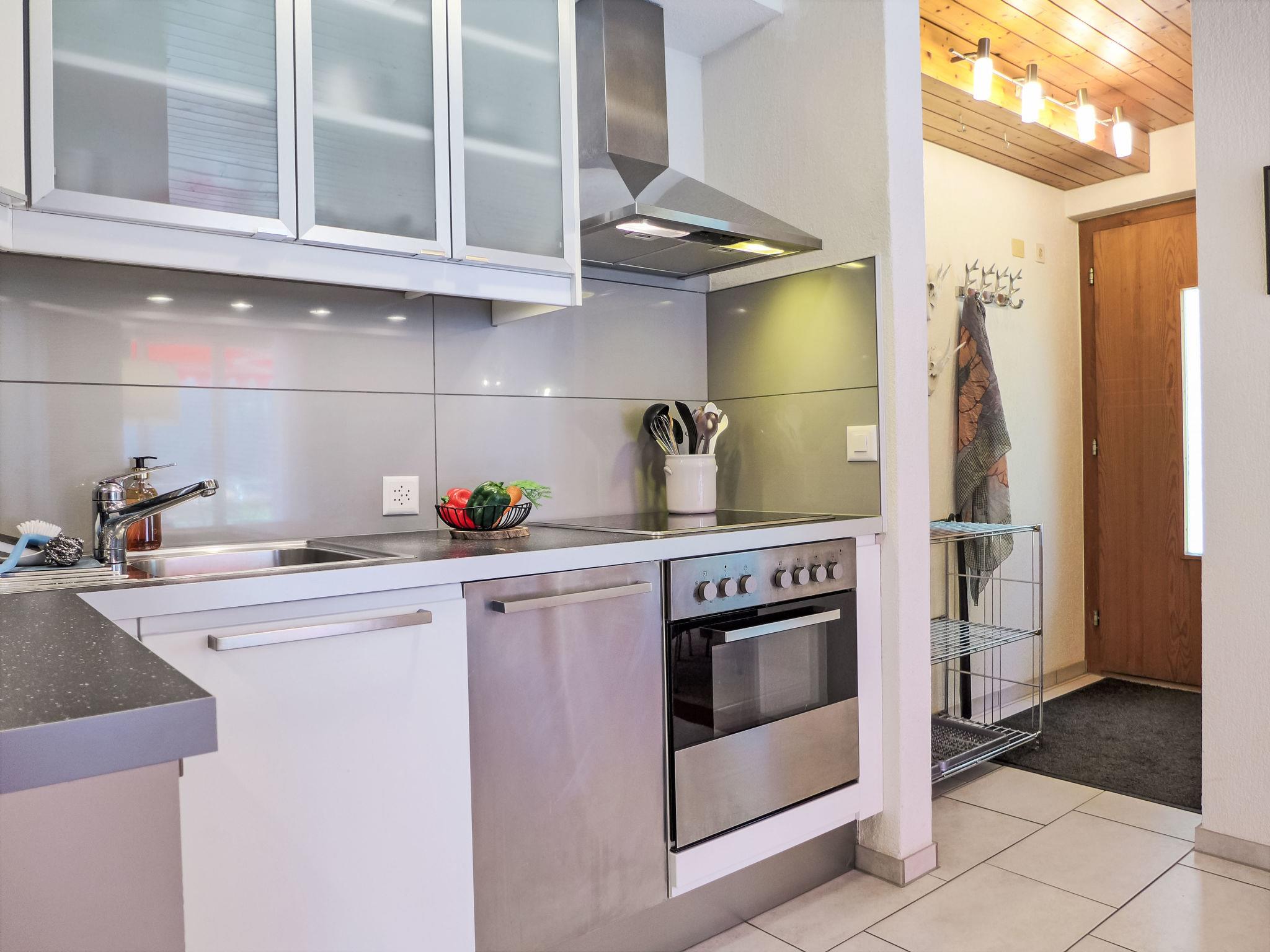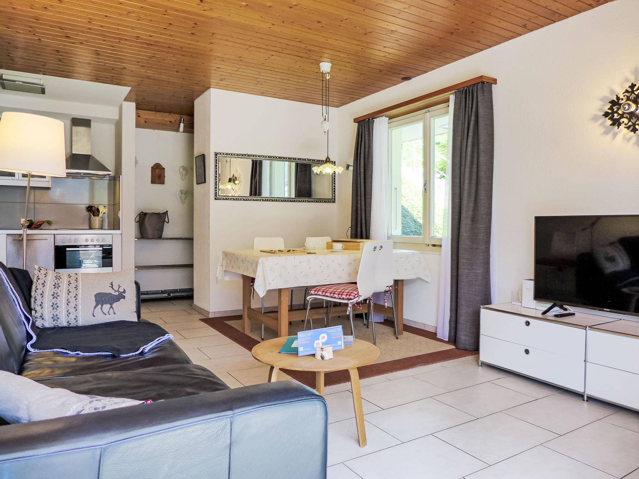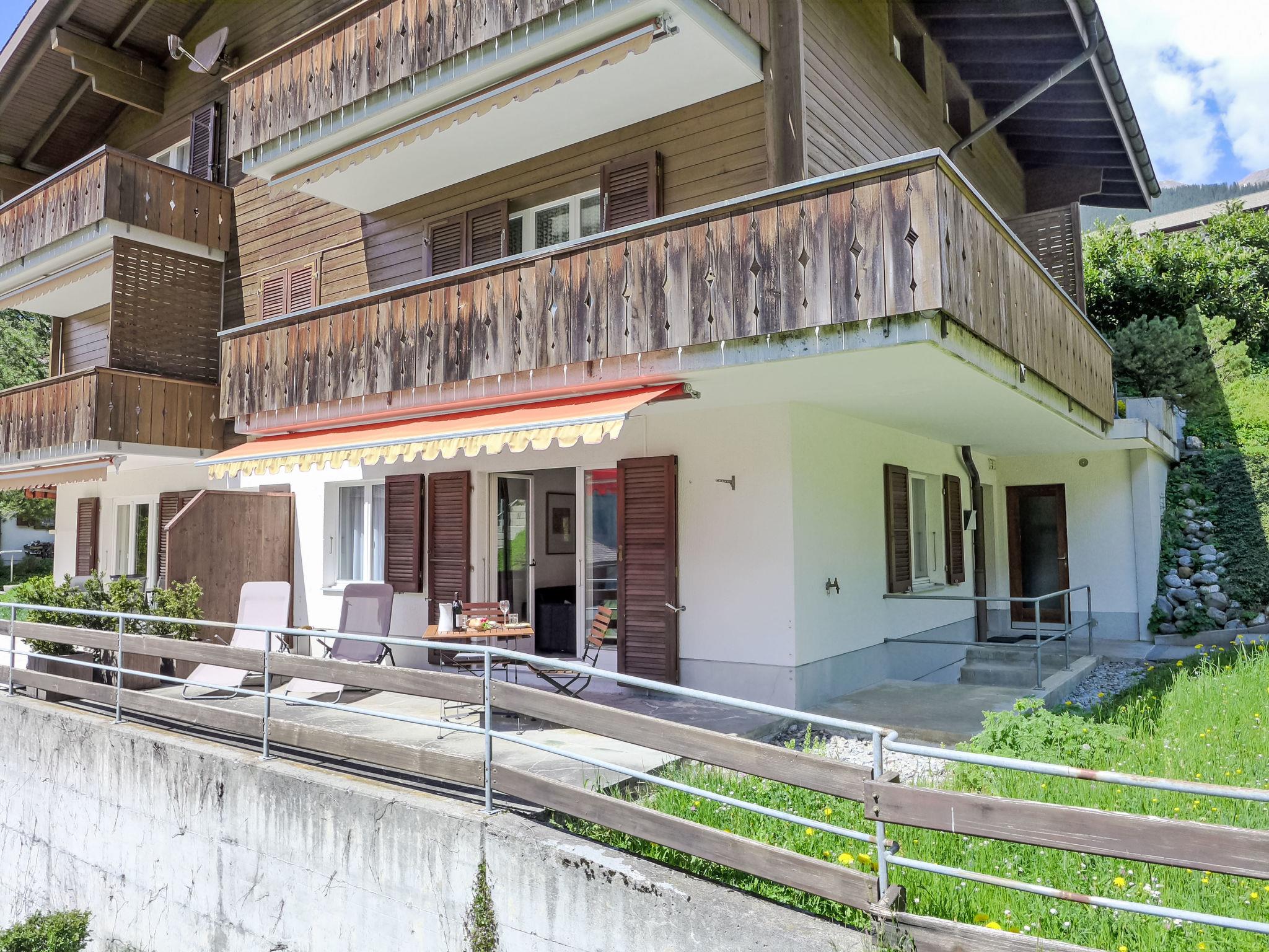 2-room apartment 45 m2, on the ground floor, south facing position. Spacious and bright, modern and cosy furnishings: open living/dining room with panoramic window with cable TV and digital TV (flat screen), radio. Exit to the terrace, south facing position. 1 room with 1 double bed (160 cm, length 200 cm). Open kitchen (oven, dishwasher, 4 ceramic glass hob hotplates, toaster, kettle, electric coffee machine, raclette grill, fondue Set (cheese)). Shower/WC. Underfloor heating. Parquet floors. Large terrace, south facing position. Terrace furniture, deck chairs. Marvellous panoramic view of the mountains, the countryside and Eiger. Facilities: iron, hair dryer. Internet (WiFi, free). Parking (1 car). Please note: non-smokers only. Private entrance.