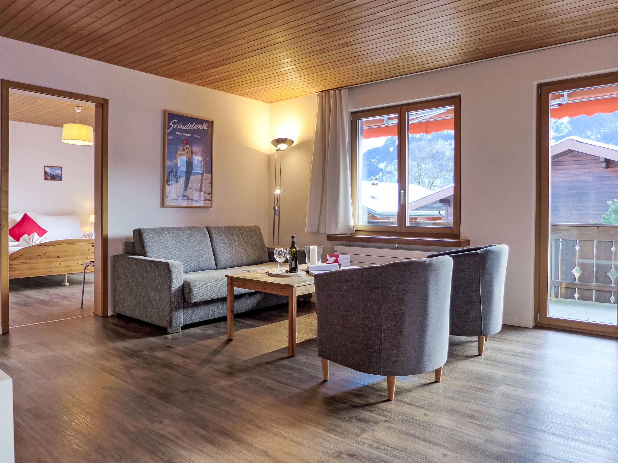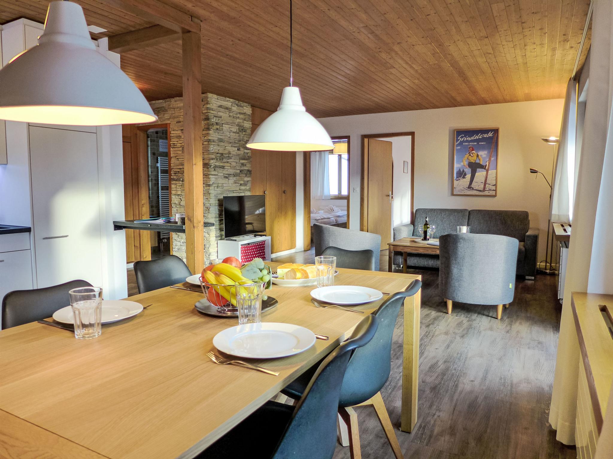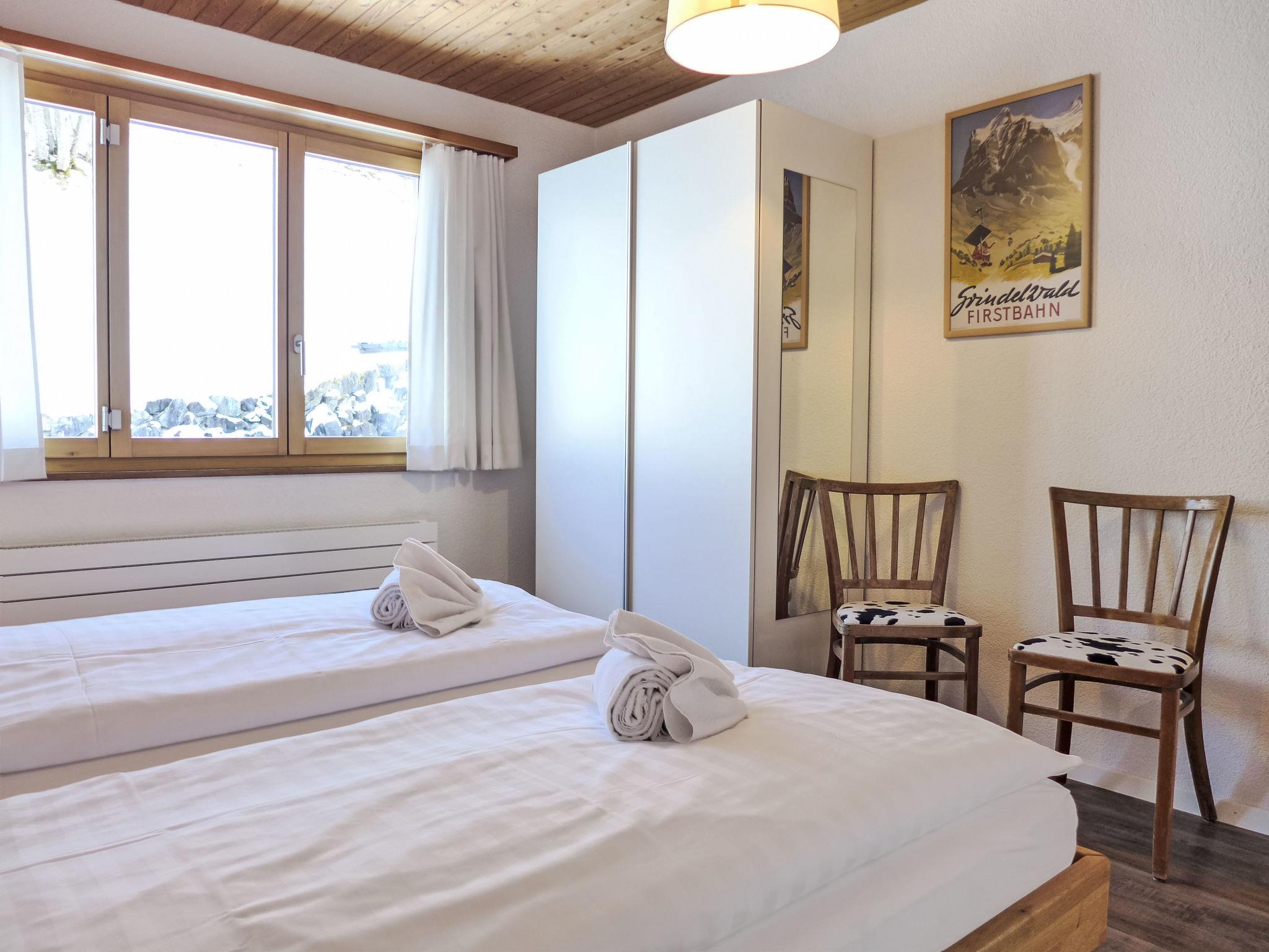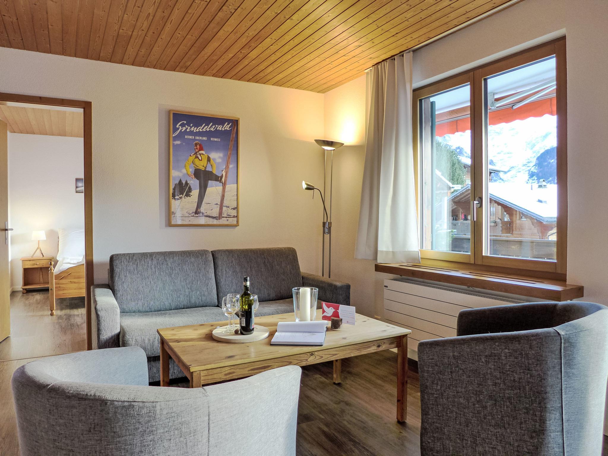 "Chalet Bienli Mitte", 3-room apartment 80 m2, on the upper ground floor, south facing position. Spacious and bright, partly renovated in 2024, very comfortable and cosy furnishings: open living/dining room with dining nook and cable TV (flat screen), radio. Exit to the balcony, south facing position. 1 room with 1 double bed (2 x 80 cm, length 200 cm). Exit to the balcony, south facing position. 1 room with 2 beds (90 cm, length 200 cm). Open kitchen (oven, dishwasher, 4 ceramic glass hob hotplates, toaster, kettle, microwave, electric coffee machine, Capsules for coffee machine (Nespresso) extra, raclette grill, fondue Set (cheese)). Bath/WC. Parquet floors. Balcony 18 m2, south facing position. Balcony furniture. Marvellous panoramic view of the mountains and Eiger. Facilities: children's high chair, baby cot (extra), hair dryer. Internet (WiFi, free). Parking (1 car) at 50 m. Please note: non-smokers only. Fire extinguisher. When there are less than the maximum number of guests staying at the property, not all of the bedrooms will be available for use.