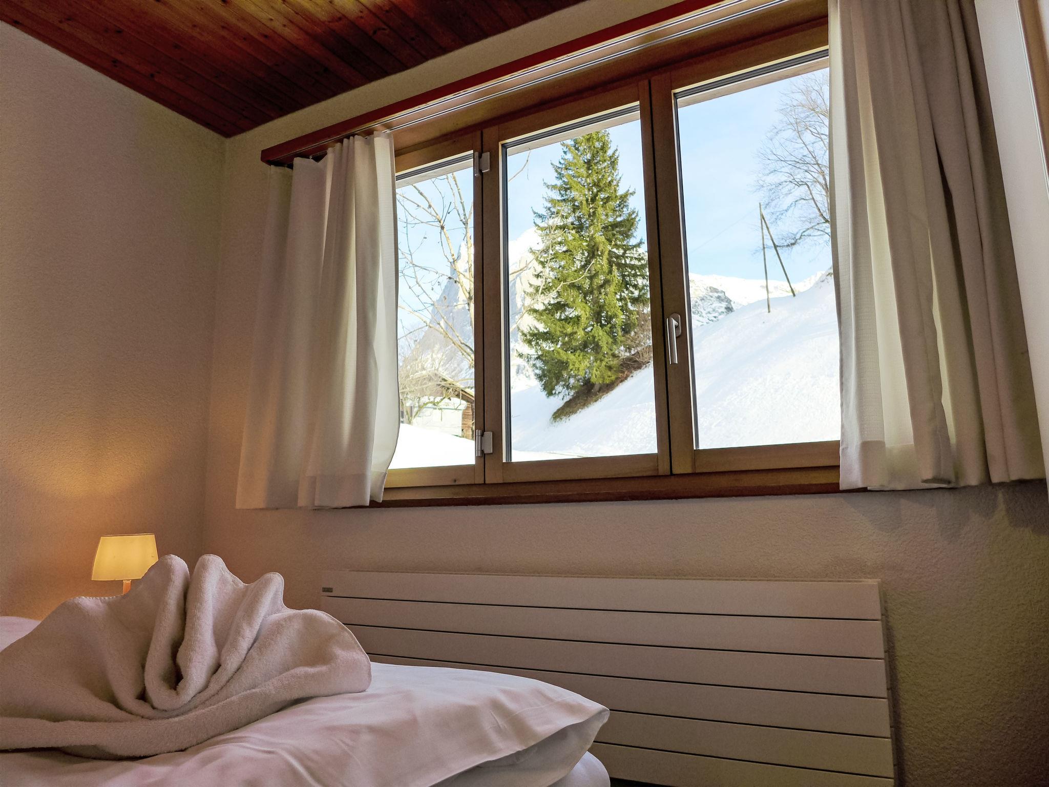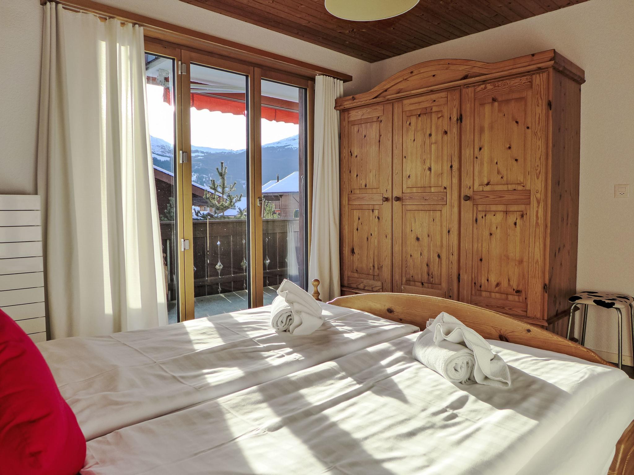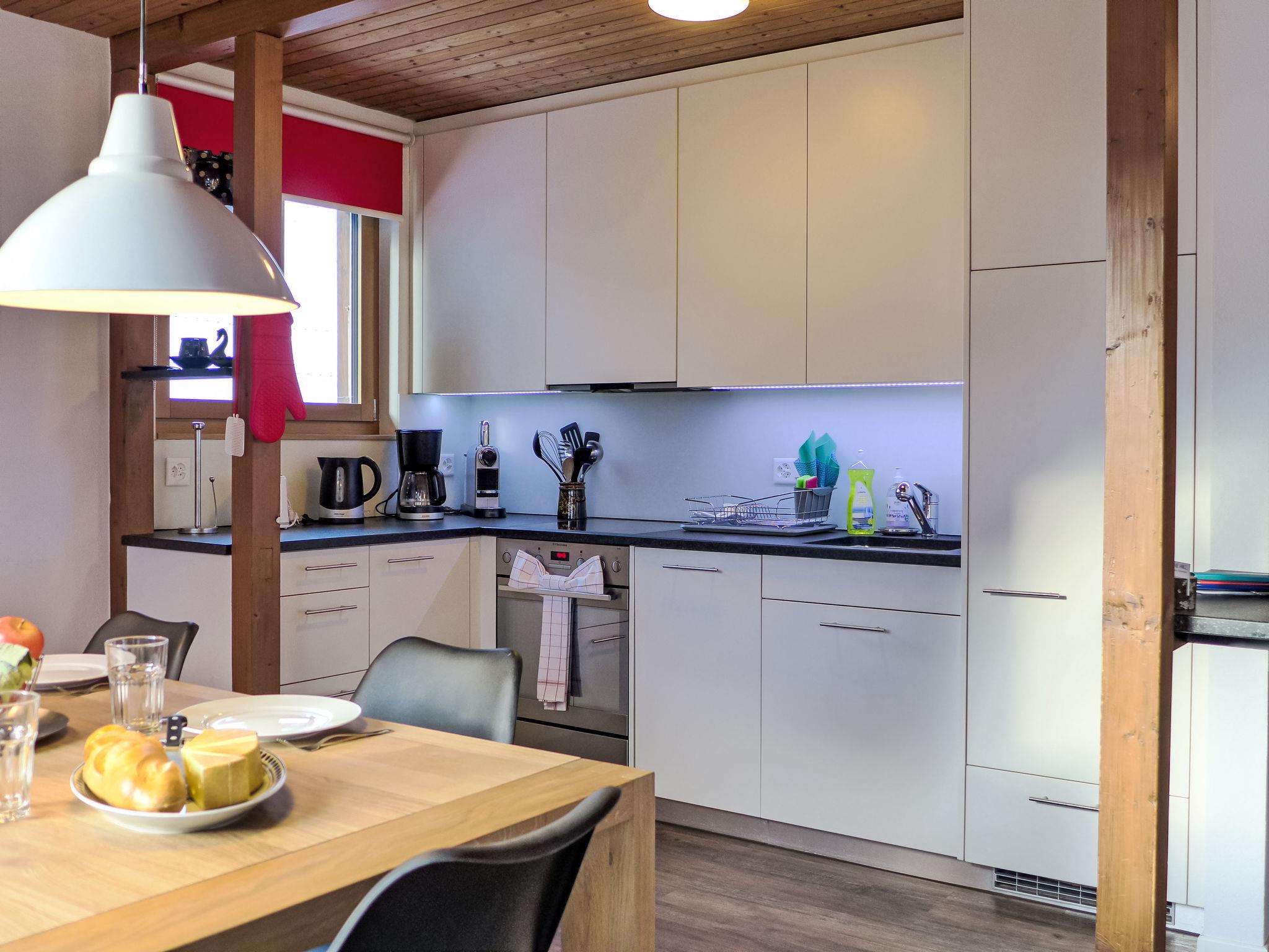 "Chalet Bienli Mitte", 3-room apartment 80 m2, on the upper ground floor, south facing position. Spacious and bright, partly renovated in 2024, very comfortable and cosy furnishings: open living/dining room with dining nook and cable TV (flat screen), radio. Exit to the balcony, south facing position. 1 room with 1 double bed (2 x 80 cm, length 200 cm). Exit to the balcony, south facing position. 1 room with 2 beds (90 cm, length 200 cm). Open kitchen (oven, dishwasher, 4 ceramic glass hob hotplates, toaster, kettle, microwave, electric coffee machine, Capsules for coffee machine (Nespresso) extra, raclette grill, fondue Set (cheese)). Bath/WC. Parquet floors. Balcony 18 m2, south facing position. Balcony furniture. Marvellous panoramic view of the mountains and Eiger. Facilities: children's high chair, baby cot (extra), hair dryer. Internet (WiFi, free). Parking (1 car) at 50 m. Please note: non-smokers only. Fire extinguisher. When there are less than the maximum number of guests staying at the property, not all of the bedrooms will be available for use.