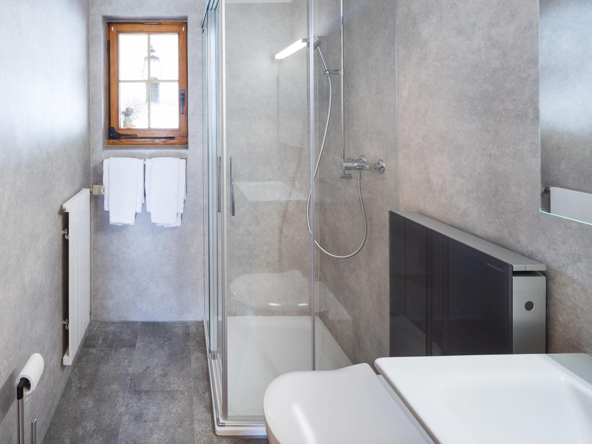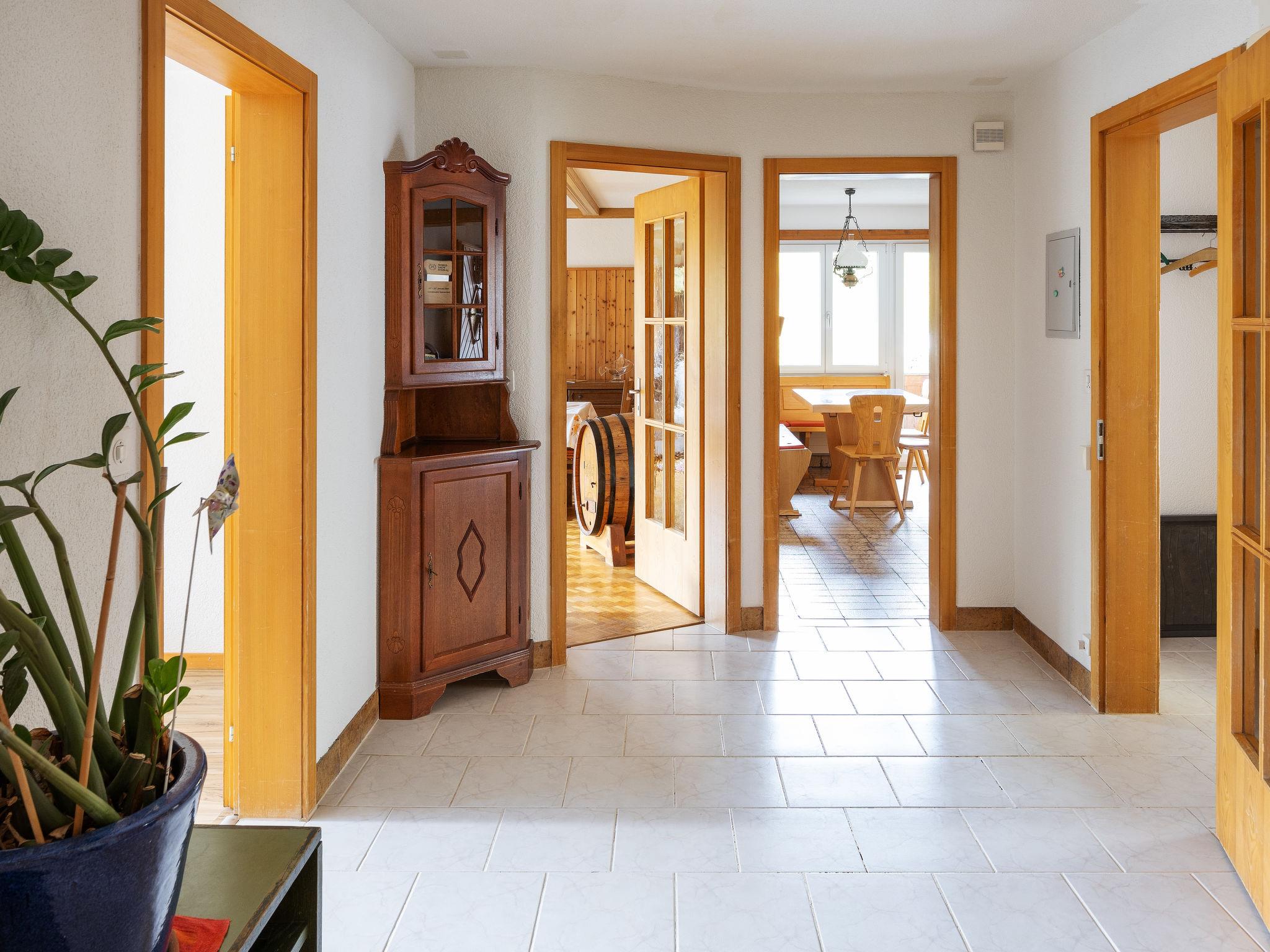 4-room apartment 110 m2, on the upper ground floor, south facing position. Spacious, practical and cosy furnishings: living room with satellite TV. Exit to the balcony, south facing position. 1 room with 2 beds (90 cm, length 200 cm). 1 room with 1 french bed (160 cm, length 200 cm). 1 room with 1 bed (180 cm, length 200 cm), bath/WC. Exit to the balcony, south facing position. Large kitchen-/living room (oven, dishwasher, 4 ceramic glass hob hotplates, toaster, kettle, electric coffee machine, raclette grill, fondue Set (cheese)). Shower/WC. Parquet floors, natural stone floors. Balcony, south facing position and west facing position. Balcony furniture. Marvellous view of the mountains and the countryside. Facilities: Internet (WiFi, free). Parking at the house. Please note: suitable for families. Non-smokers only. Private entrance, fire extinguisher.
