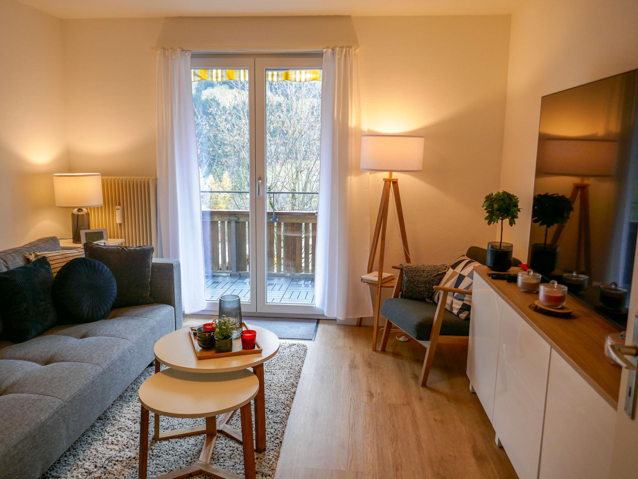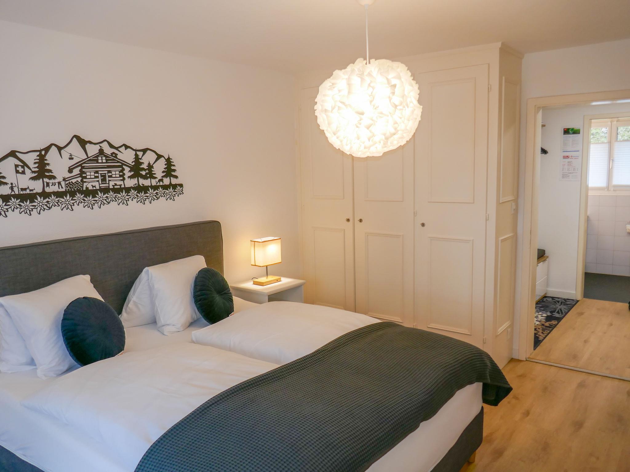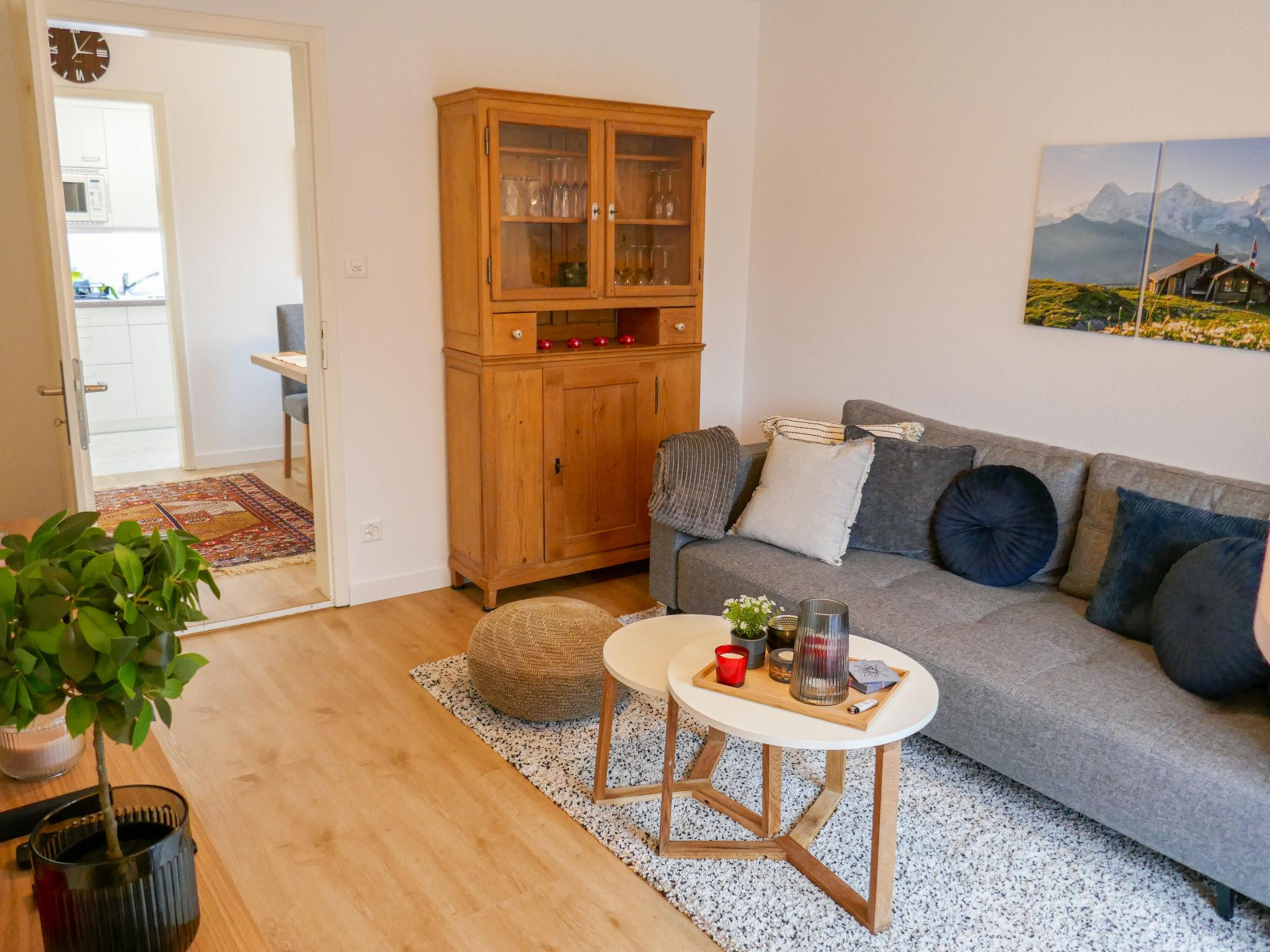 2-room apartment 70 m2, south facing position. Bright, fully renovated in 2022, beautiful and cosy furnishings: living/sleeping room with 1 sofabed (160 cm, length 200 cm), digital TV. Exit to the balcony, south facing position. 1 room with 1 bed (180 cm, length 200 cm), digital TV. Exit to the balcony, south facing position. Kitchen (oven, dishwasher, 4 ceramic glass hob hotplates, toaster, kettle, microwave, electric coffee machine, Capsules for coffee machine (Nespresso) extra, raclette grill, fondue Set (cheese)). Bath/WC. Parquet floors. South facing position. Marvellous view of the mountains, the valley and Eiger. Facilities: hair dryer. Internet (WiFi, free). Parking space n BE38501. Please note: non-smokers only. Fire extinguisher, no lift.