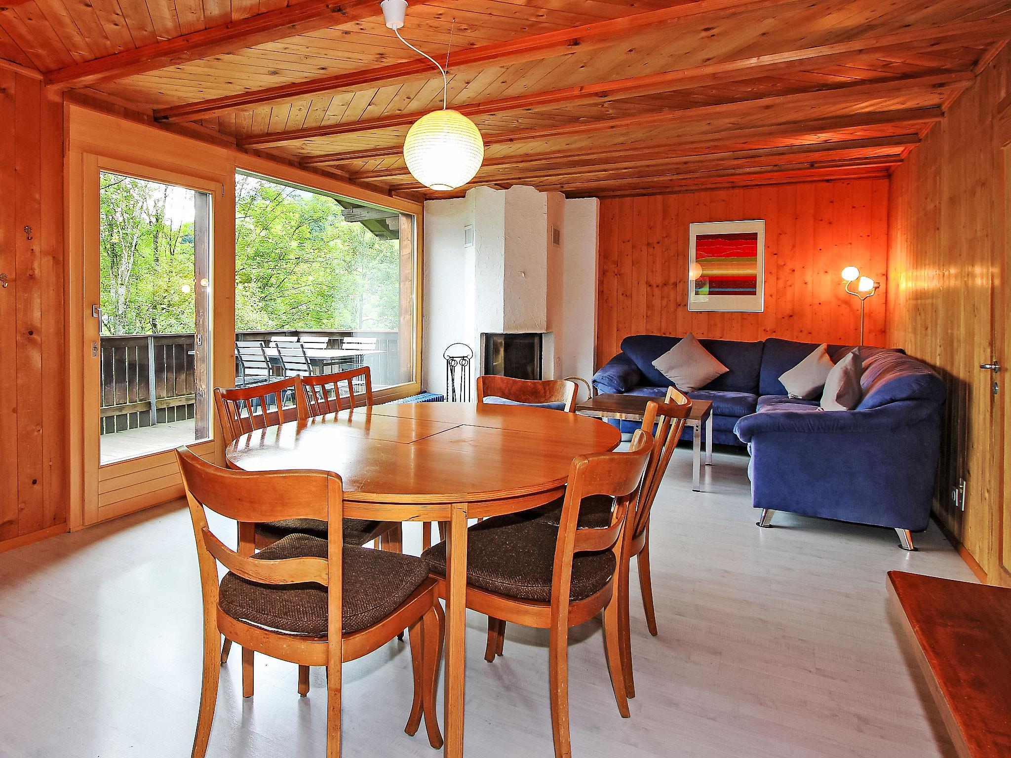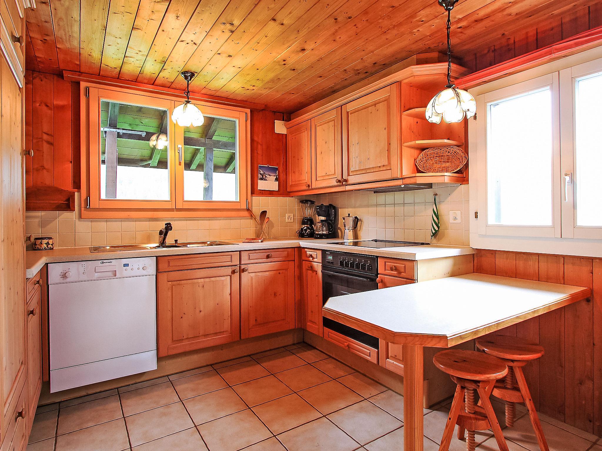 4-room chalet 70 m2, south facing position. Cosy and wooden furniture furnishings: living/dining room with open-hearth fireplace and TV. Exit to the terrace, south facing position and west facing position. 2 rooms, each room with 2 beds (90 cm, length 200 cm). 1 room with 1 french bed (1 x 160 cm, length 200 cm). Open kitchen (oven, dishwasher, 4 ceramic glass hob hotplates, microwave, electric coffee machine). Shower/WC. Parquet floors. Large terrace, south facing position. Terrace furniture. Marvellous view of the mountains, the valley, the countryside and Eiger. Facilities: Internet (WiFi, free). Parking at the house. Please note: 1 pet/ dog allowed. Fire extinguisher.