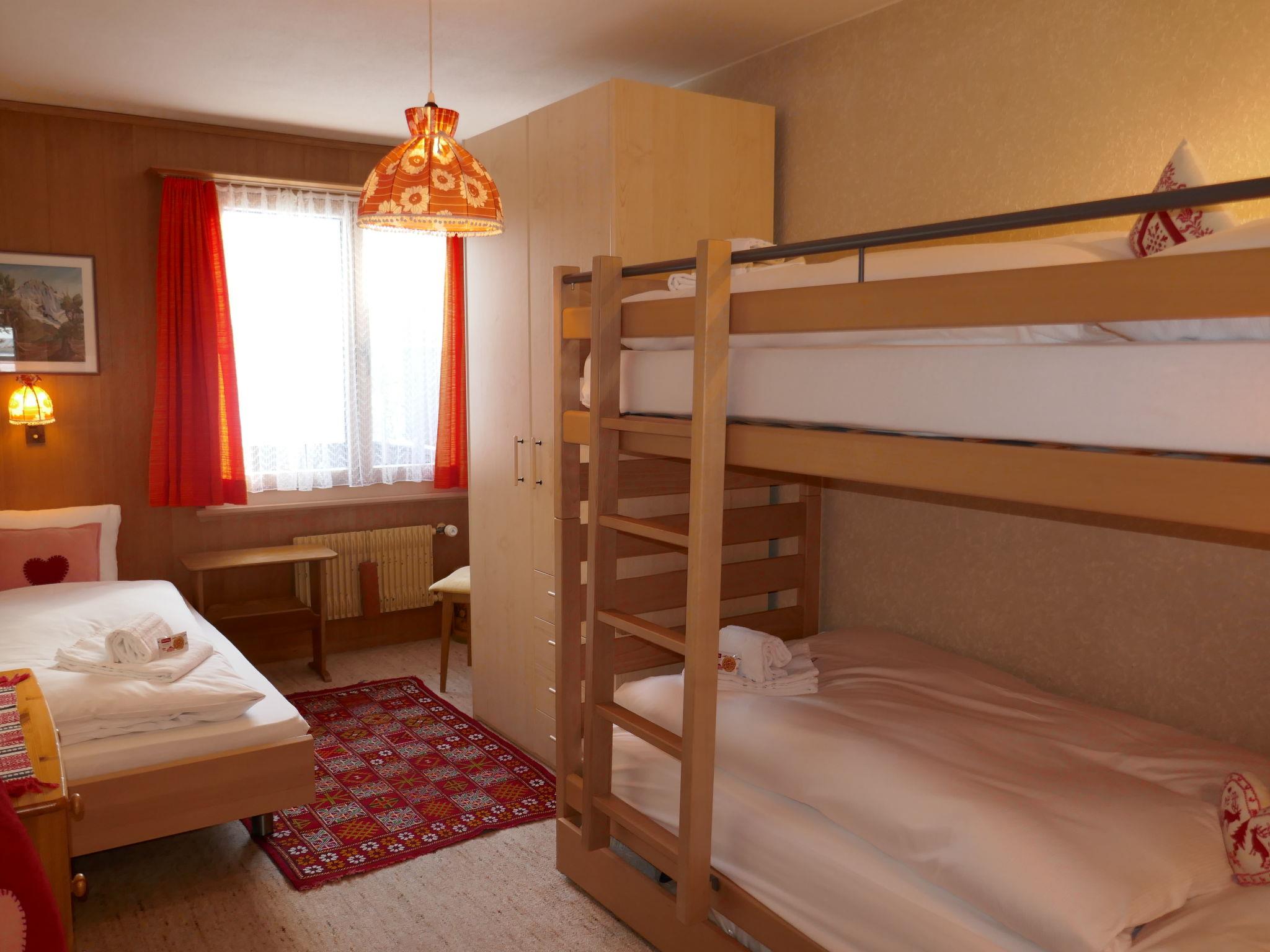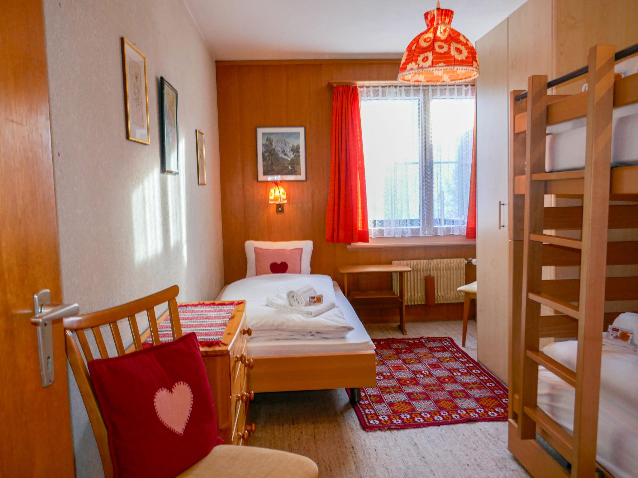 3-room apartment 60 m2 on 1st floor, south facing position. Cosy furnishings: living/dining room with cable TV (flat screen), radio. Exit to the balcony, south facing position and west facing position. 1 room with 2 beds (90 cm, length 200 cm). 1 room with 1 bed (90 cm, length 200 cm), 1 x 1 bunk beds (90 cm, length 200 cm). Kitchen (oven, dishwasher, 4 ceramic glass hob hotplates, microwave, electric coffee machine, Capsules for coffee machine (Nespresso) extra, raclette grill, fondue Set (cheese)). Shower/WC. Large balcony 10 m2. Marvellous view of the mountains, the valley and Eiger. Facilities: hair dryer. Internet (WiFi, free). Parking space n 5, ganz rechts. Please note: non-smokers only.