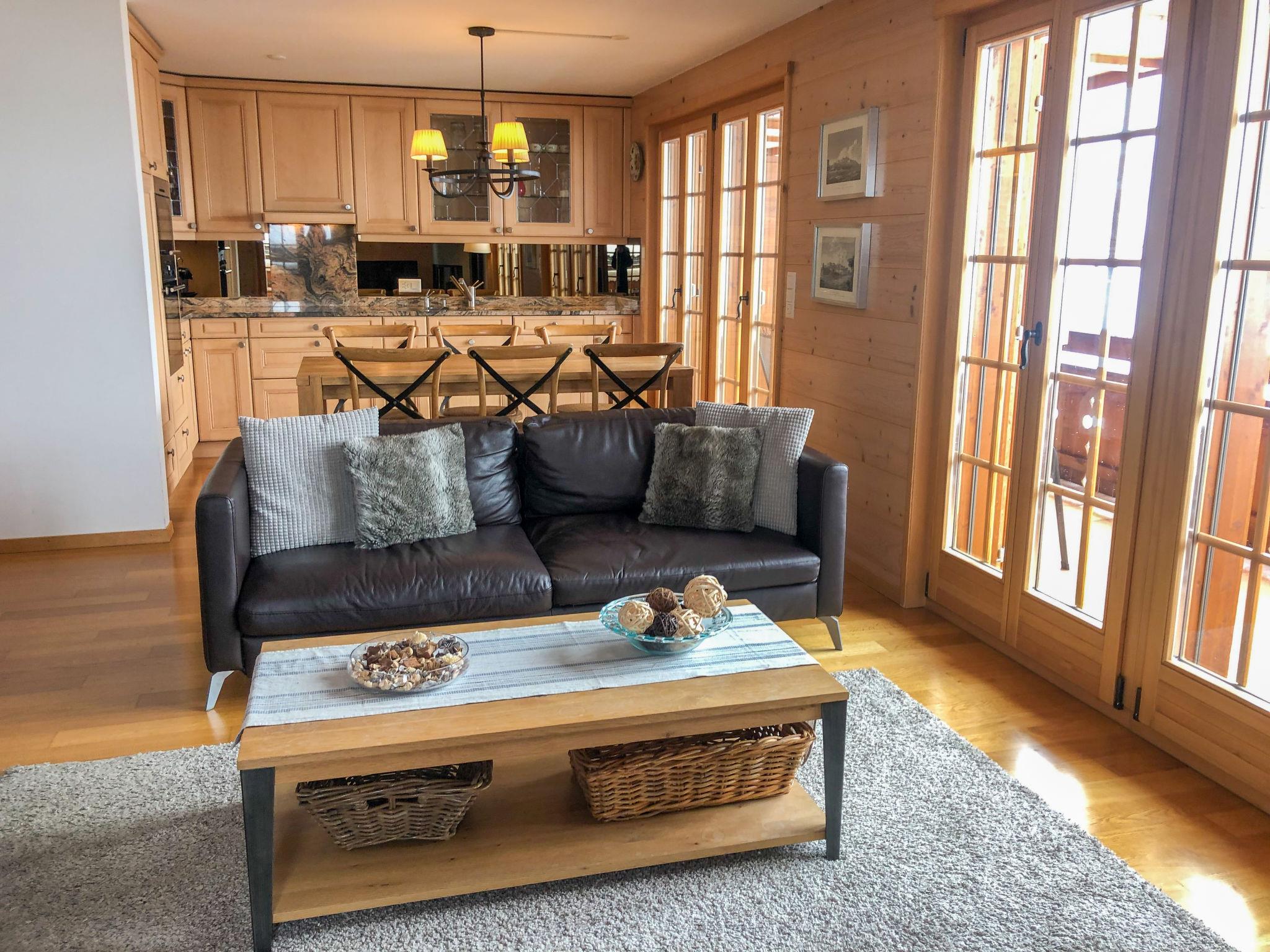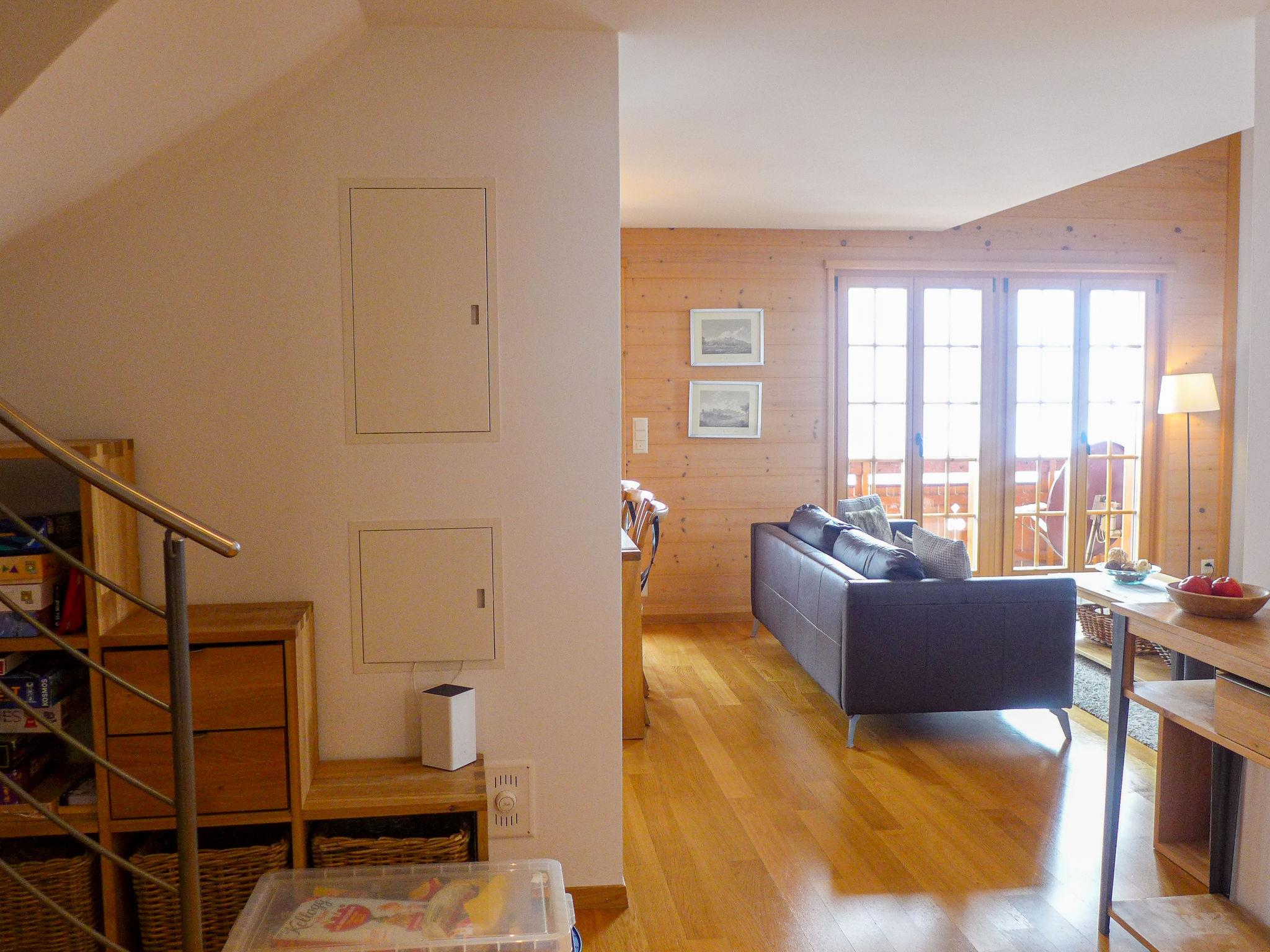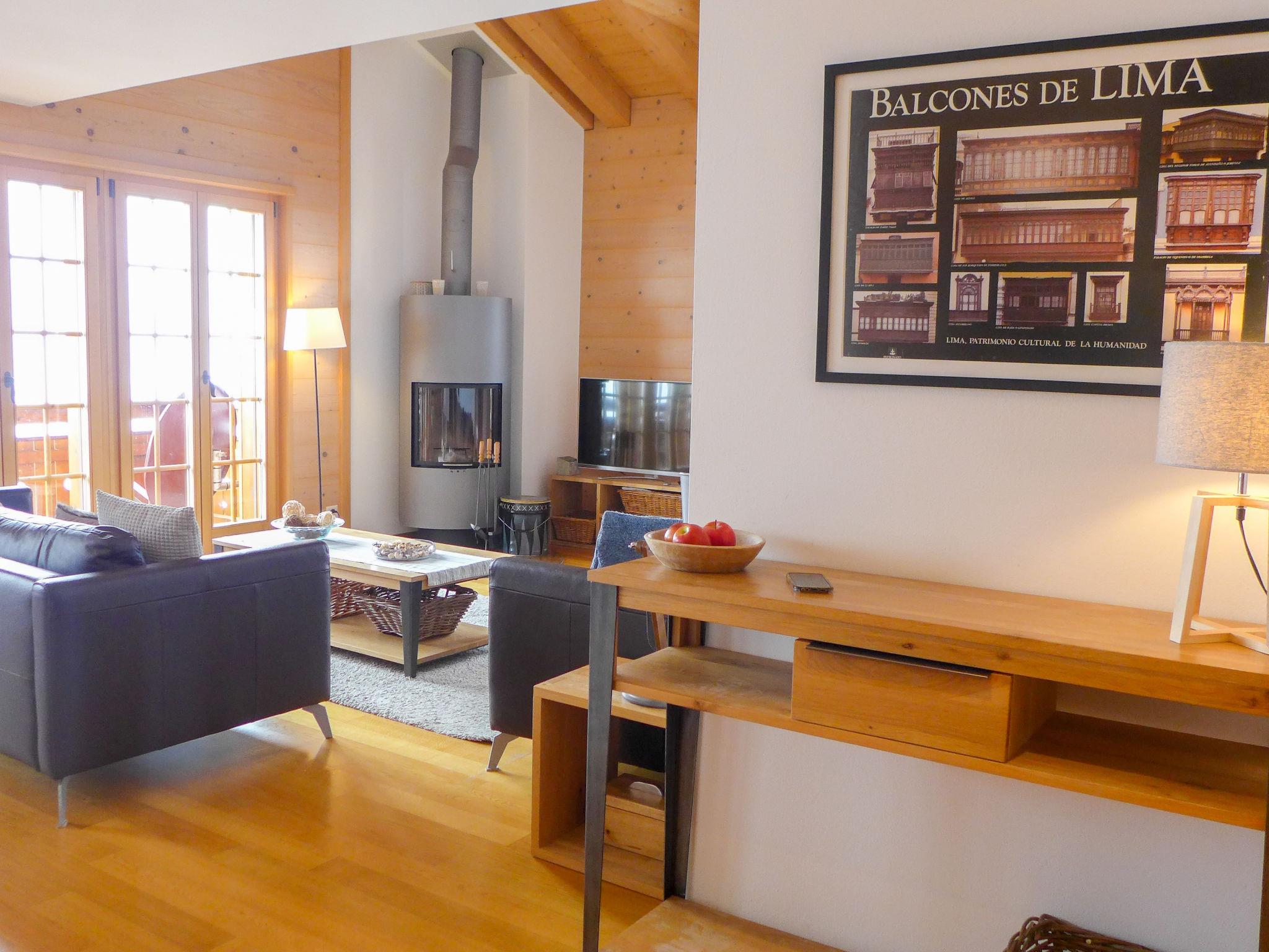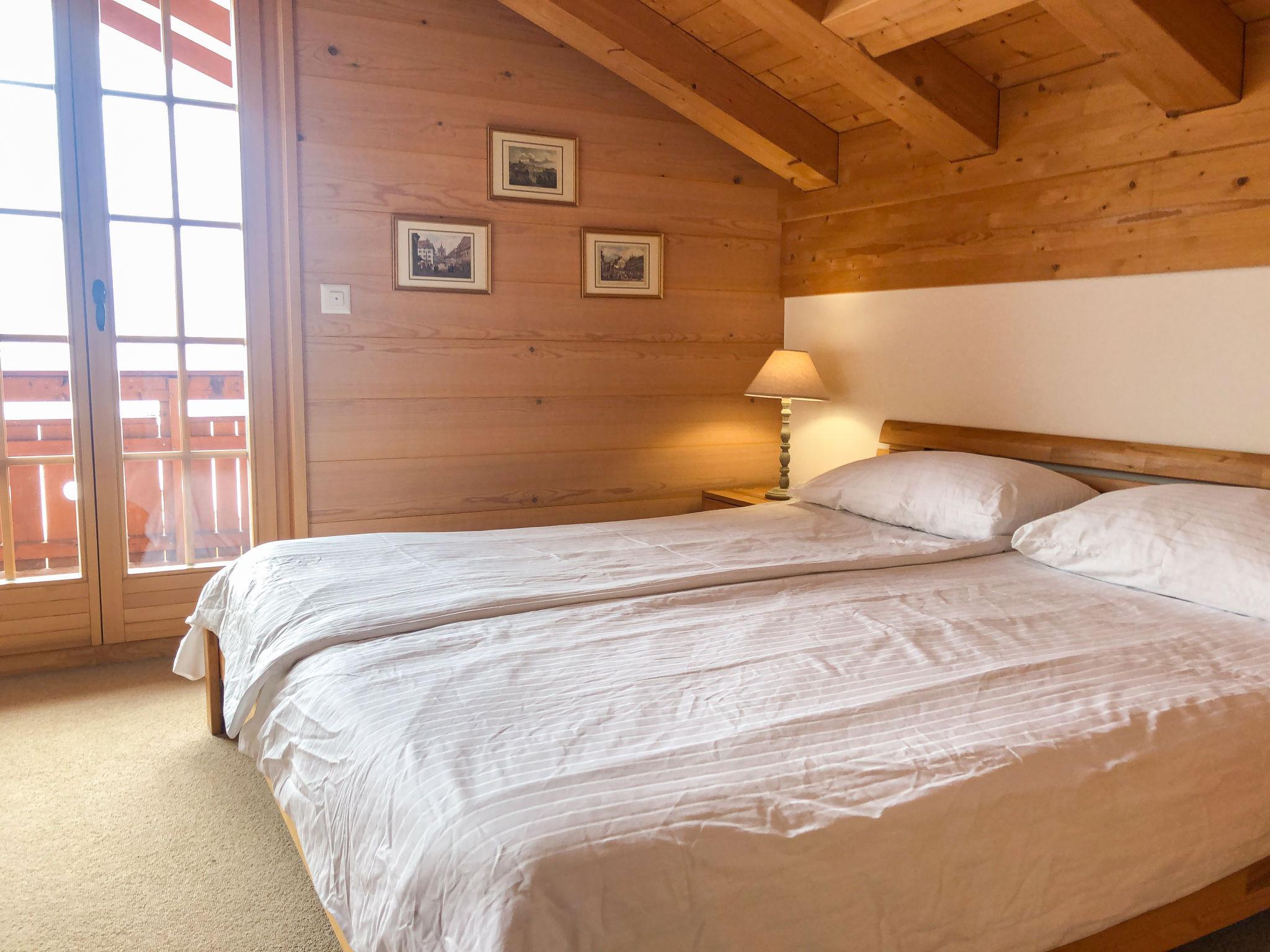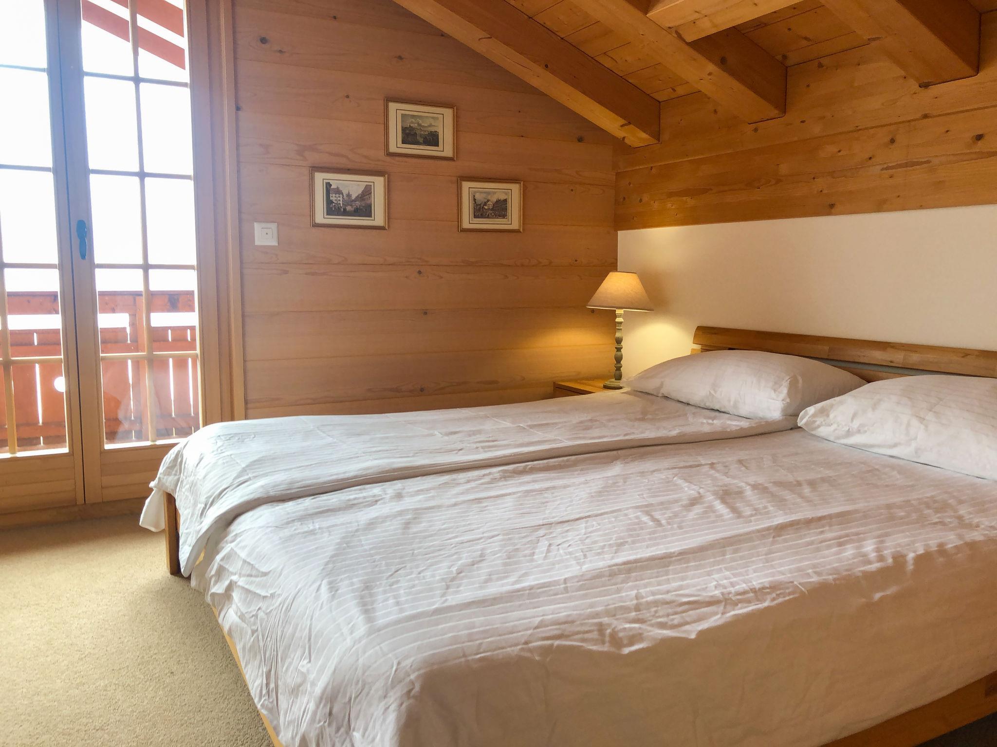 4-room apartment 119 m2 on 1st floor, south facing position. Comfortable and cosy furnishings: living/dining room with Scandinavian wood stove and digital TV. Exit to the balcony, south facing position and west facing position. 1 room with 1 double bed (2 x 90 cm, length 200 cm). Exit to the balcony, west facing position. Open kitchen (dishwasher, 4 ceramic glass hob hotplates, toaster, kettle, microwave, electric coffee machine, Capsules for coffee machine (Nespresso) extra, raclette grill, fondue Set (cheese)). Shower/WC. Upper floor: 1 room with 1 double bed (2 x 90 cm, length 200 cm), bath/WC. Exit to the balcony, south facing position. 1 room with 2 beds (90 cm, length 200 cm), shower/WC. Parquet floors, carpet. Marvellous panoramic view of the mountains and Eiger. Facilities: iron, baby cot for up to 3 year olds, logs (extra). Internet (WiFi, free). Parking (1 car), garage space n 15. Please note: non-smokers only. Private entrance, fire extinguisher.