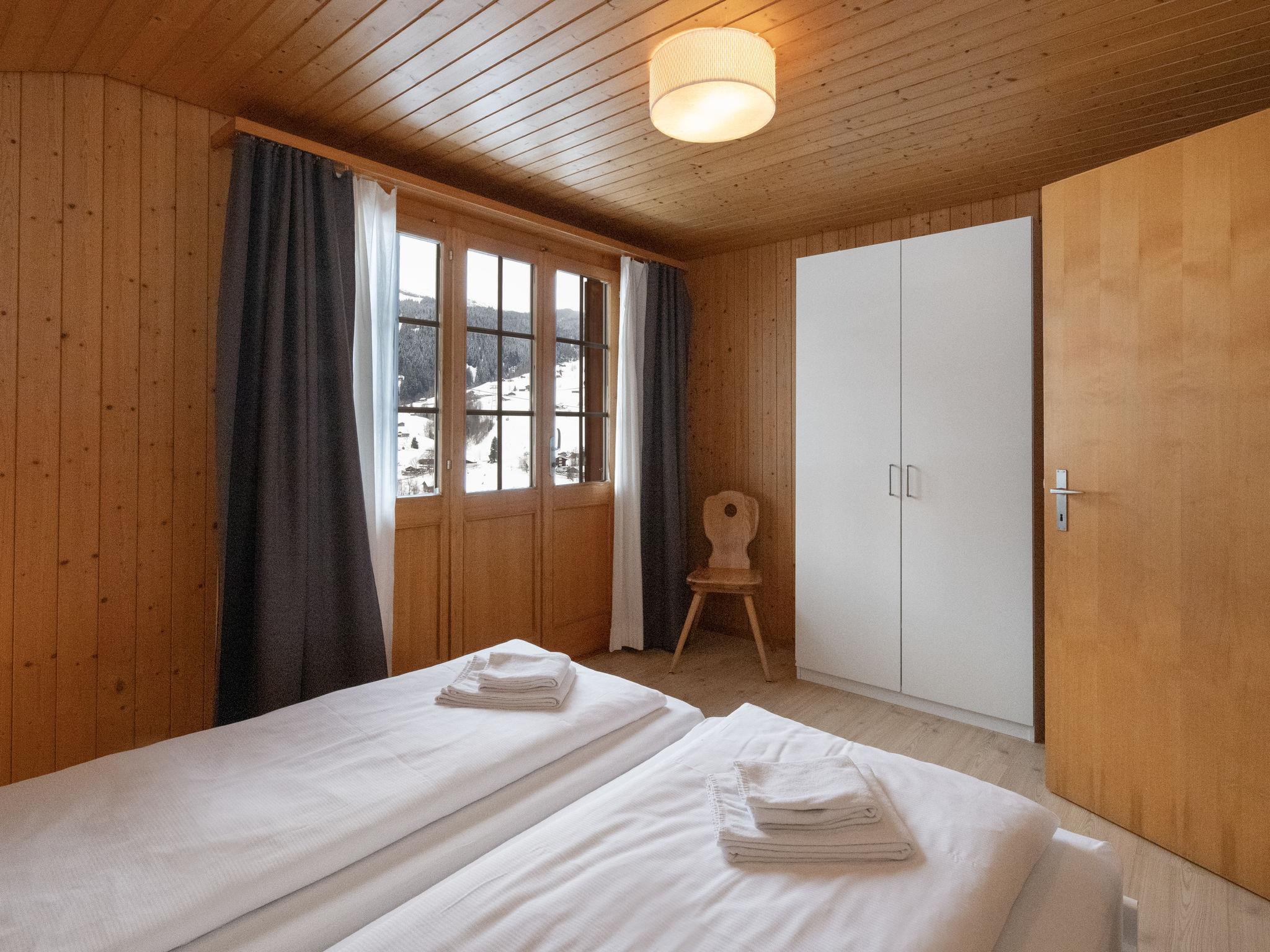 4-room chalet 110 m2 on 2 levels, south facing position. Renovated in 2014, cosy furnishings: living/dining room with Scandinavian wood stove and satellite TV (flat screen), radio, CD-player and DVD. Exit to the patio, south facing position. Open kitchen 8 m2 (oven, dishwasher, 4 ceramic glass hob hotplates, microwave, electric coffee machine, Capsules for coffee machine (Nespresso) extra, fondue Set (cheese)). Exit to the patio, south facing position and west facing position. Shower/WC. Floor heating. Upper floor: 2 rooms, each room with 2 beds (90 cm, length 200 cm). Exit to the balcony, south facing position. 1 room with 2 beds (90 cm, length 200 cm). Bath/WC. Floor heating. Parquet floors, natural stone floors. Balcony, south facing position and west facing position, patio, south facing position. Terrace furniture, barbecue. Marvellous view of the mountains and Eiger. Facilities: hair dryer. Internet (WiFi, free). Parking, garage. Please note: suitable for families. Non-smokers only. Fire extinguisher.