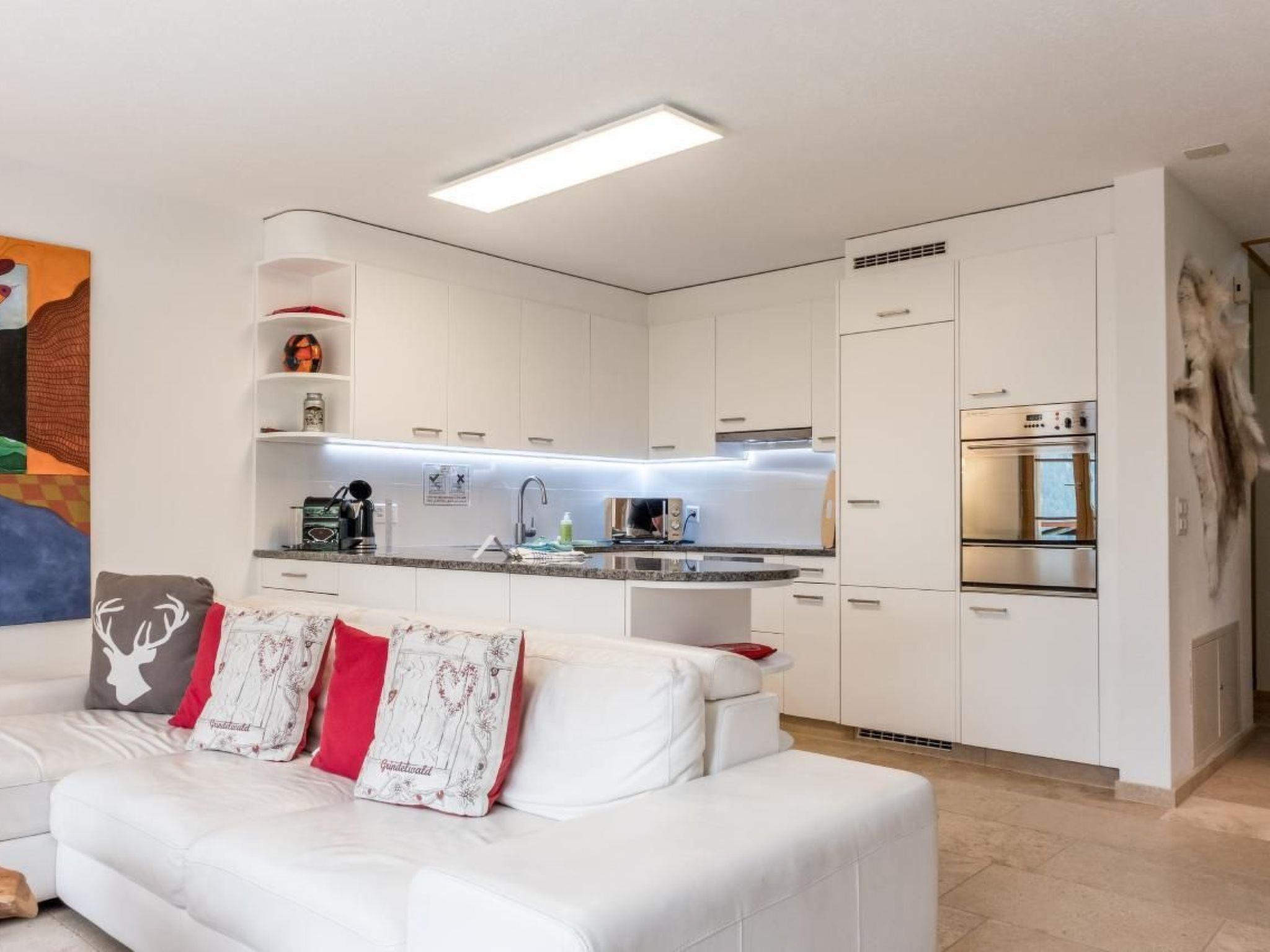 A great property for unforgettable holidays in the Alps: the modern 4.5-room penthouse flat on two floors and 113 m2 with two south-facing balconies offers unbeatable views over Grindelwald and the surrounding mountains. The Swedish stove creates a cosy atmosphere in the living/dining room with open-plan kitchen. In the flat with two bedrooms with double beds, one bedroom with bunk beds, a bathroom with bathtub and WC and a bathroom with shower and WC, there is an additional room with a cosy leather sofa that can be used as a dressing and reading room or as a children's room.