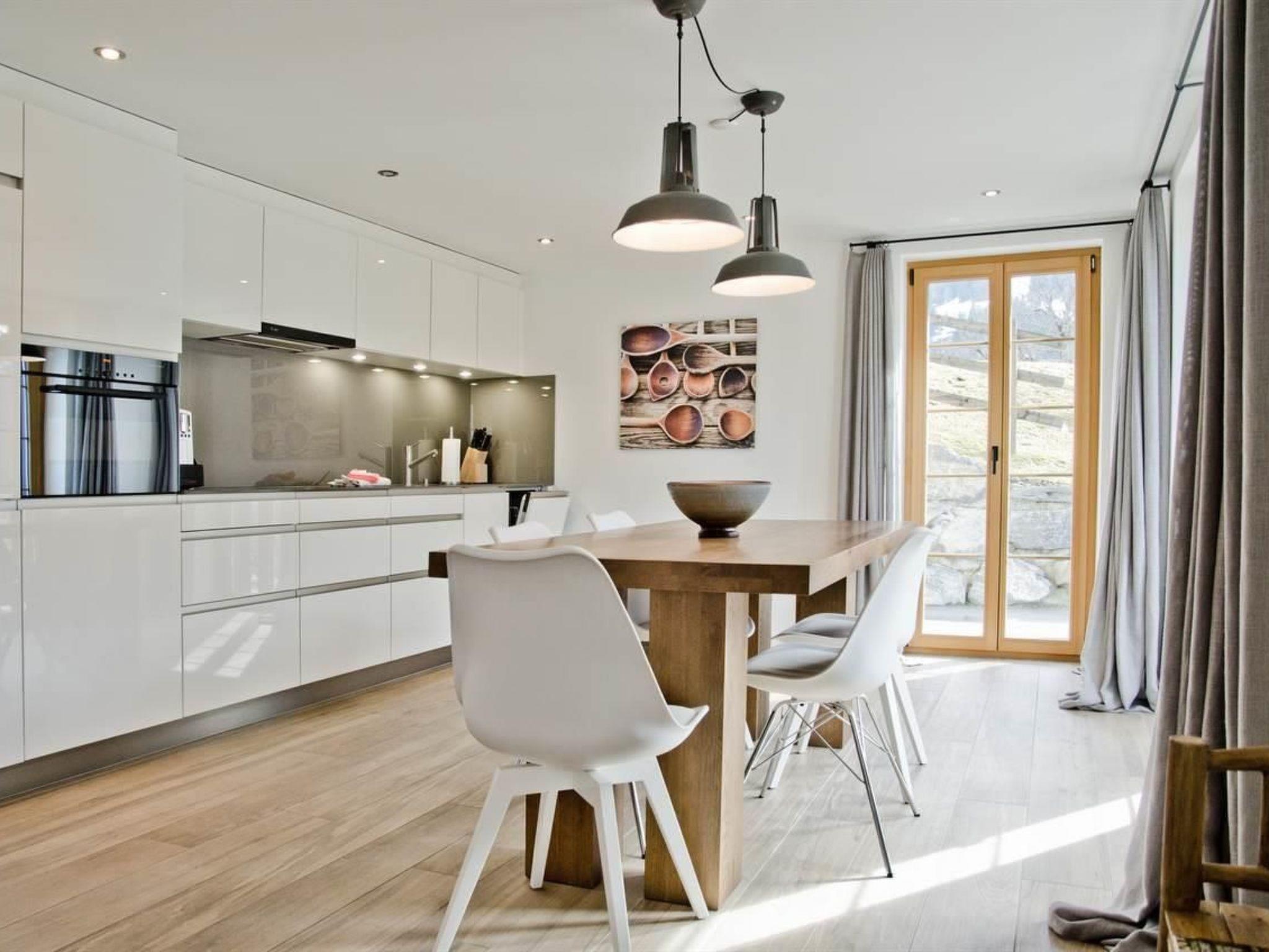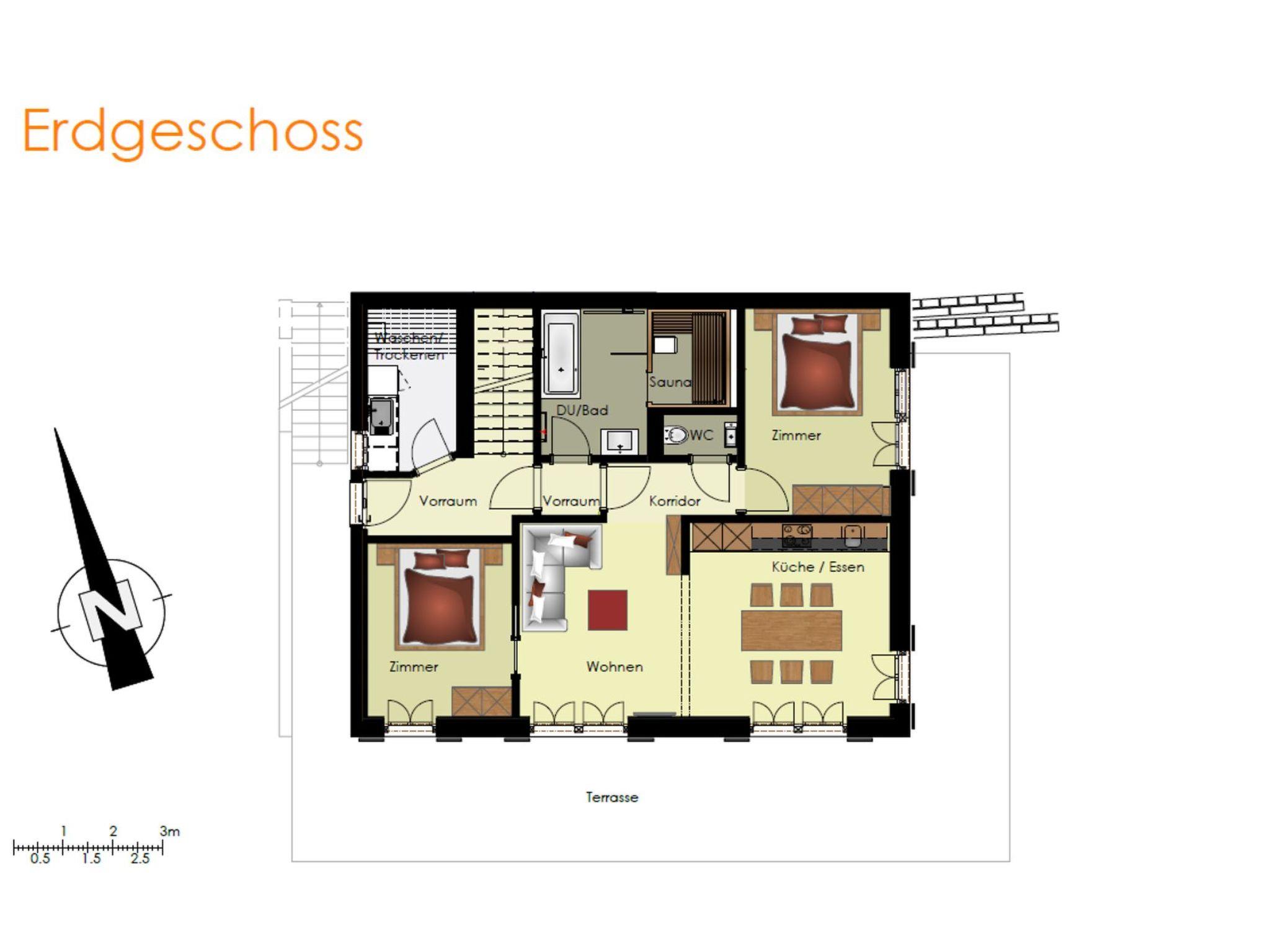 The 77m2 3.5-room apartment on the ground floor offers modern luxury. It has two bedrooms with double beds, a bathroom with bath, shower and sauna, and a separate toilet. The apartment has a modern, well-equipped kitchen with a bright, cosy dining/living area. From the terrace you can enjoy the beautiful mountain panorama.