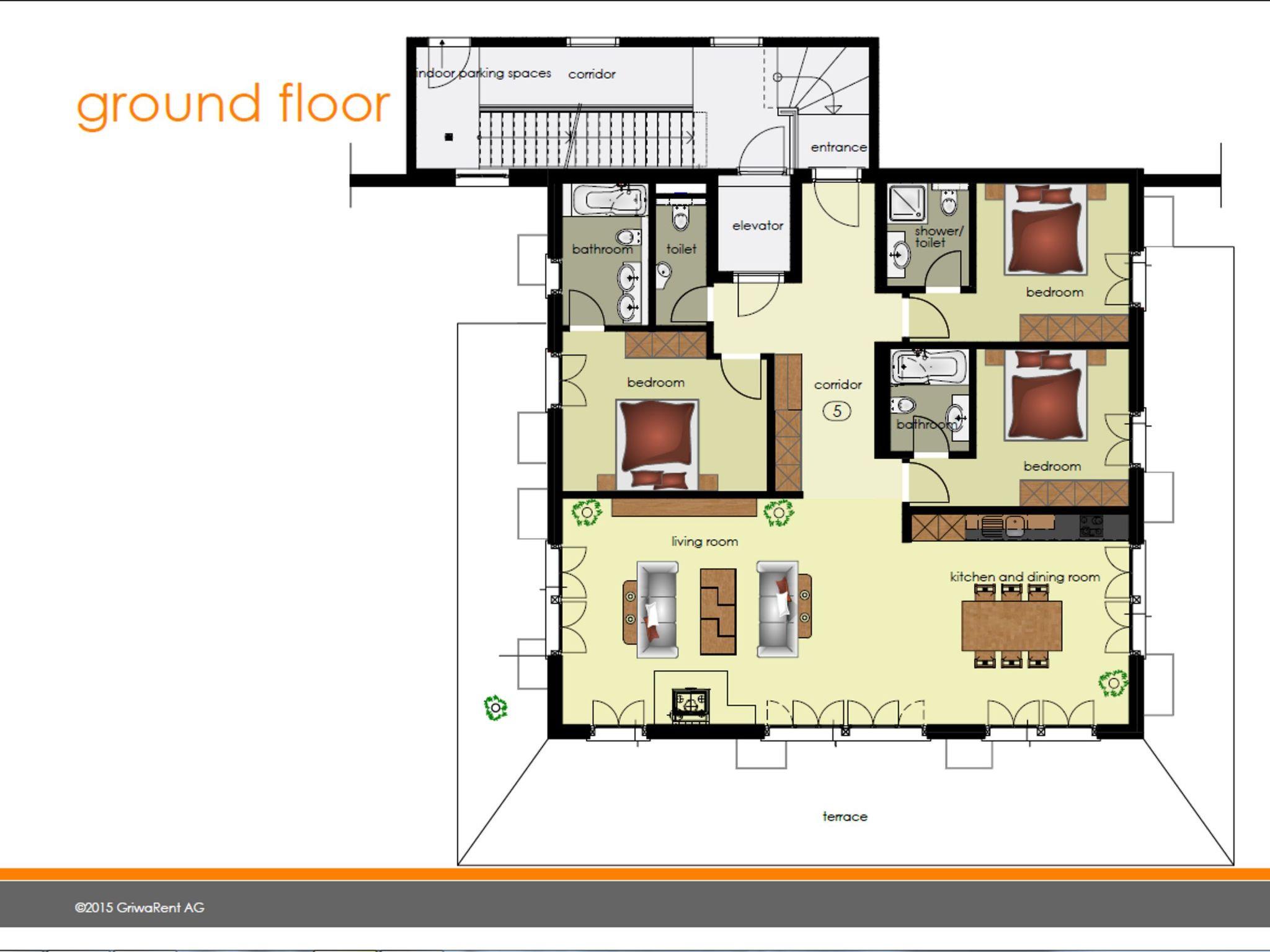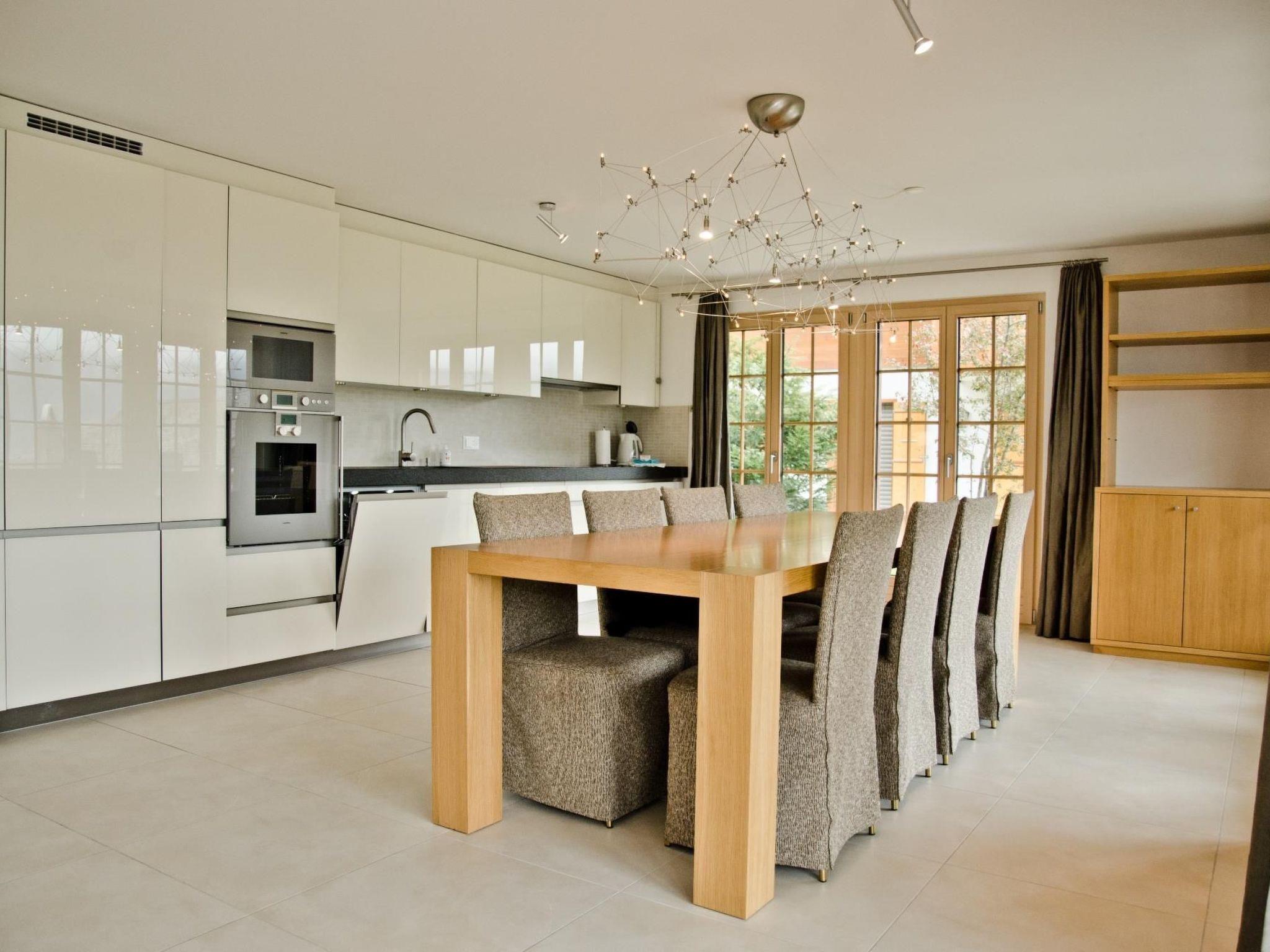 The spacious, 160m2 4.5-room flat is located on the ground floor and has one bedroom with a double bed, two bedrooms with two single beds, two en-suite bathrooms with a bathtub and WC, one en-suite bathroom with a shower and WC and a separate guest toilet. The heart of the flat is the modern, well-equipped kitchen with an open and cosy dining and living area. The large terrace invites you to relax and offers a wonderful view of the mountain panorama.